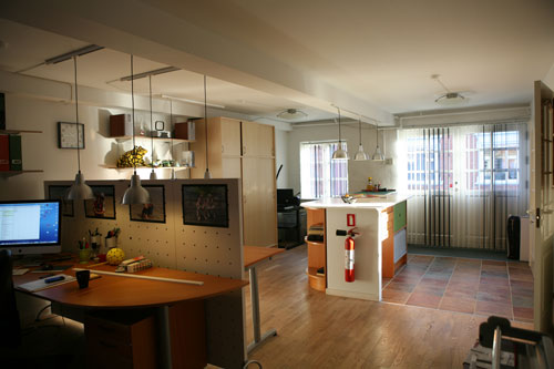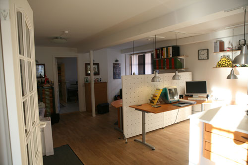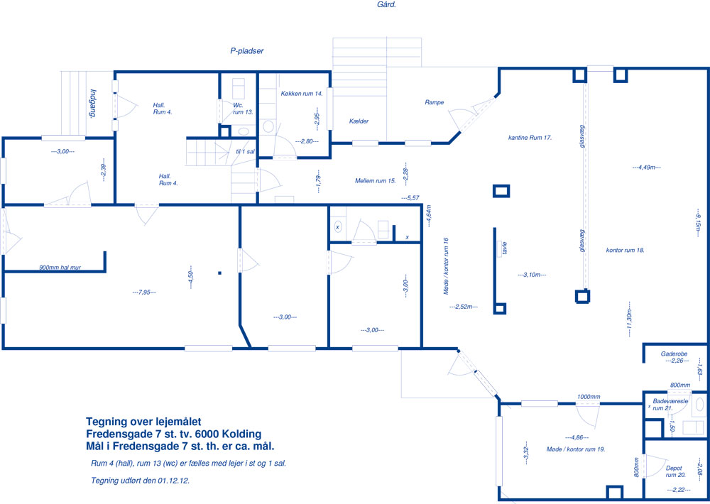 Indretning: Fra gaden går man ind i en hall. Hvor der er adgang til 3 forskellige lejemål, samt der er adgang til fælles wc. Fra hall er indgangen til kontorlokale med vinduer mod nord, der gør lokalet velegnet til EDB skærme. Fra kontor er der lille fransk altan mod øst samt der er adgang til kontor / møderum med vinduer mod syd og øst. Fra kontorlokale er der adgang til køkken med spiseplads samt vindue mod nord. Fra køkkenet er der adgang til kontor / lagerplads med vindue mod nord. Fra dette rum er der adgang til pænt badeværelse med bruser rum.