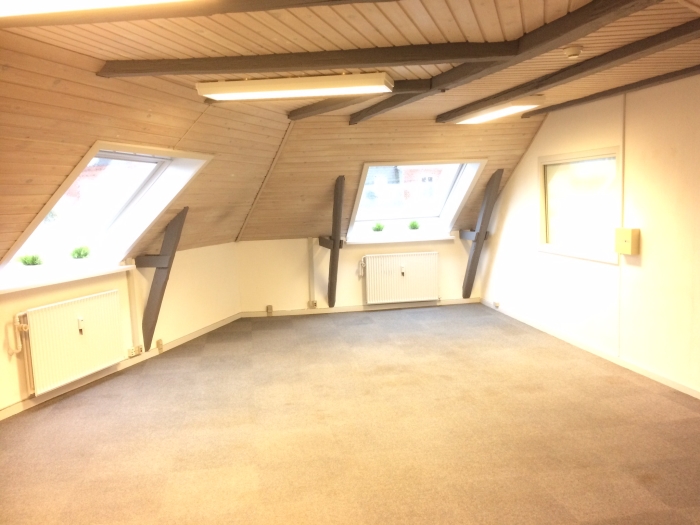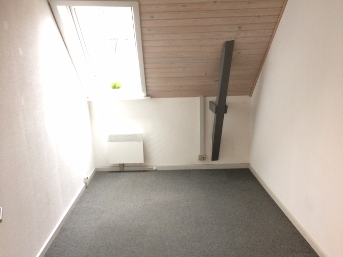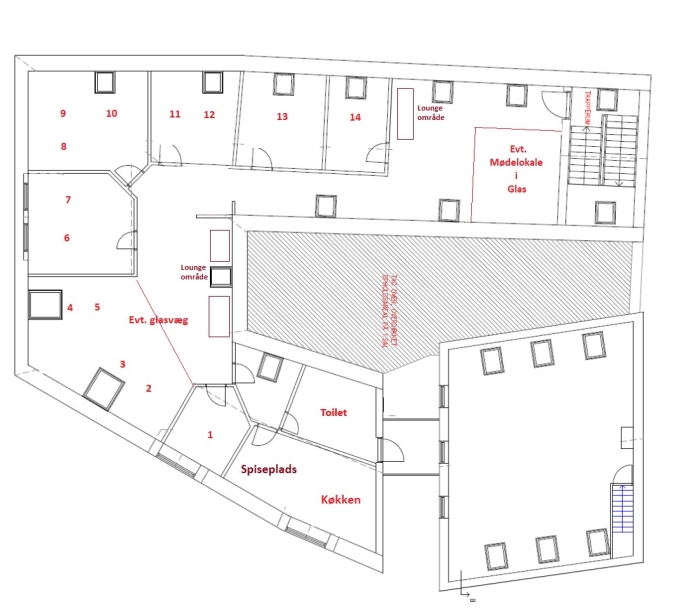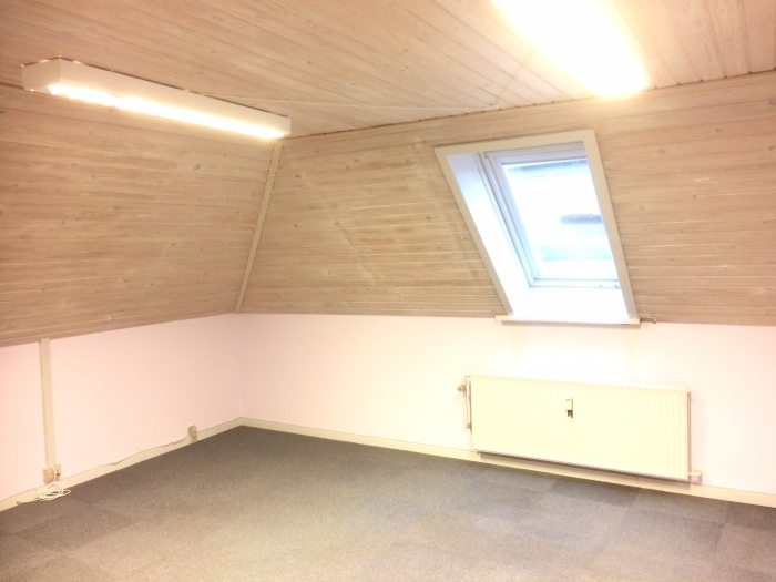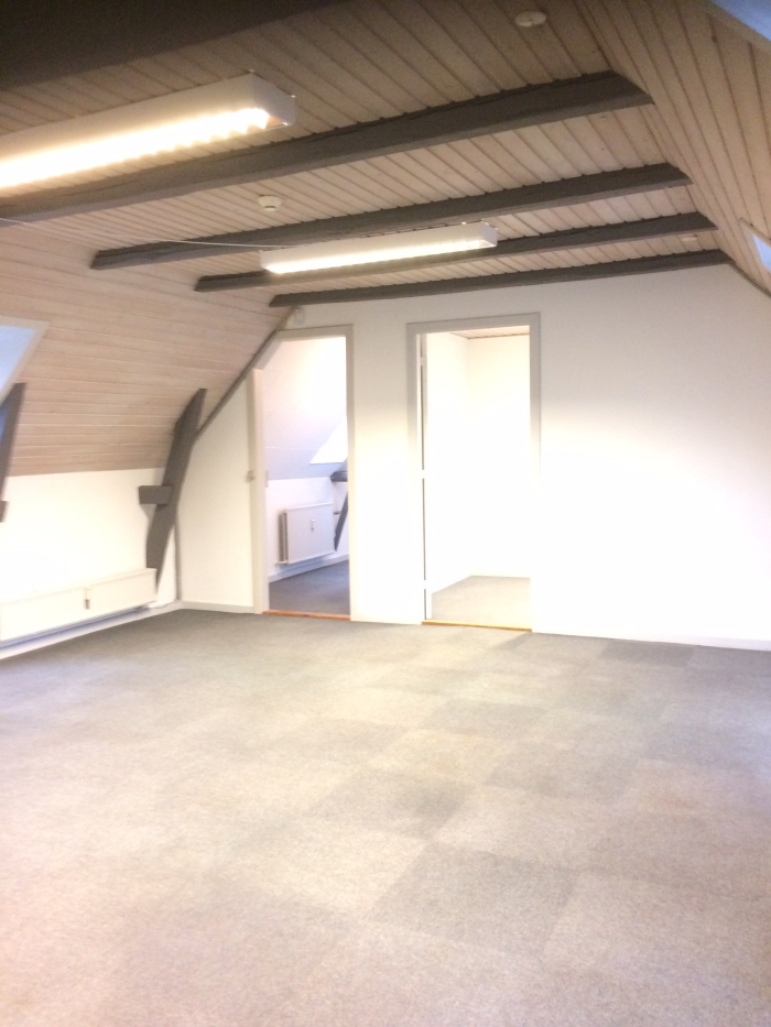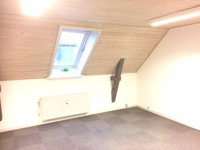 Kontorfællesskabet entréres fra præsentabelt opgangsmiljø og fremtræder generelt i tidssvarende stand med hvidmalede vægge, fritlagte bjælker og gulv belagt med tæppefliser. Fællesskabet er pt. indrettet med en blanding af enkeltmandskontorer og åbent kontorlandskab. For lejer er der adgang til te-køkken og toiletfacilitet.
