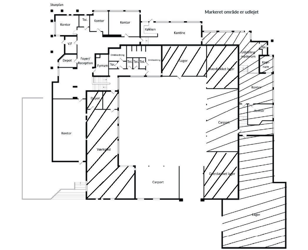Ejendommens hjerte består af flere kontor- og mødelokaler, der kan tilpasses til enhver virksomheds behov – fra det kreative kontormiljø til professionelle mødelokaler. De moderne faciliteter omfatter et fuldt udstyret køkken og kantine, samt toiletter og omklædningsrum, der giver komfort og praktisk funktionalitet for dine medarbejdere.