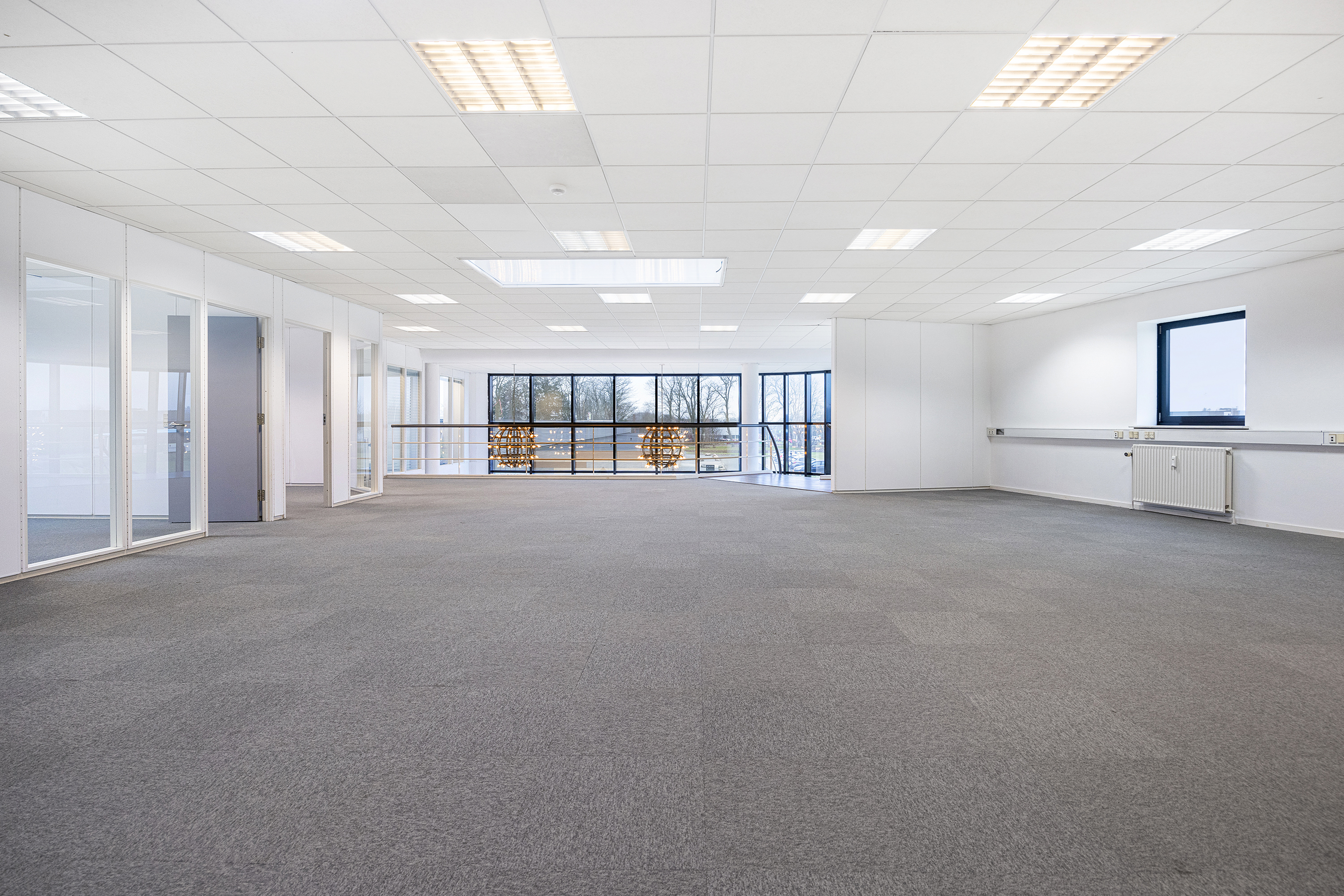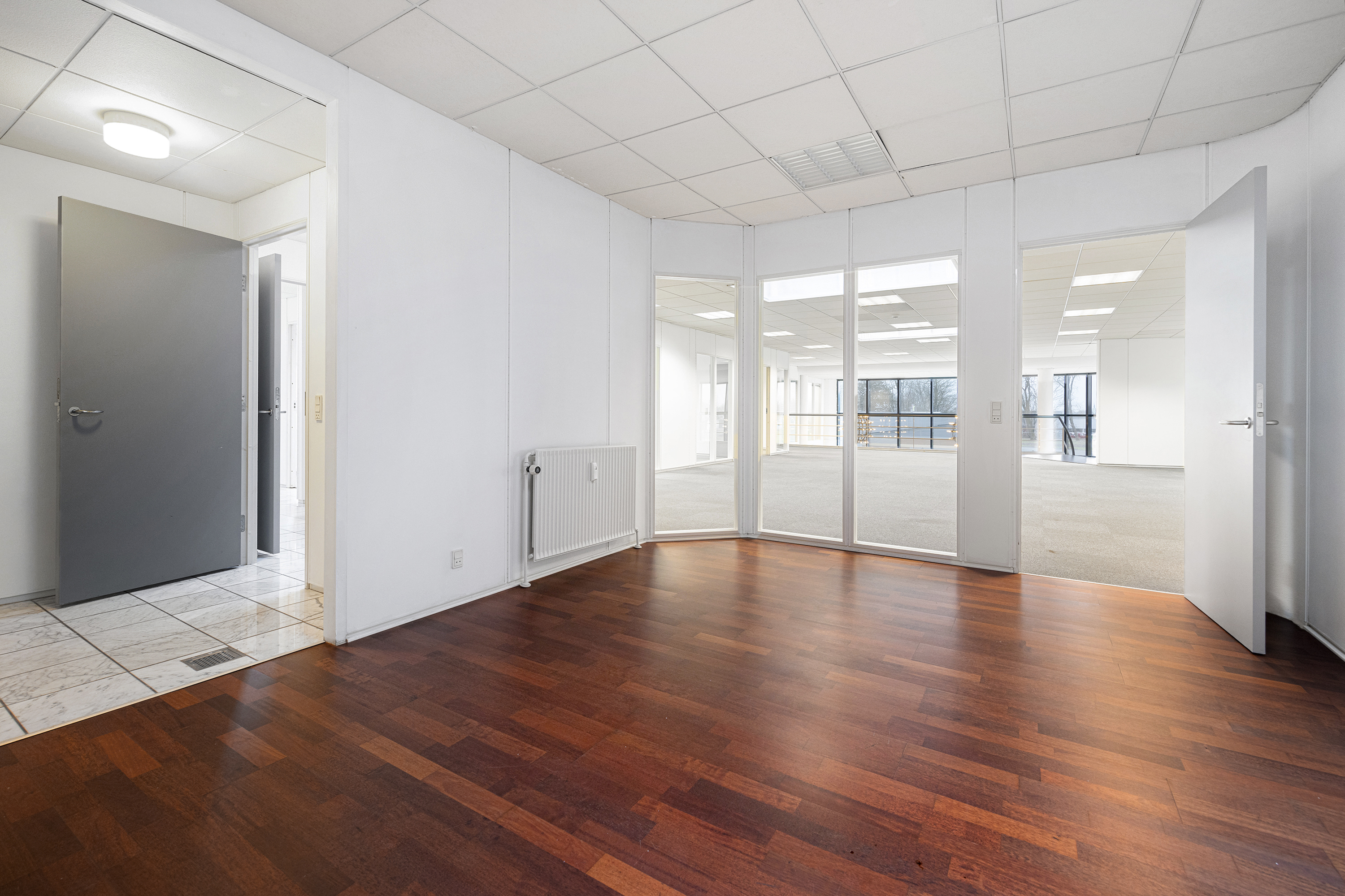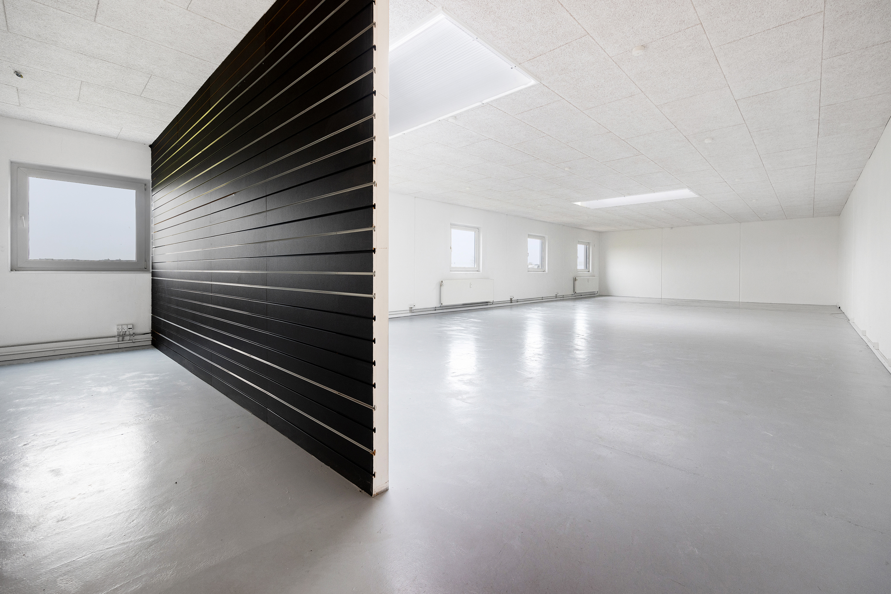 1. salen er perfekt indrettet med et åbent kontorlandskab, flere kontorer og mødelokaler i varierende størrelser, samt et stort rum, der egner sig til et fællesskab, showroom eller ekstra lager. Mulighederne er mange!