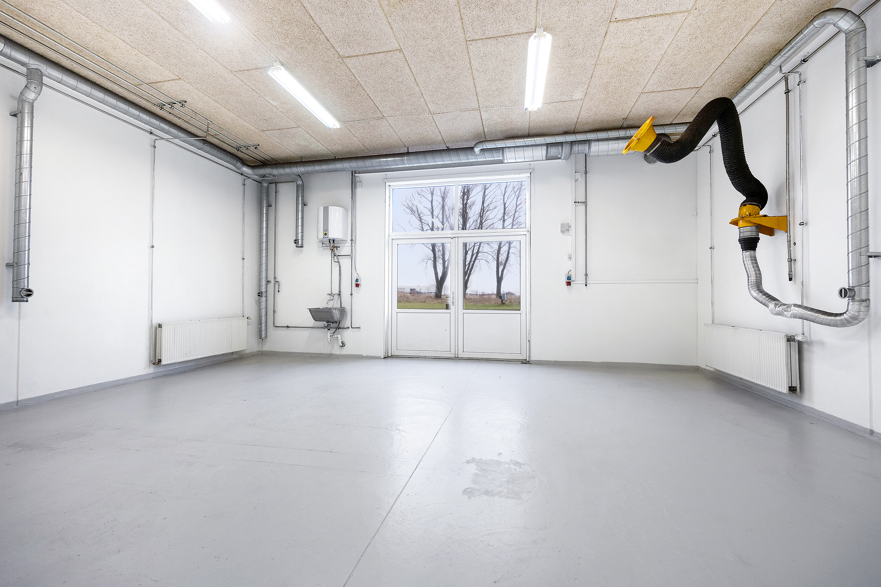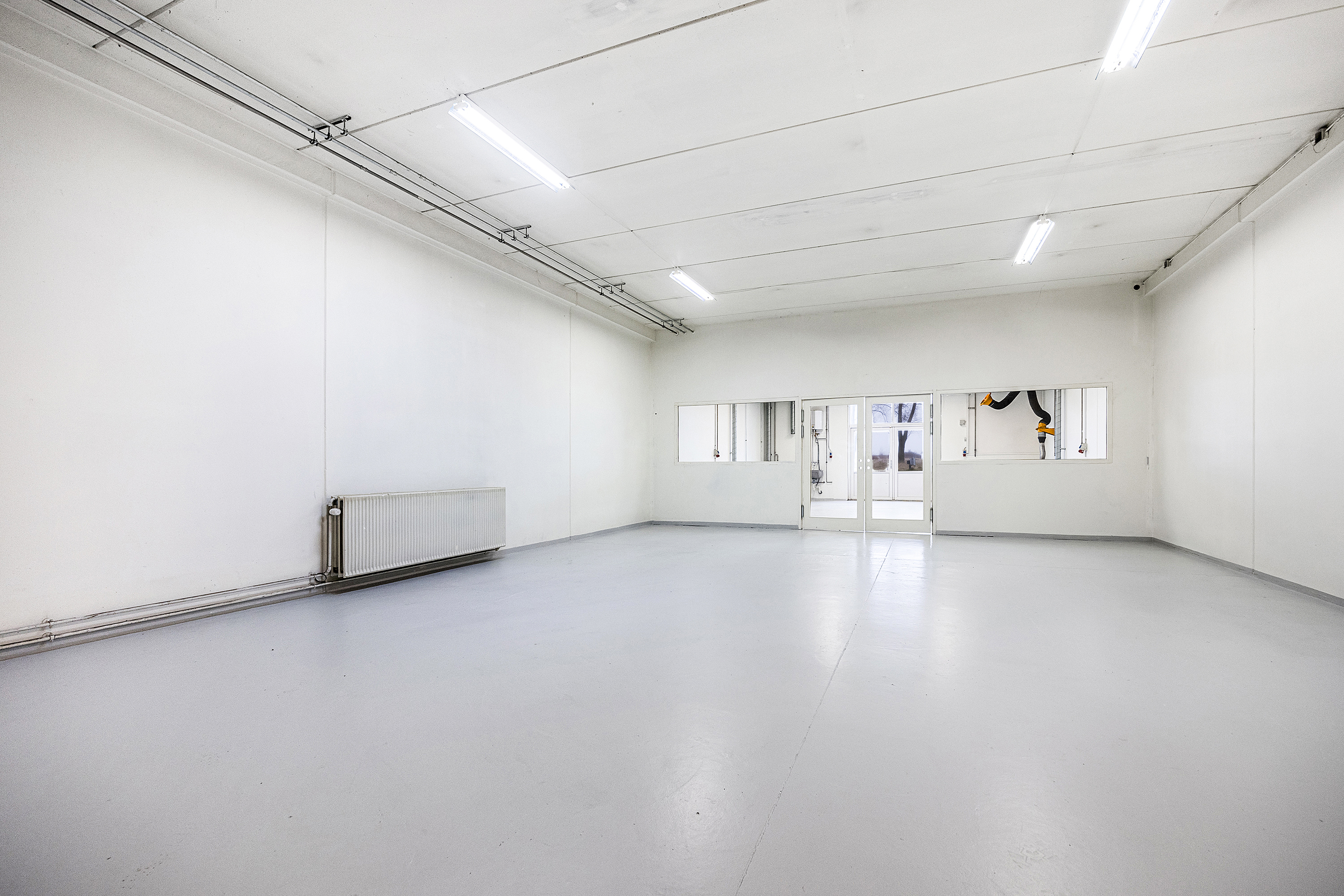 Indbydende og funktionelt – Lejemålet byder på en flot og præsentabel hall med dobbelthøjt loft, klinkegulve og masser af naturligt lys. Stueplan er indrettet med en rummelig indgang, adgang til et stort åbent kontorlandskab, en kantine og to praktiske værksteds-/lagerrum, der også kan tilgås udefra via dobbeltdør.