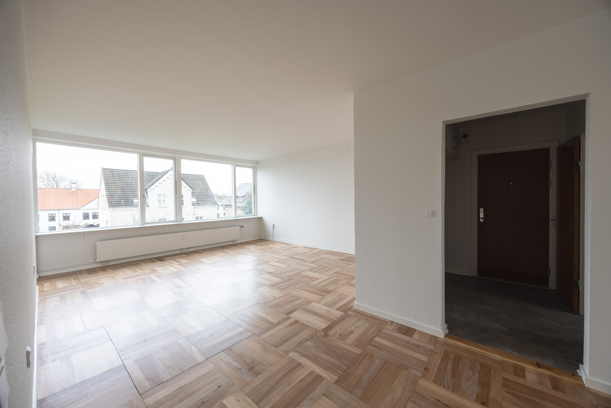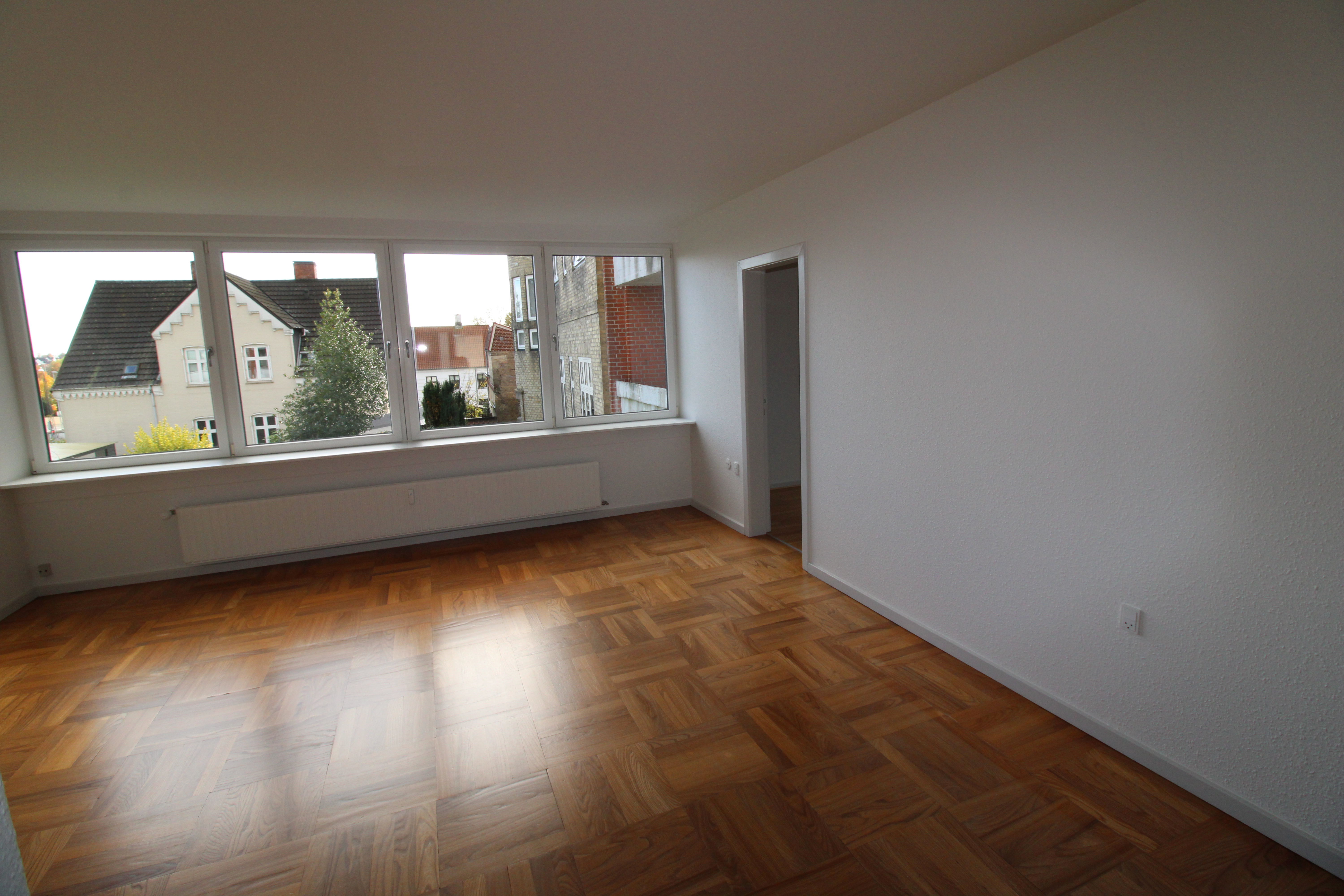 Stue med karakter: Stor, lys opholdsstue med de smukke, originale parketgulve bevaret. Herfra er der en fantastisk panoramaudsigt over både Haderslev by og Dammen.