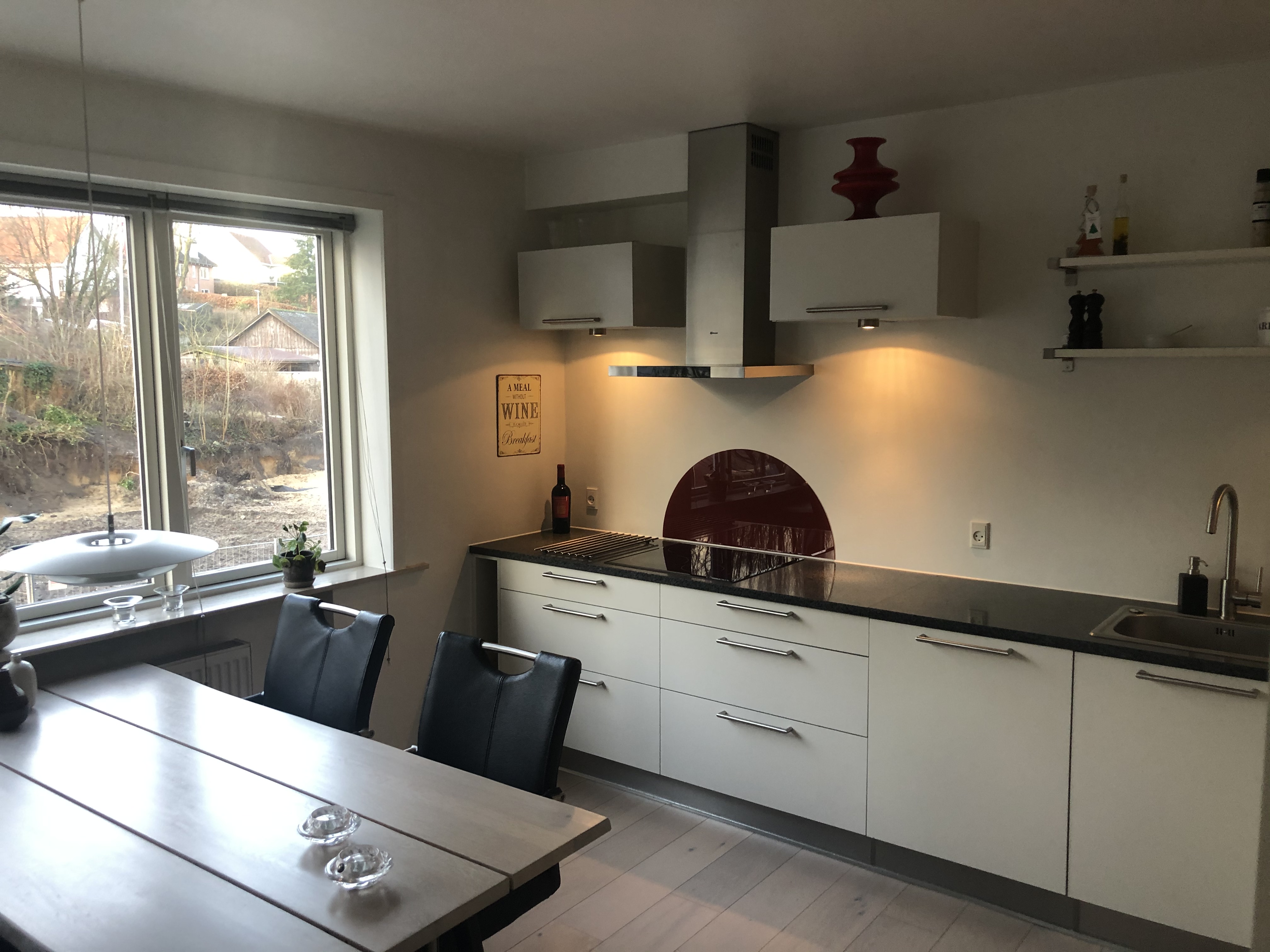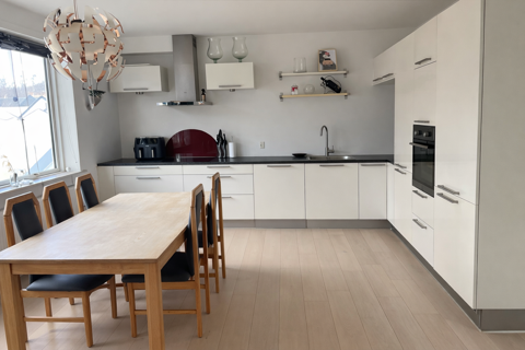 Køkkenet er rummeligtog funktionelt med god bord- og skabsplads samt indbyggede hårde hvidevarer.