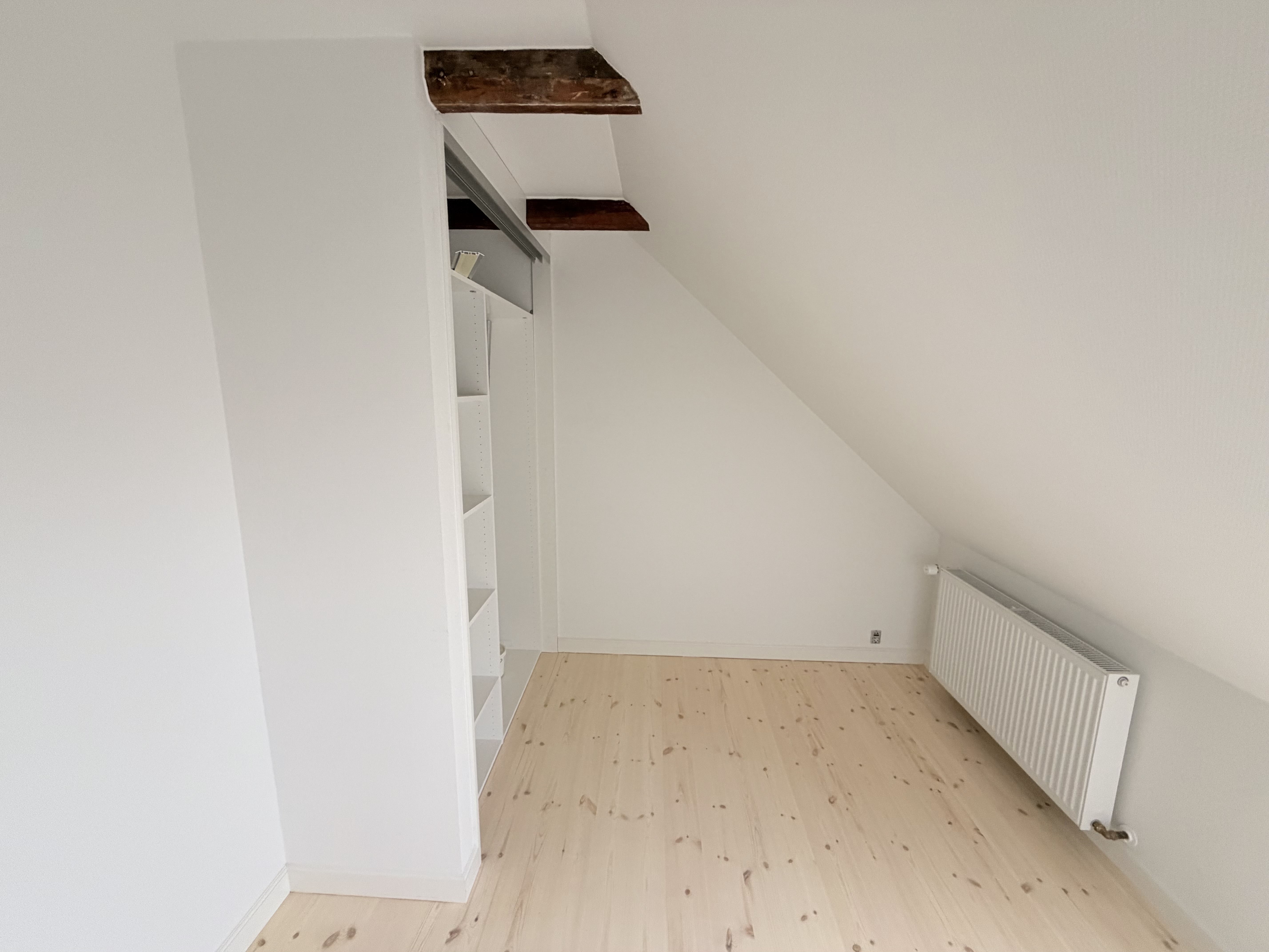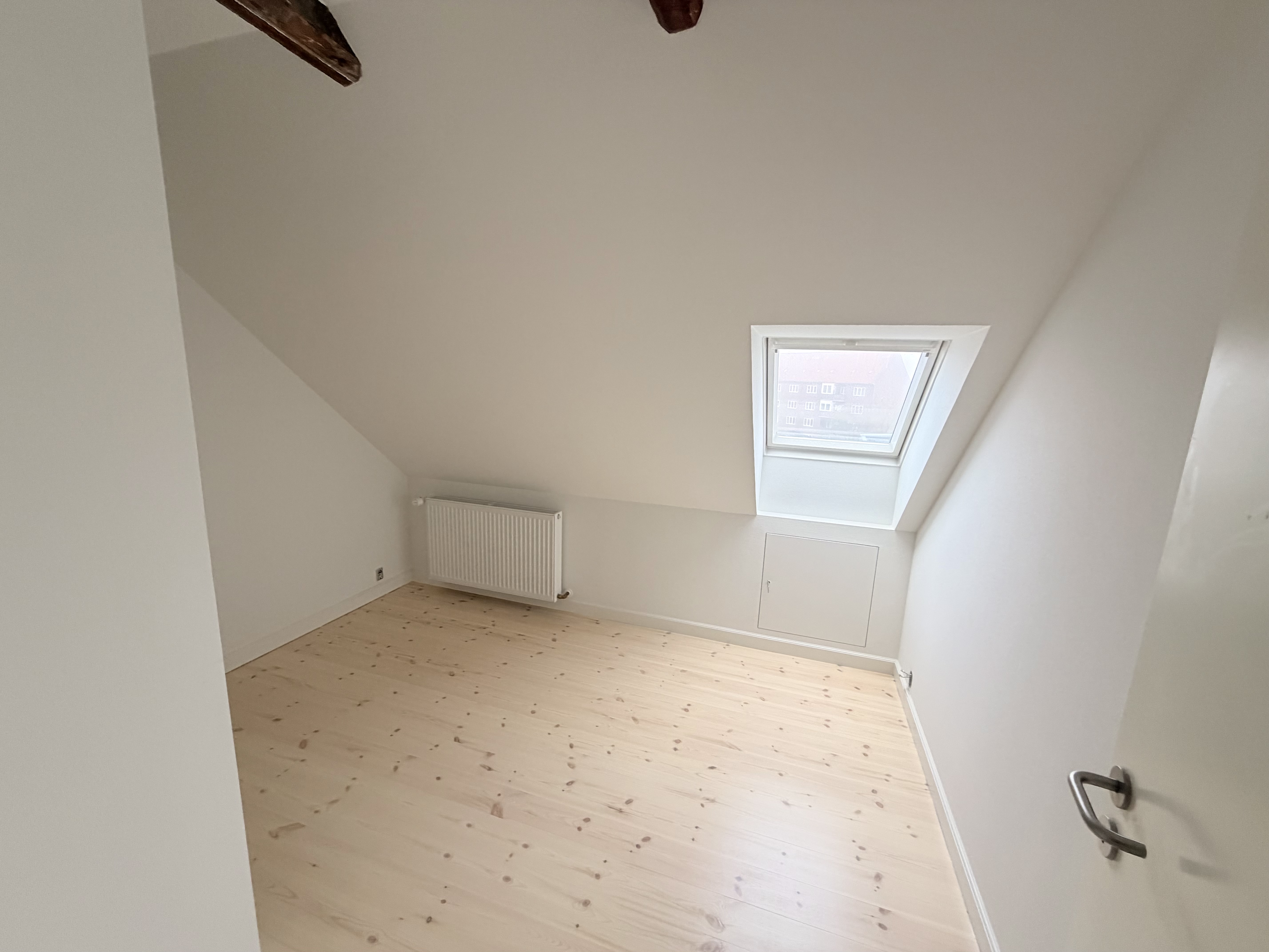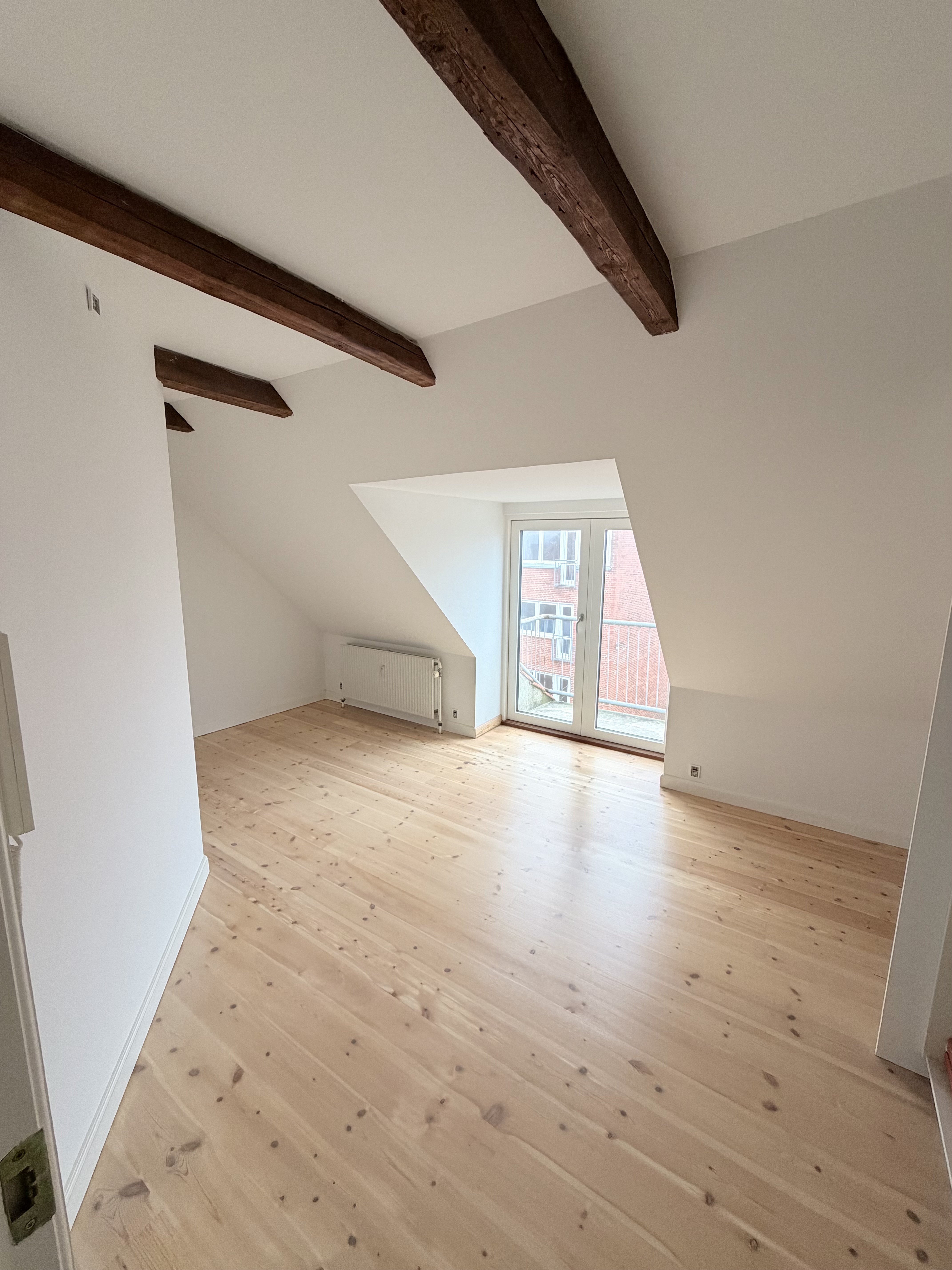 Lejligheden byder på lyse, åbne rum med loft til kip og synlige hanebånd. Perfekt til dig, der ønsker at bo centralt og med masser af plads.