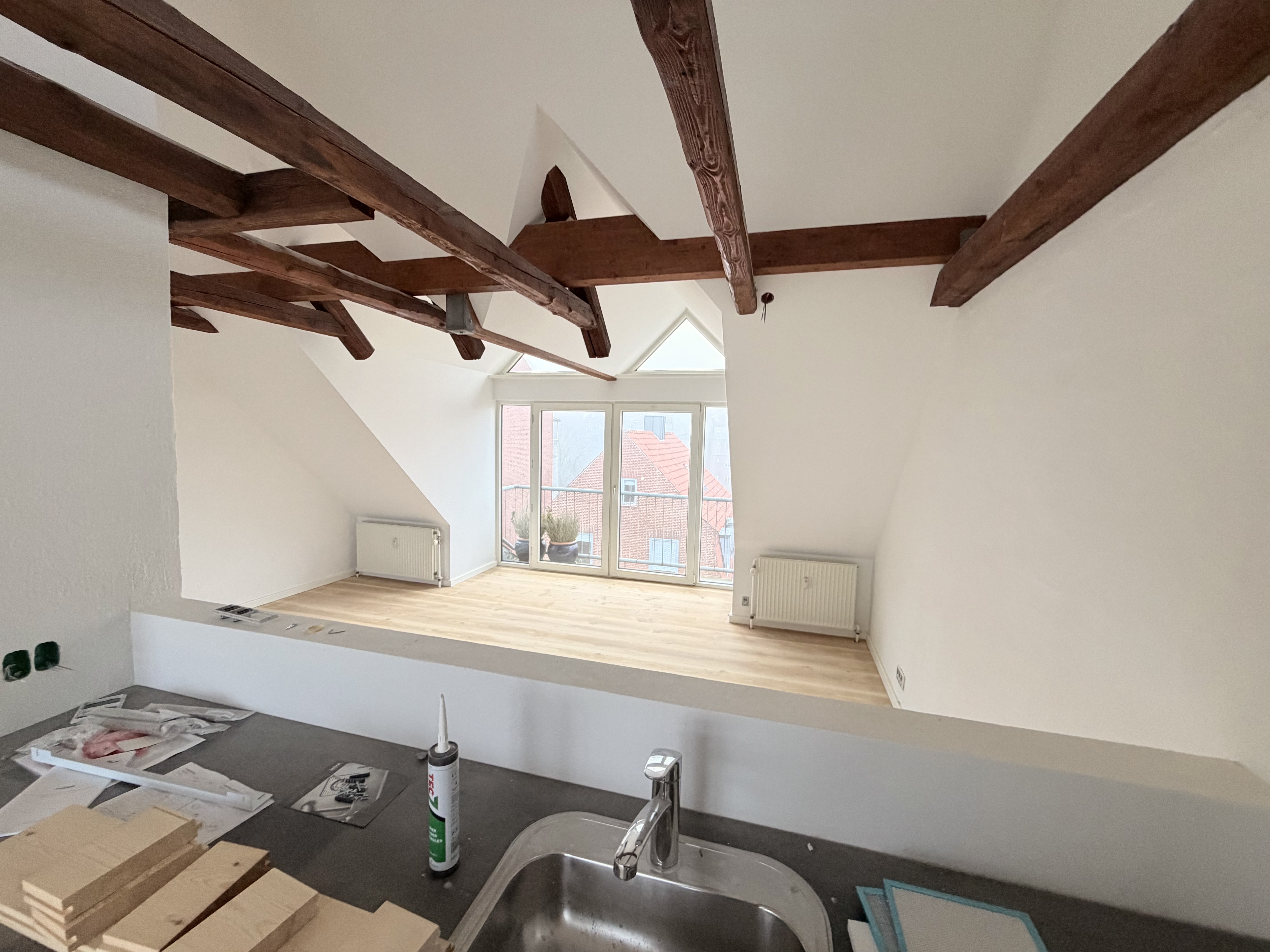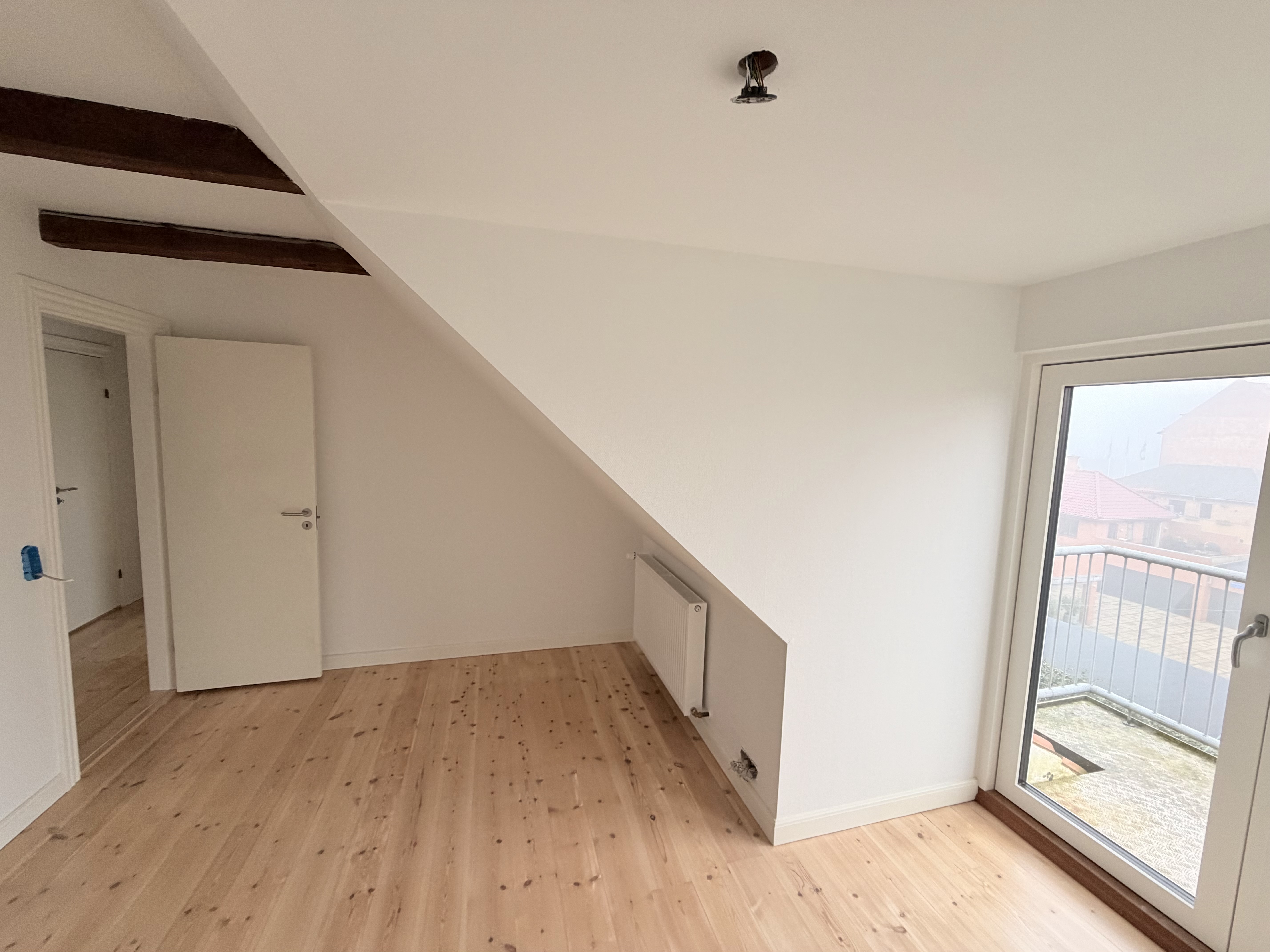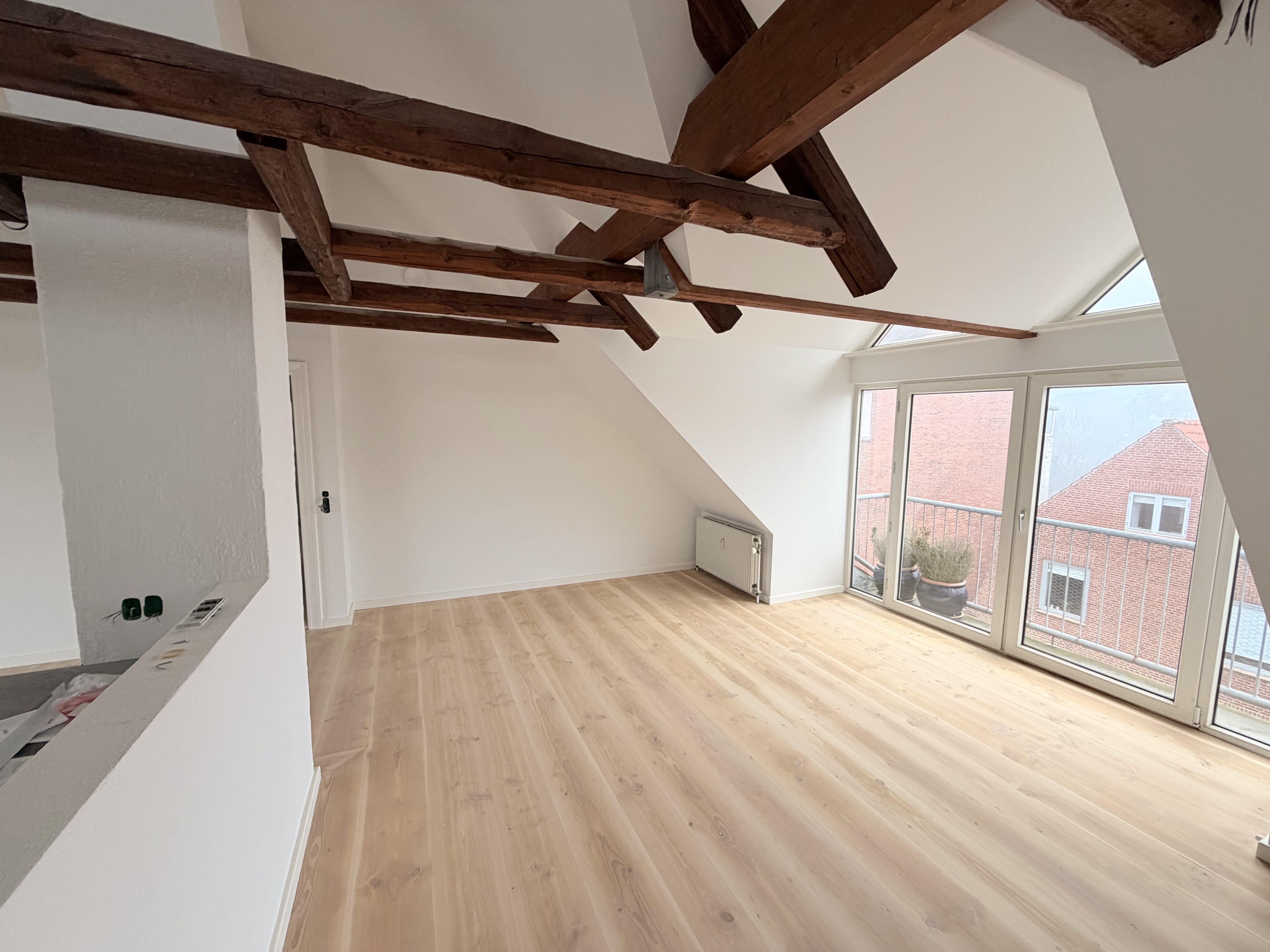 Lejligheden byder på lyse, åbne rum med loft til kip og synlige hanebånd. Perfekt til dig, der ønsker at bo centralt og med masser af plads.