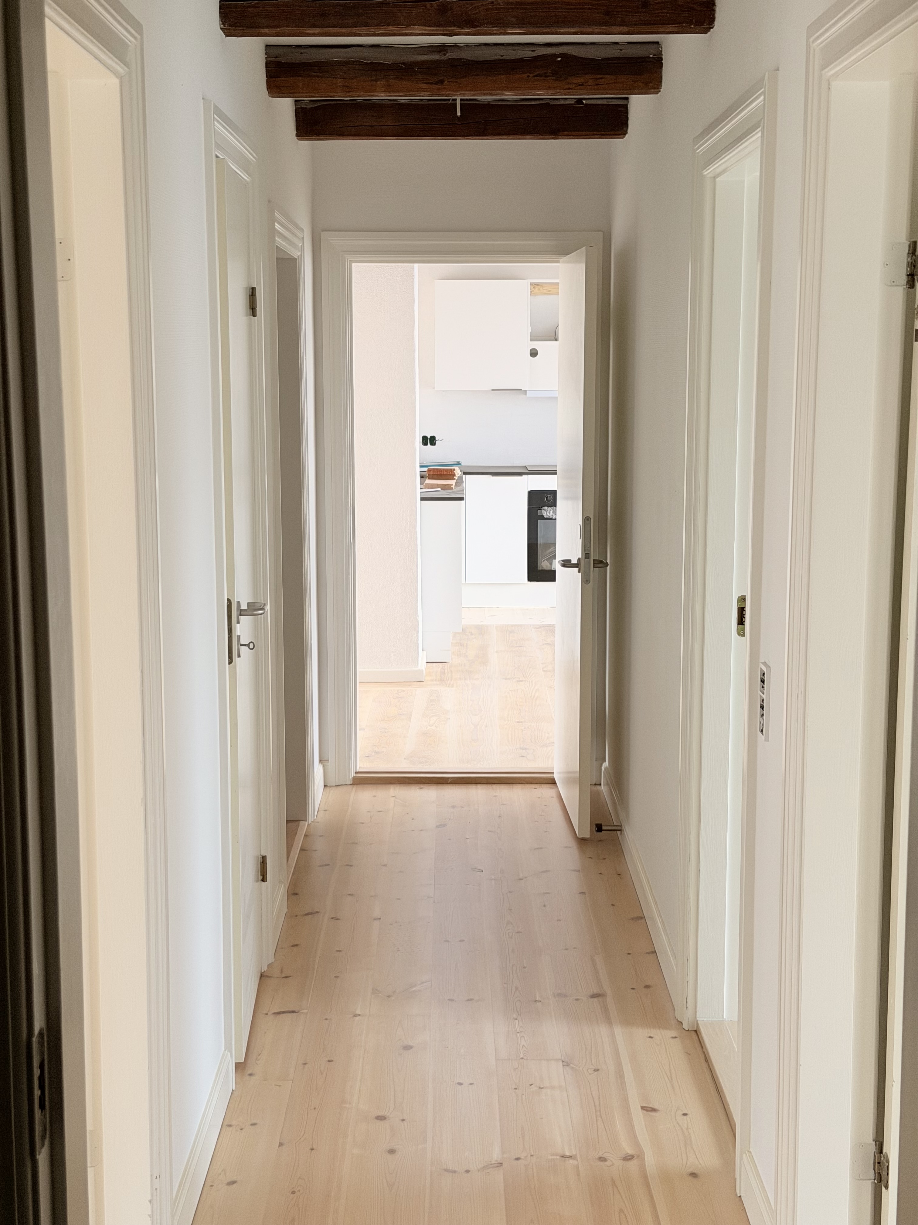 Der er massiv plankegulv gennemgørende i lejligheden og i stuen douglas planker.