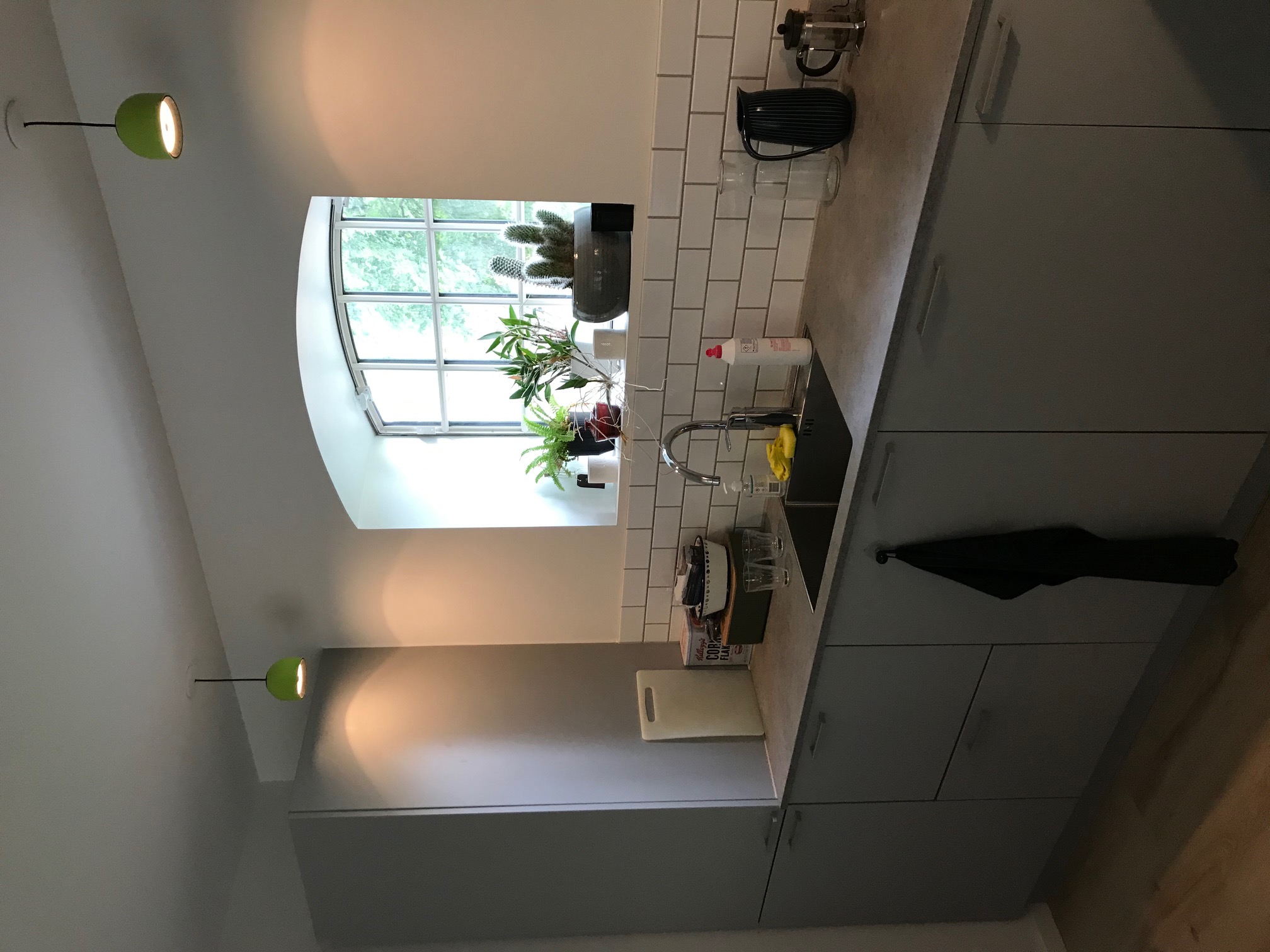 Køkkenet er praktisk indrettet og indeholder køl/fryseskab, opvaskemaskine, ovn og induktionskomfur.