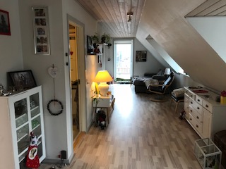 Der er lidt skråvæg i stuen, som har udgang til stor altan (35 m2). Der er udsigt til Mariager Fjord.