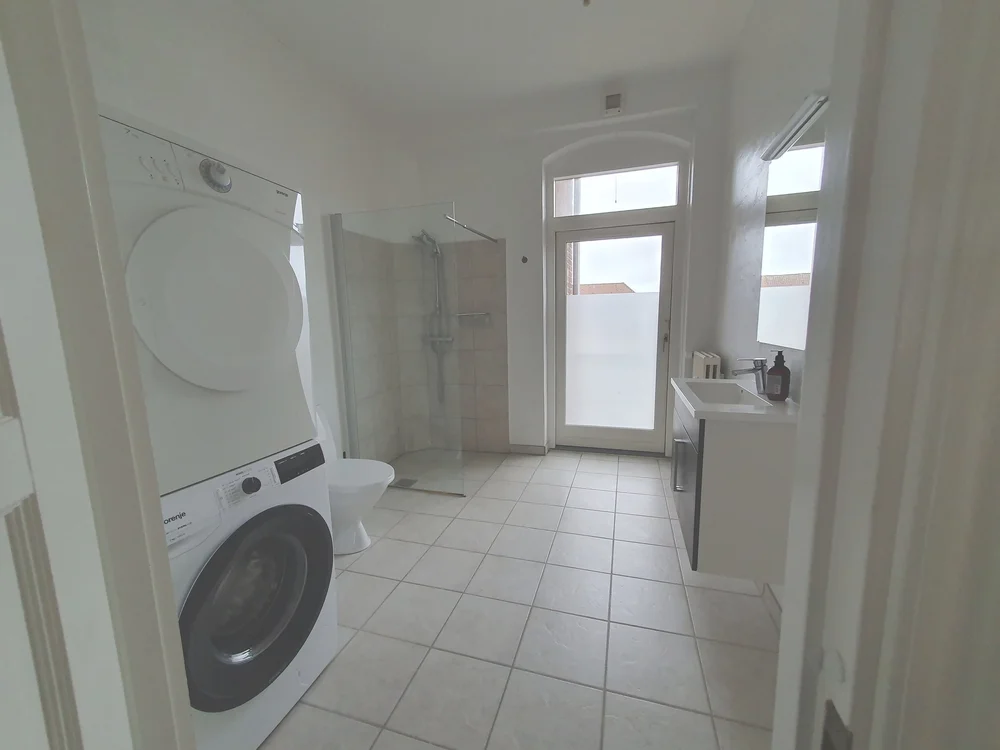 Stort dejligt brusebadeværelse med vaskemaskine og tørretumbler.