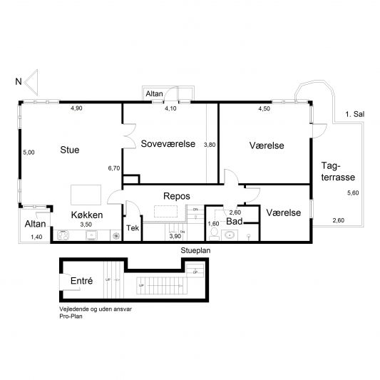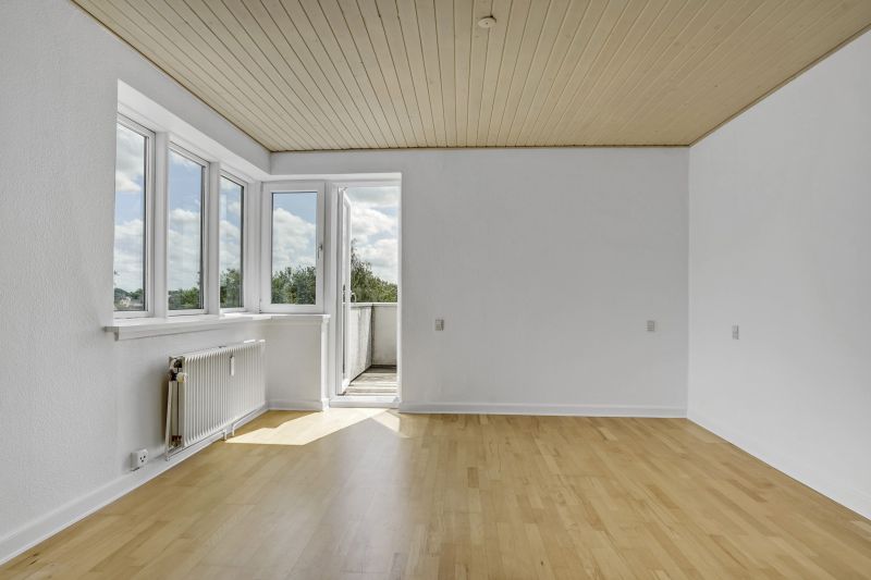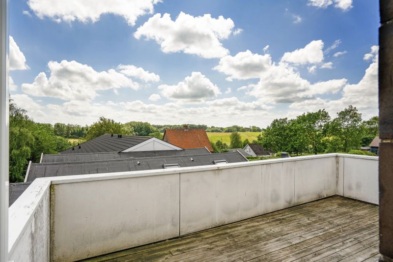 Separat opgang med trappe til 1. sal. Fordeler gang. Stort soveværelse med udgang til flot tagterrasse. 1 stk. værelse ved badeværelse. Pænt badeværelse med bruseniche. Stort køkken/Stue med keramisk komfur, emhætte, køleskab og opvaskemaskine. Pæn opholdsstue / Værelse med udgang til altan. Trægulve i alle opholdsrum. Lejligheden er lige klar til indflytning. Tilhørende muret garage.
