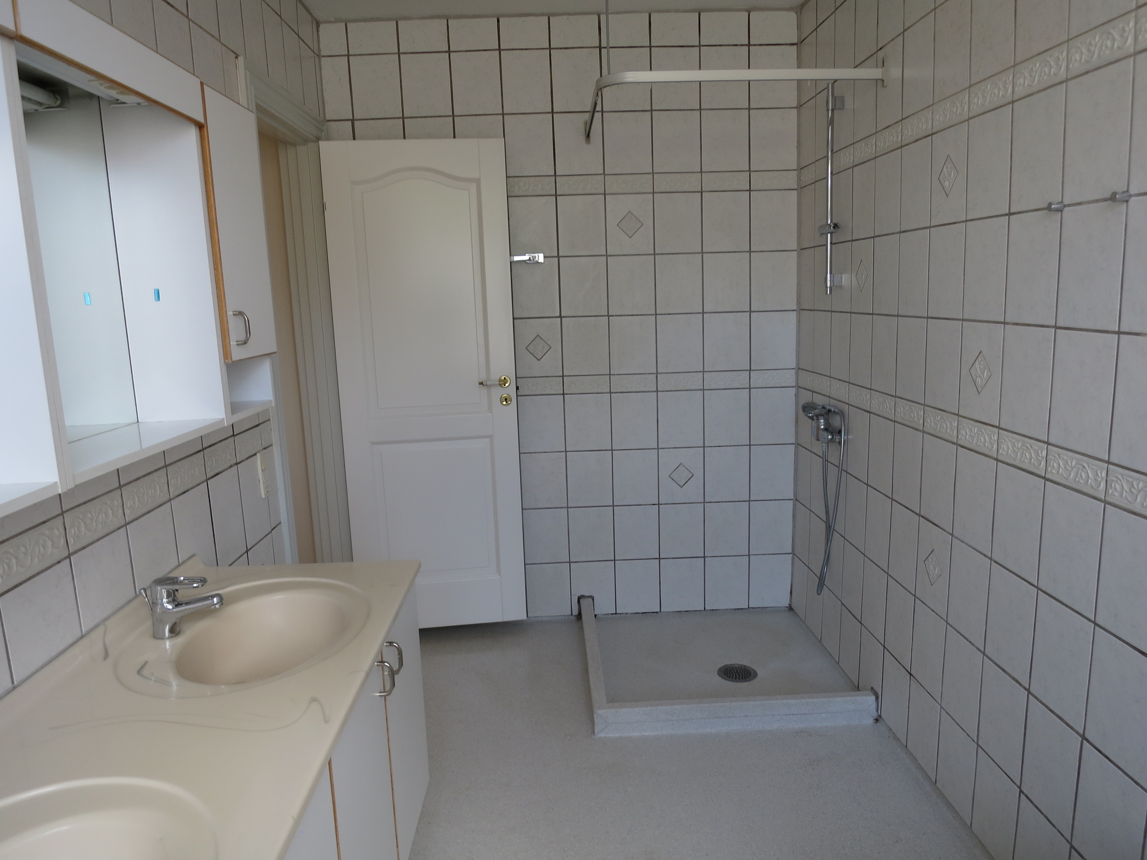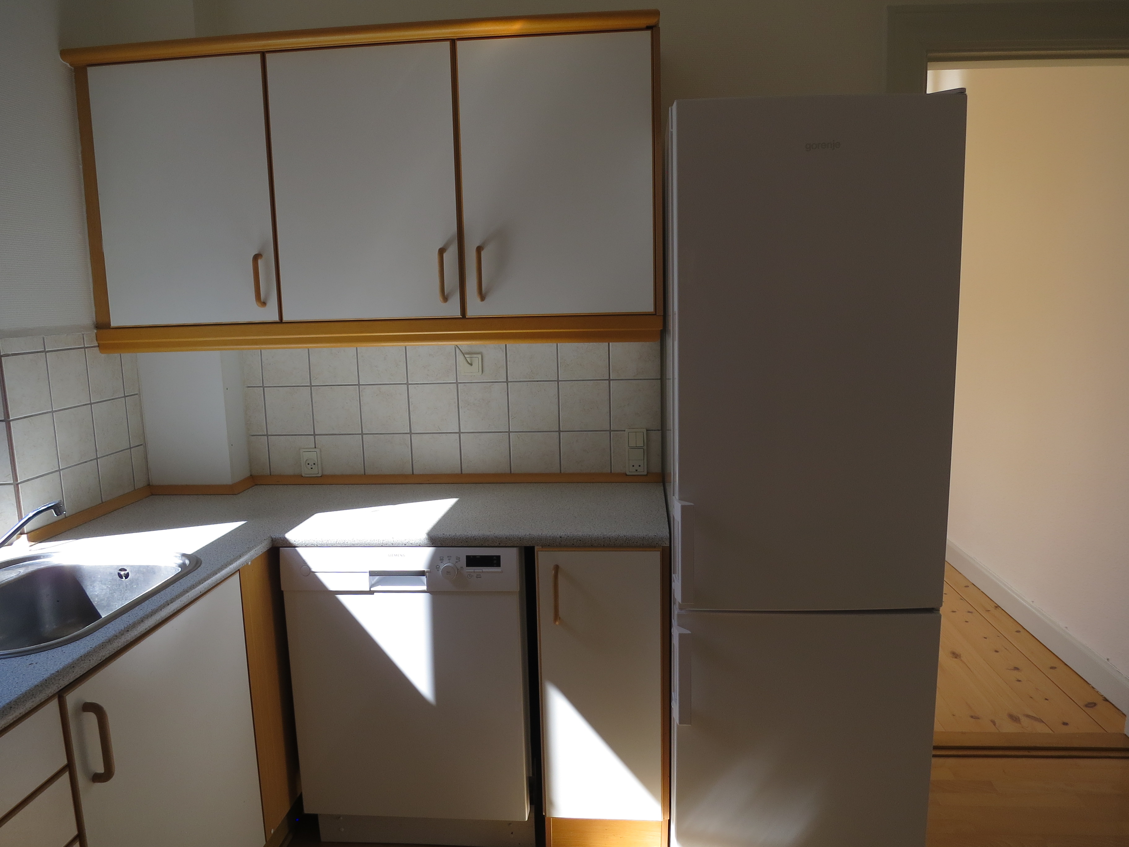 Stort lyst sydvendt køkken med alle hvidevarer, og stort samtalebadeværelse med badeværelsesarrangement (2 håndvaske, bidet og brusekabine).