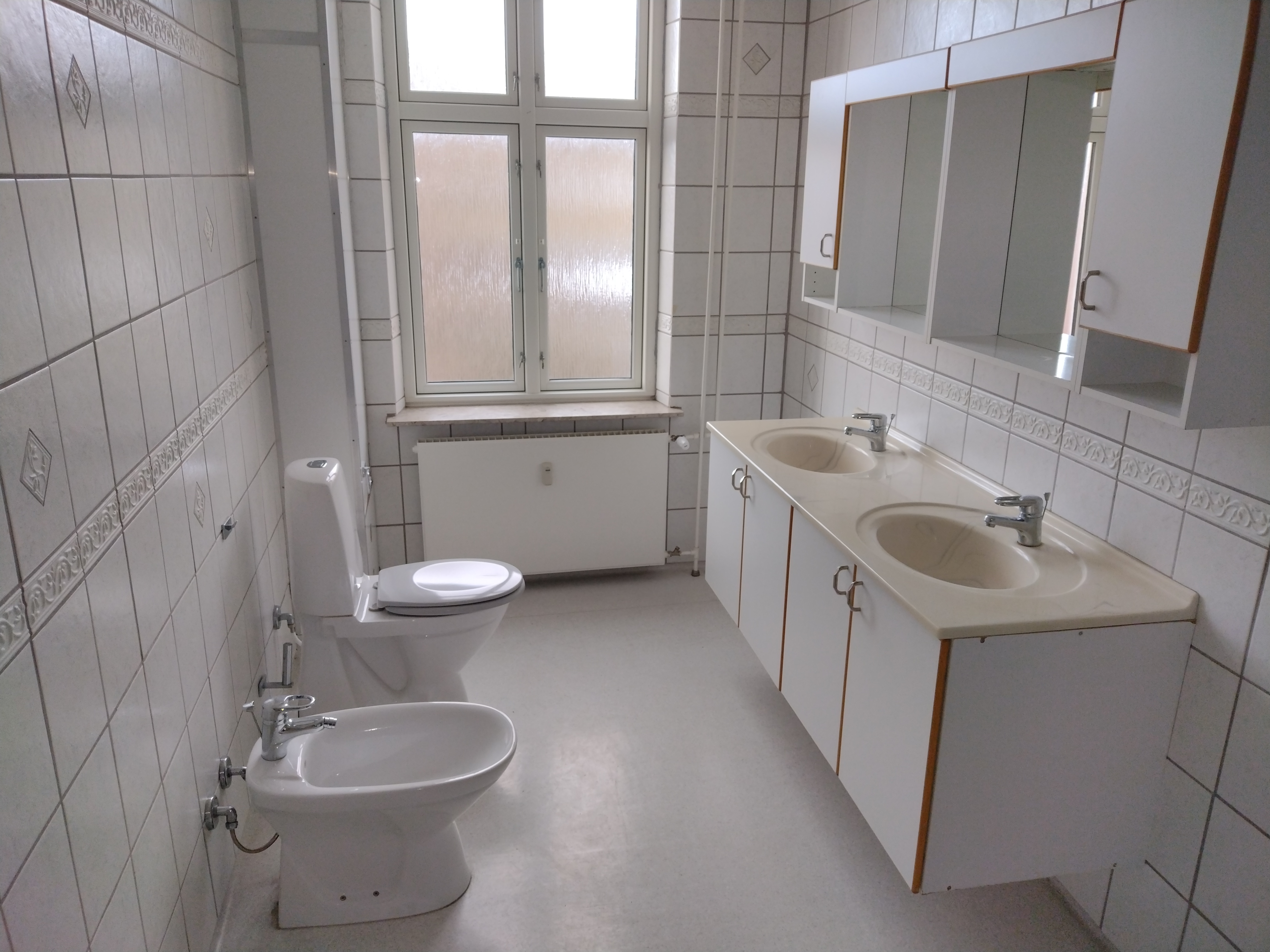 Stort lyst sydvendt køkken med alle hvidevarer, og stort samtalebadeværelse med badeværelsesarrangement (2 håndvaske, bidet og brusekabine).