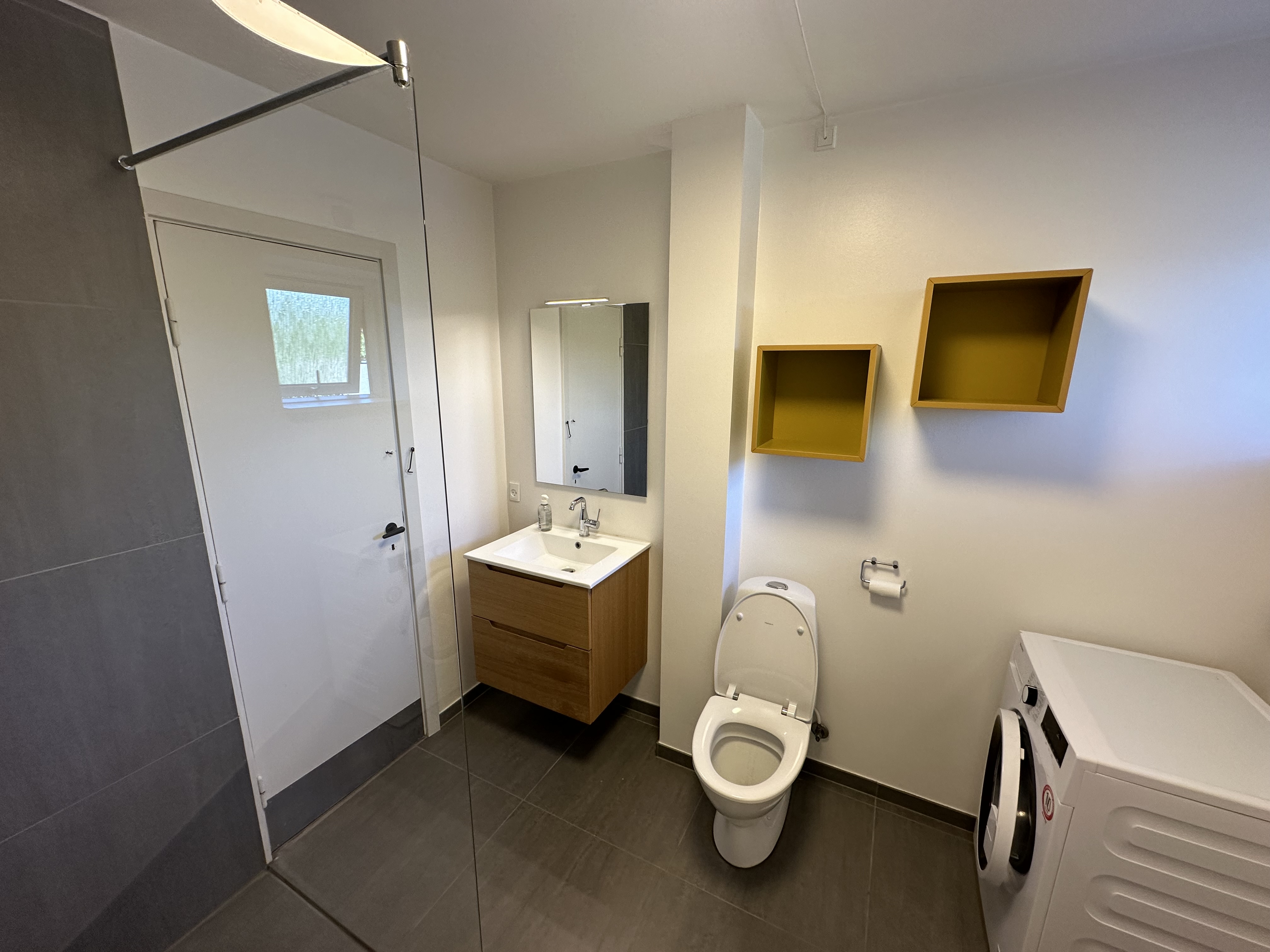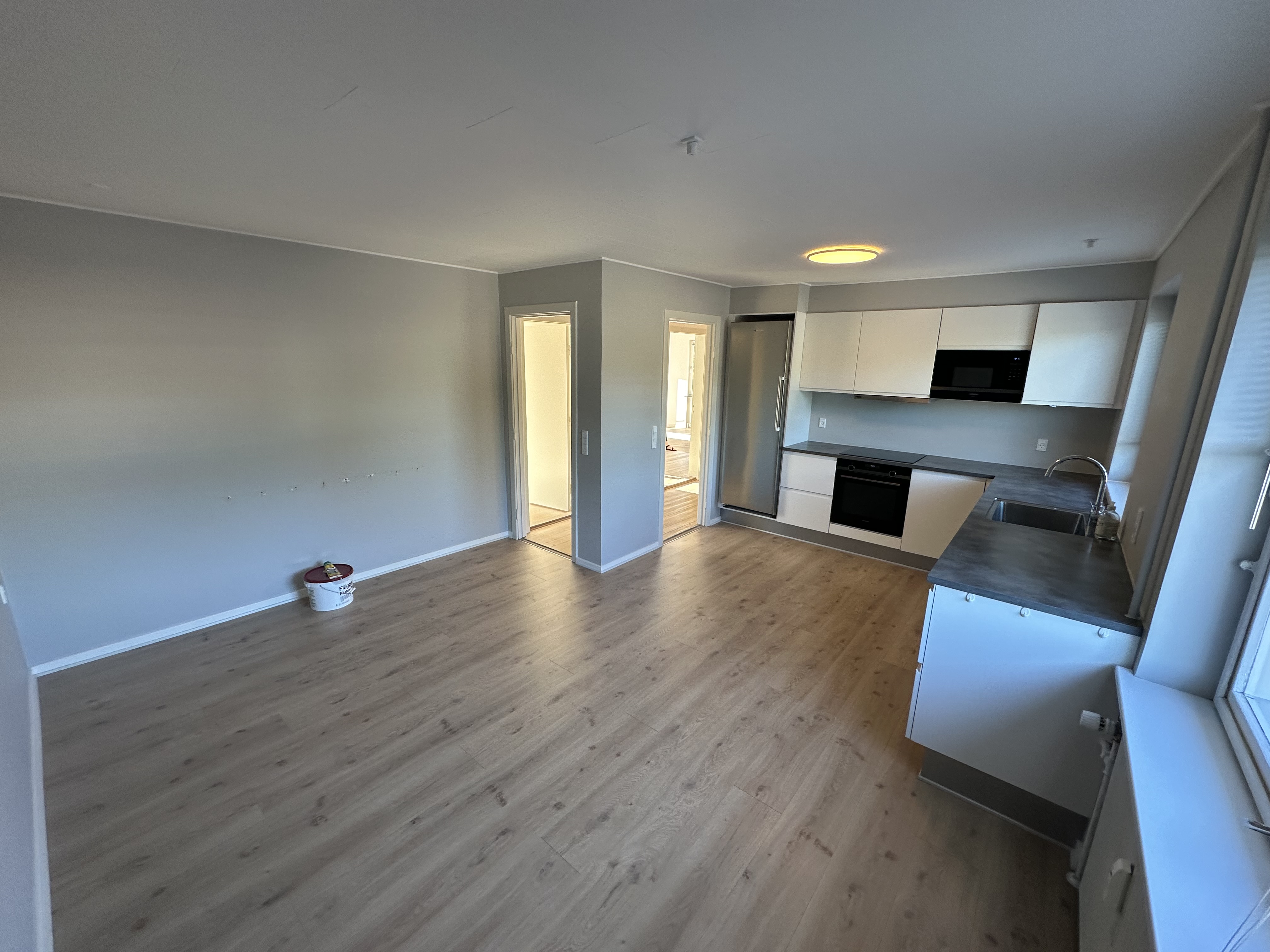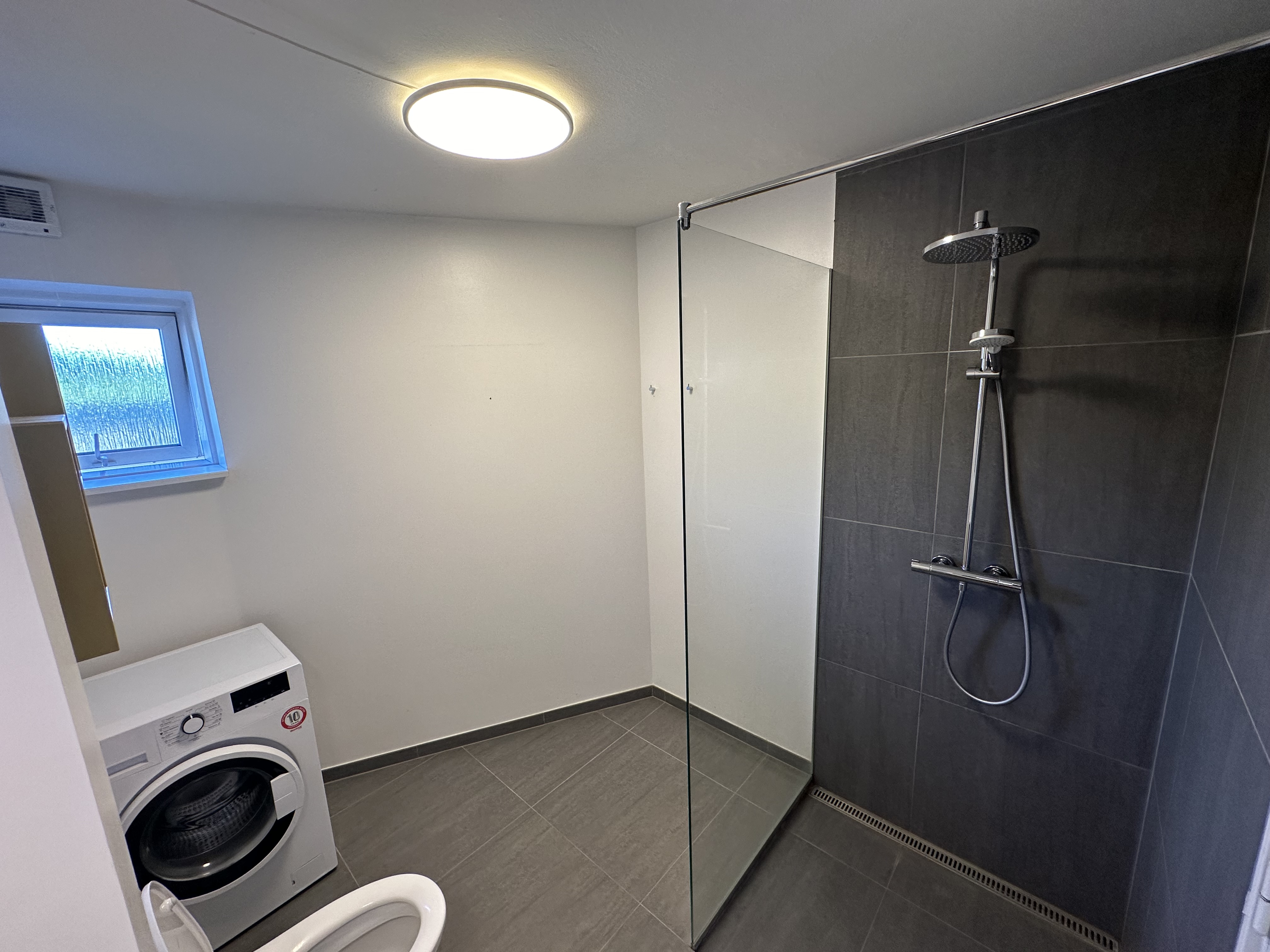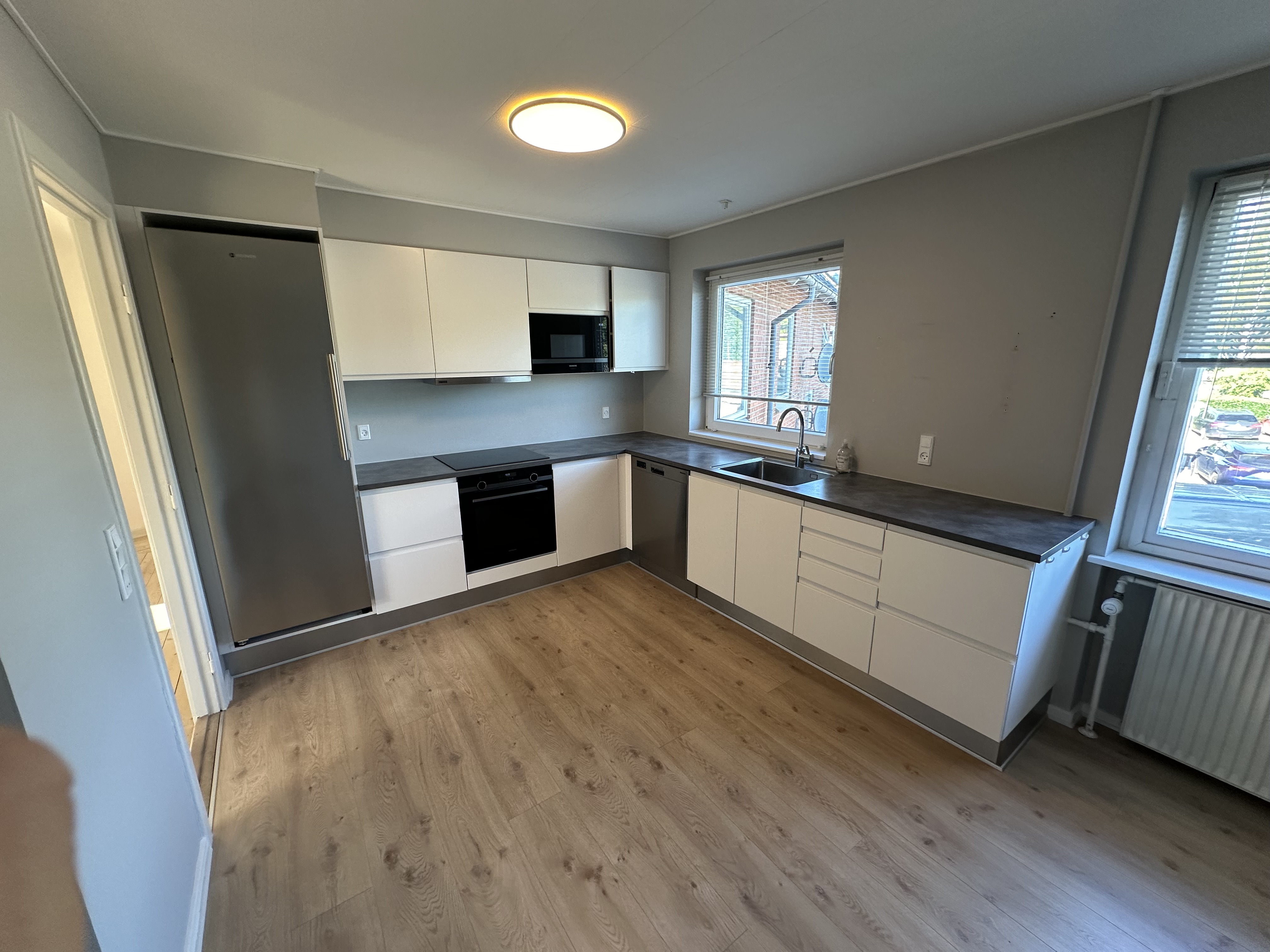 Detmoderne køkken er rummeligt og funktionelt, og badeværelset er indrettet medseparat bruseniche og egen vaskemaskine.Til lejligheden hører desuden et stort,tørt kælderrum – perfekt til opbevaring eller cykler.