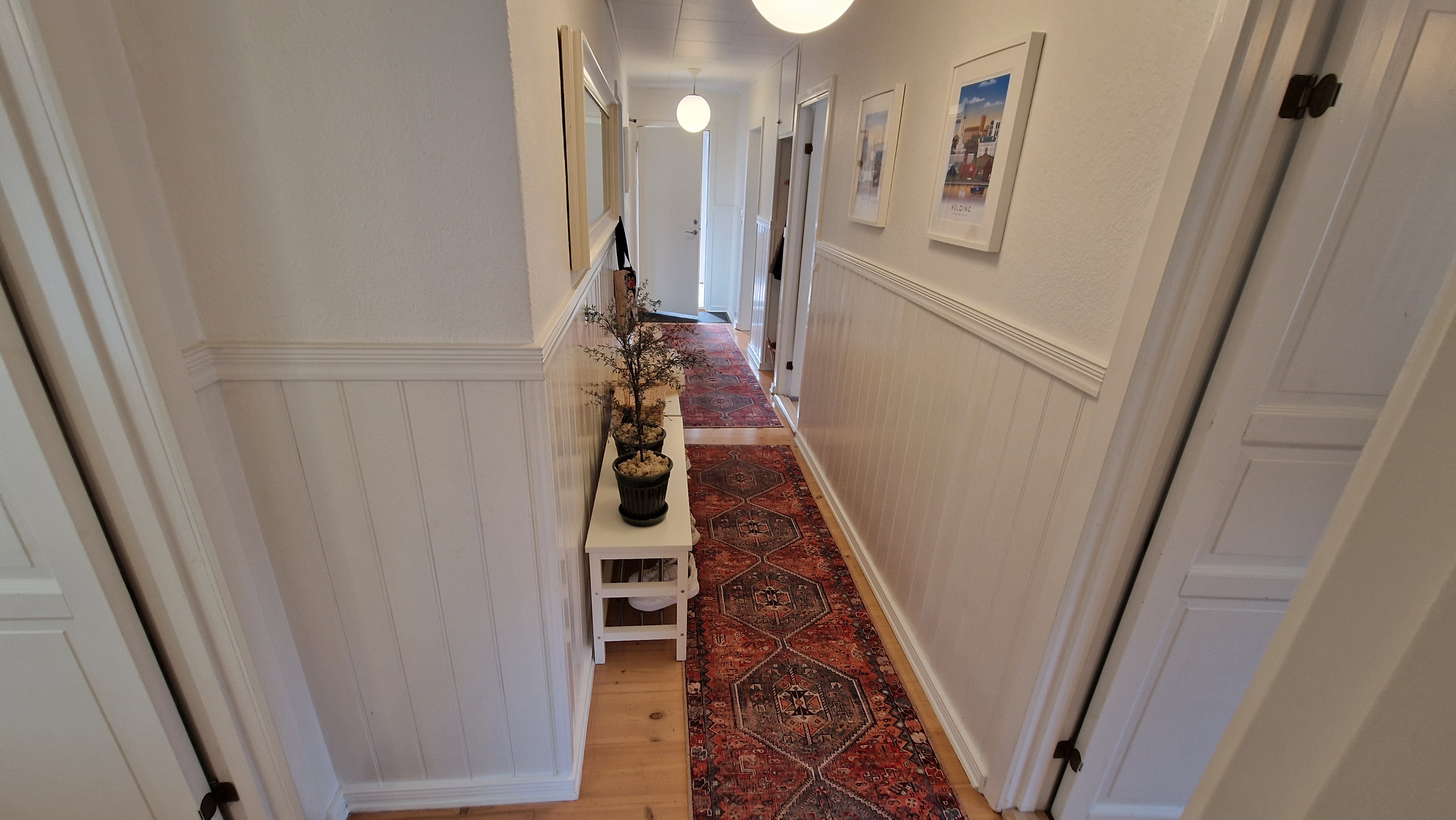 Indgang til entre / gang fra opgang, 2 rum bruges til stue med vinduer og karnap mod gade. Fra gang er der adgang til soveværelse med vindue mod øst. Køkken med HTH køkken med opvaskemaskine, køleskab med fryser samt emhætte, (Køkken er under opførelse). To værelser med vinduer mod vest. Soveværelse samt 1 værelse er udstyret med stort skabsvæg. Et værelse er udstyret med 3 skabe. Bad / wc er med fliser på gulv samt gulvvarme glasvæg mod bruseniche samt fliser på vægge i bruseniche. Under vask er skab med låger. Gulv i stuer, gang, soveværelse og værelser er lakeret fyrplanker, køkken Vinyl på gulv. Loft er gips plader der er malet hvid. Fra køkken er der adgang til stor gård have.