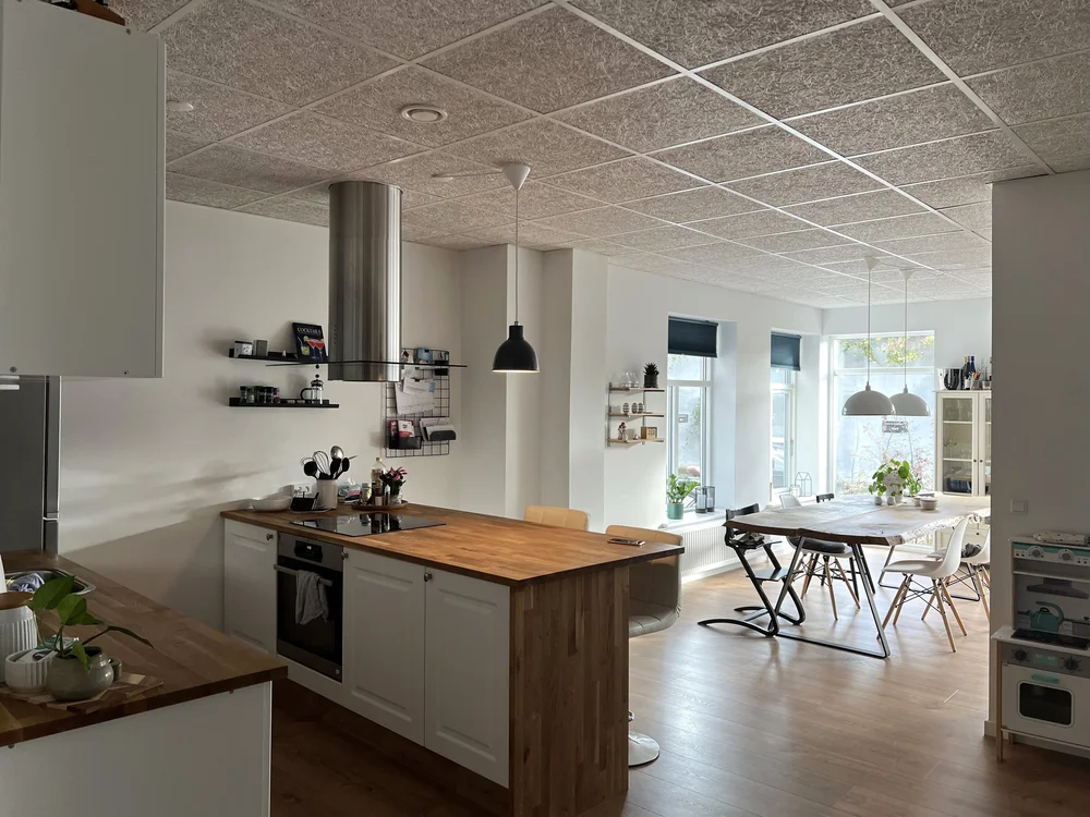Dejlig lys lejlighed med nem adgang til Damparken. Stor stue med udgang til egen terrasse. Soveværelse og to børneværelser med skabe. Rigtig gode rum og god indretning. Pænt og næsten nyt lejemål med dejlige egegulve og akustik lofter. Gode materialer med nye vinduer, isolerede gulve, lofter og vægge, alt nænsomt moderniseret for få år siden. Lækkert flisebadeværelse med gulvvarme og håndklædetørre, egen vaskesøjle, skabsplads og spejl med lys m.m. Godt køkken med massive bordplader og masser af skabsplads, alt i hårde hvidevarer, med pyrolyseovn, induktion kogeplader og opvaskemaskine. Stort køle/fryseskab og siddeplads til høje stole ved kogeø.