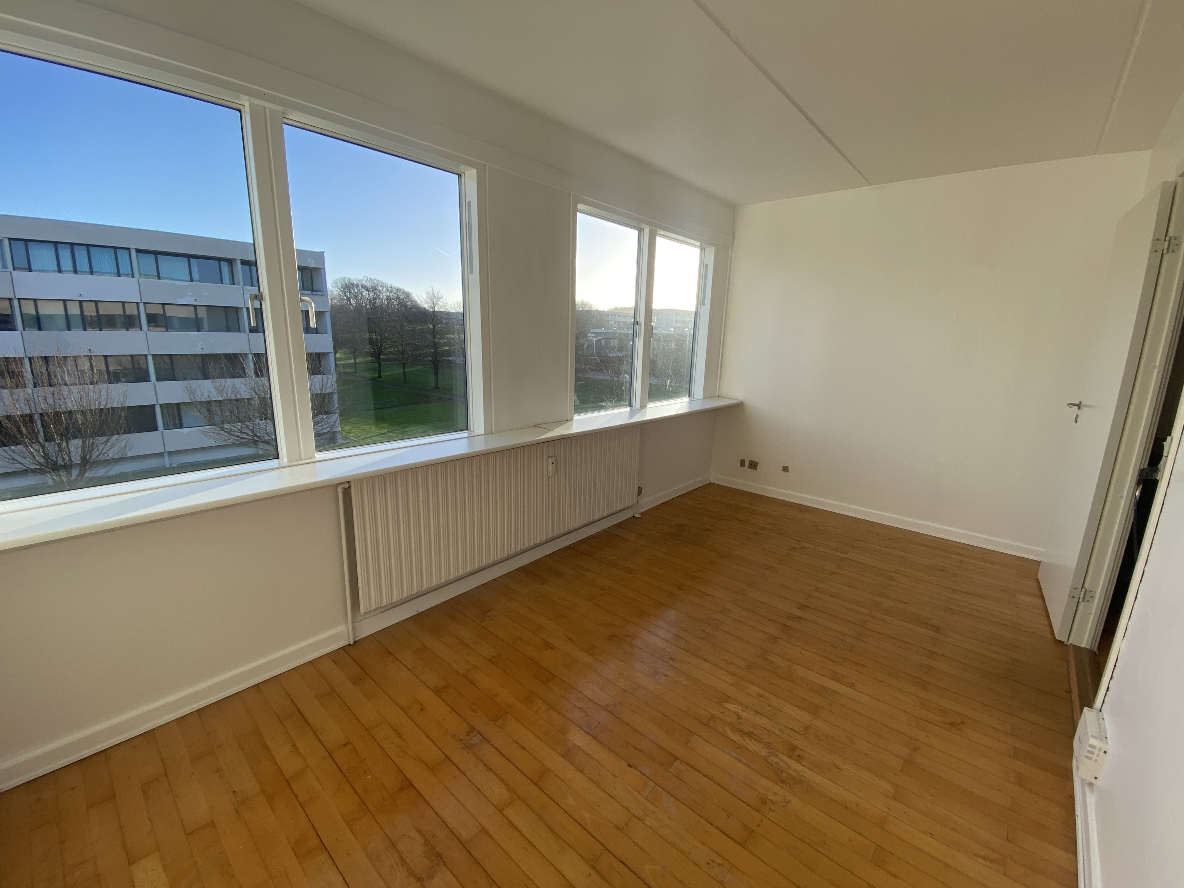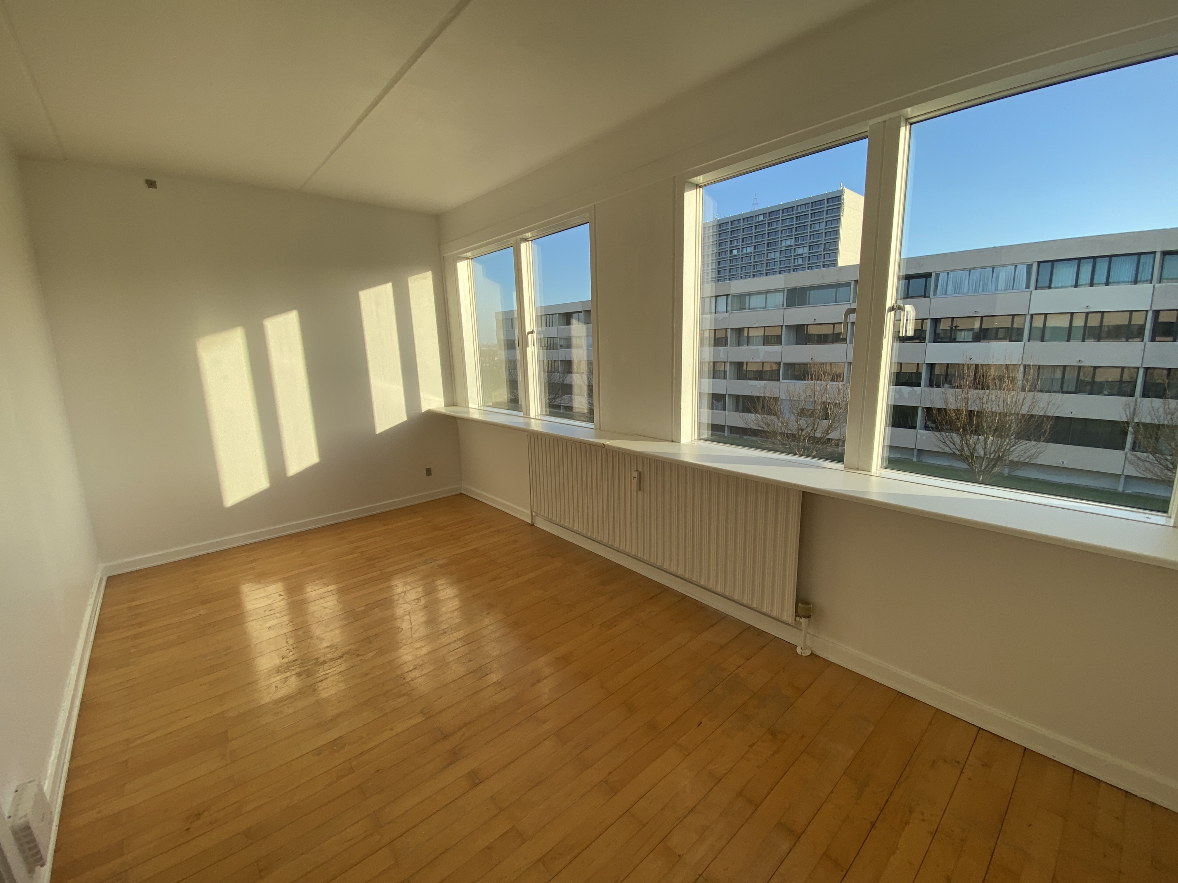 Her får du en skøn lys lejlighed med store vinduespartier, der vender ud mod områdets grønne område. Lejligheden, der ligger på 2. sal, har nymalede hvide vægge. Her er der god plads til både seng og spisebord.