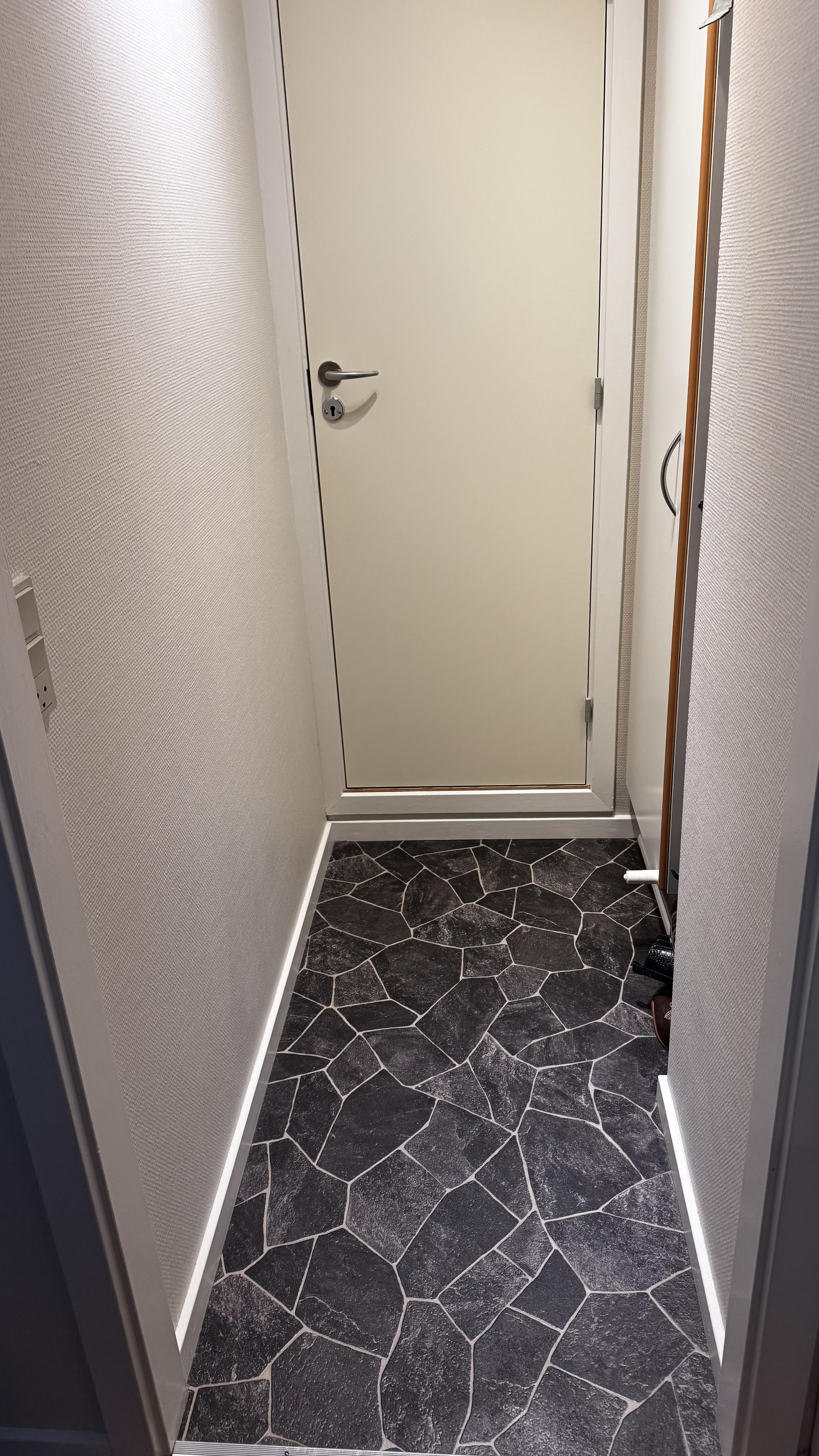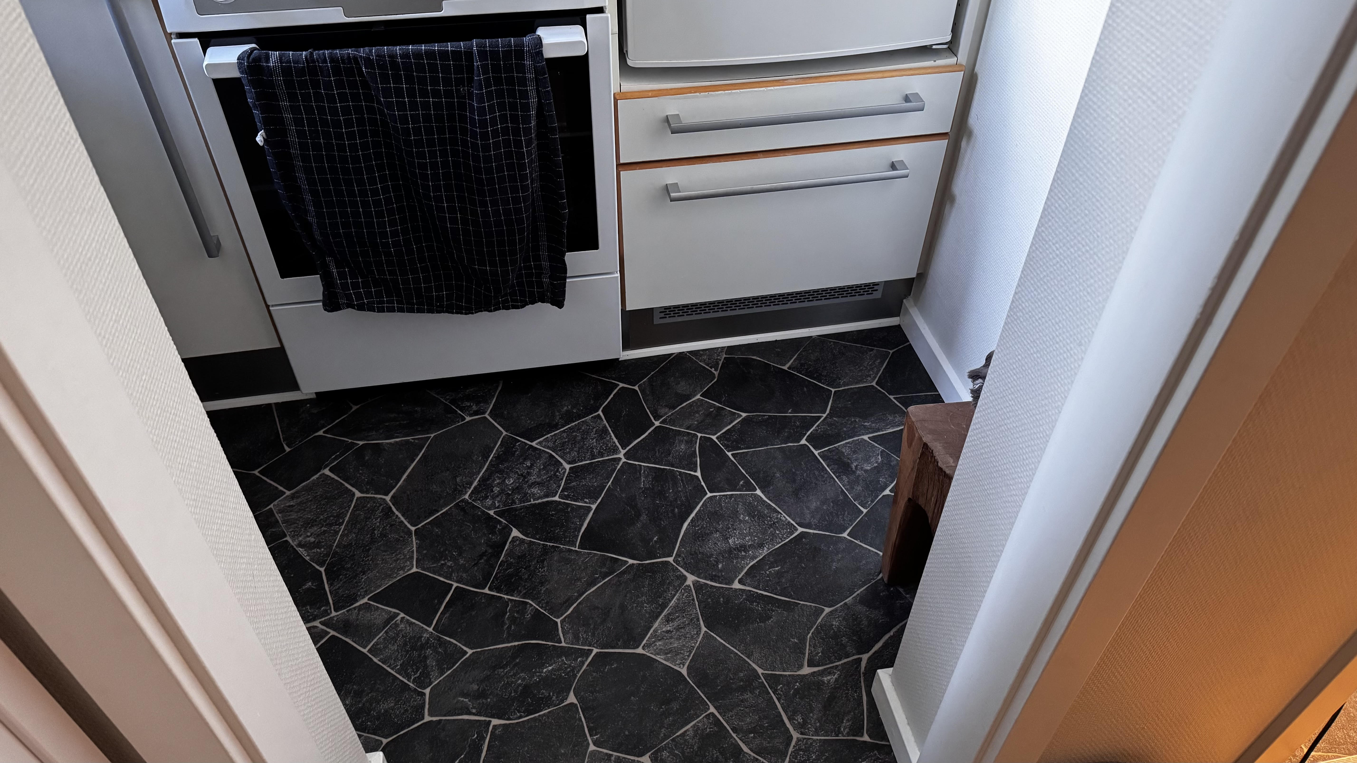 I 2021 er der kommet nyt vinylgulv i køkken og gang, mørk sten look.