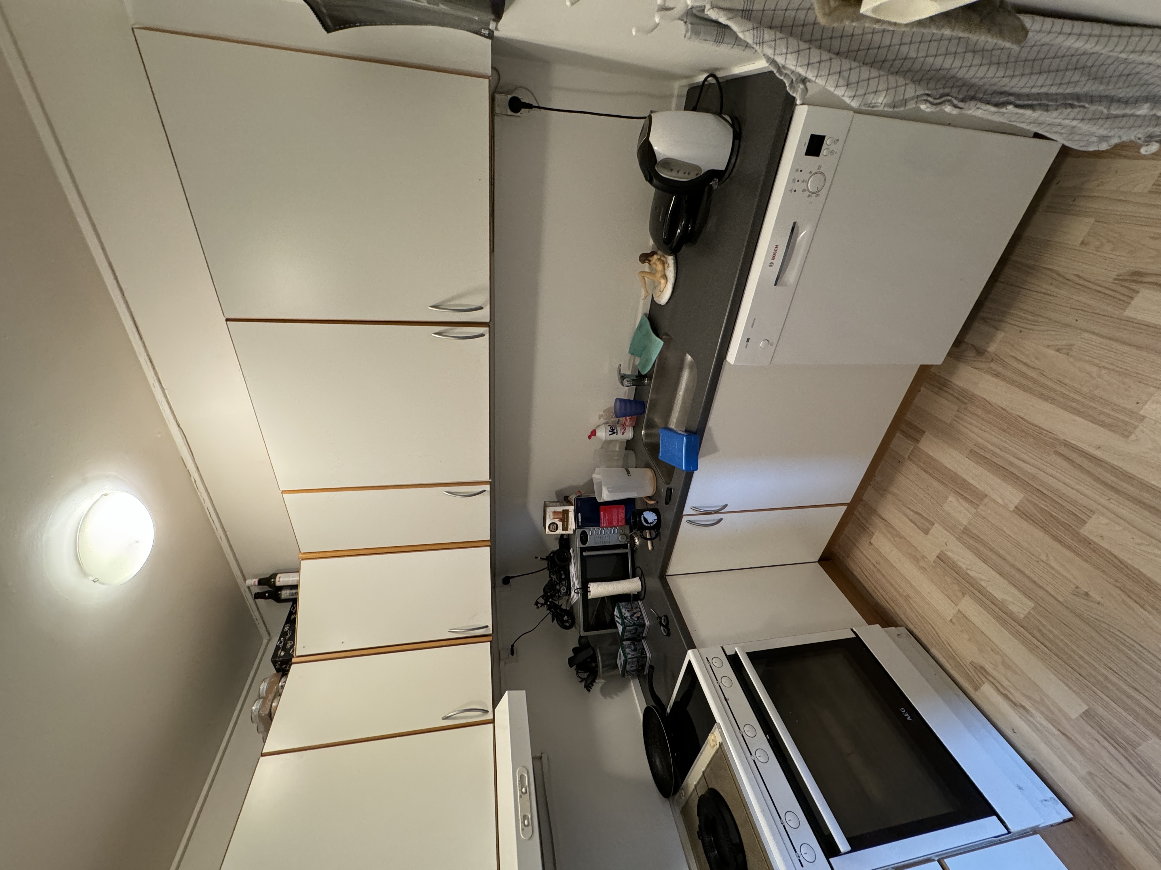 Køkkenet er funktionelt indrettet med god skabsplads og moderne hvidevarer. Den åbne planløsning skaber en luftig og indbydende atmosfære.