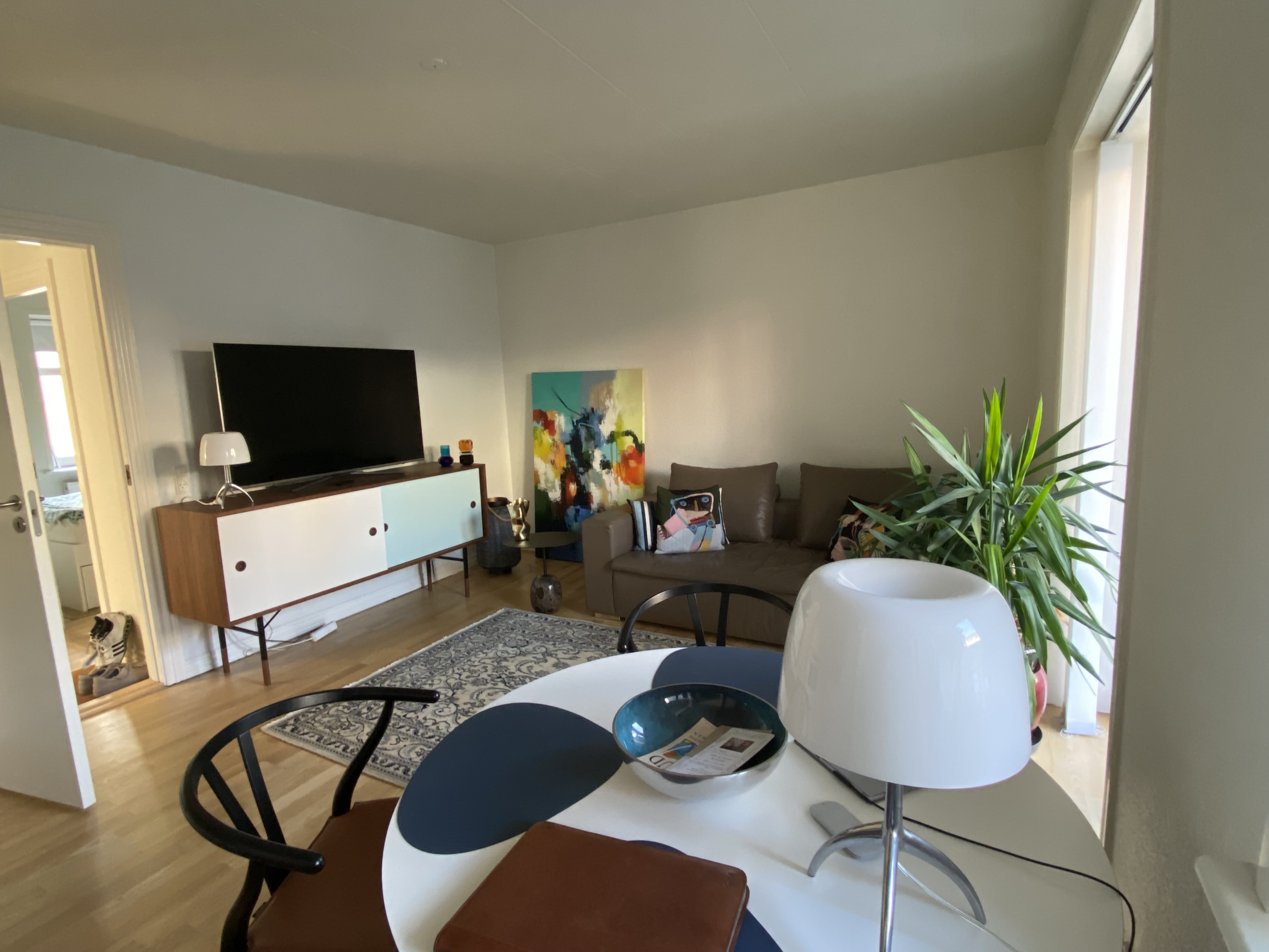 Hyggelig lys 2 værelses istandsat lejlighed med trægulvet i stue etage, egen bad og køkken med hårde hvidevarer som består af en opvaskmaskine, et frys/køleskab, et komfur med emhætte og godt med skaber. Badeværelset med bruseniche. 4-dør skab i soveværelset. Flot solrig ca. 7 kvm. altan om aften, så samlet areal udgøre ca. 57 kvm. Nye vinduer og gluvarm i badeværelset. Der er fælles vaskeri og depotrum.