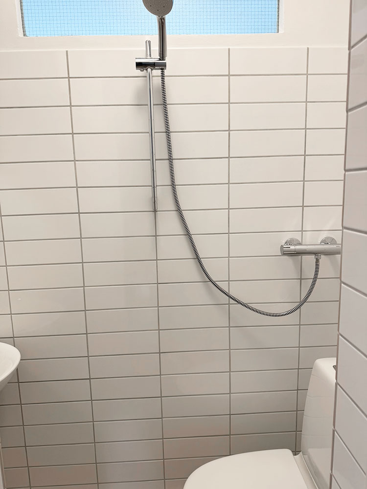 Lejlighedens indgang til badeværelse finder man i entreen. Flot badeværelse med klinker fra gulv til loft – enkelt og nemt at holde rent.