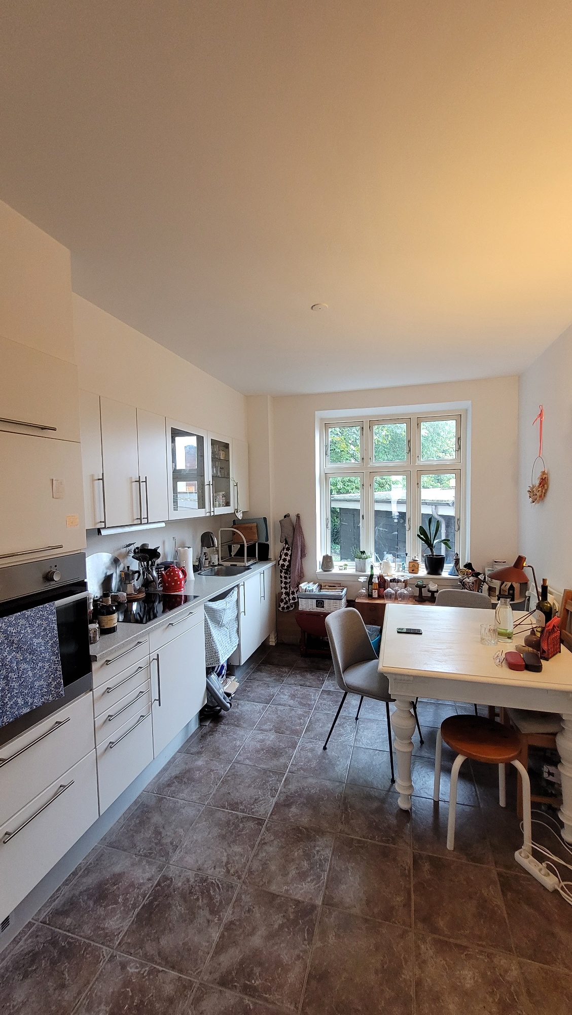 Velindrettet køkken med hvidevarer i stål og mulighed for opstilling af egen opvaskemaskine. Her er der lagt klinker med gulvvarme.
