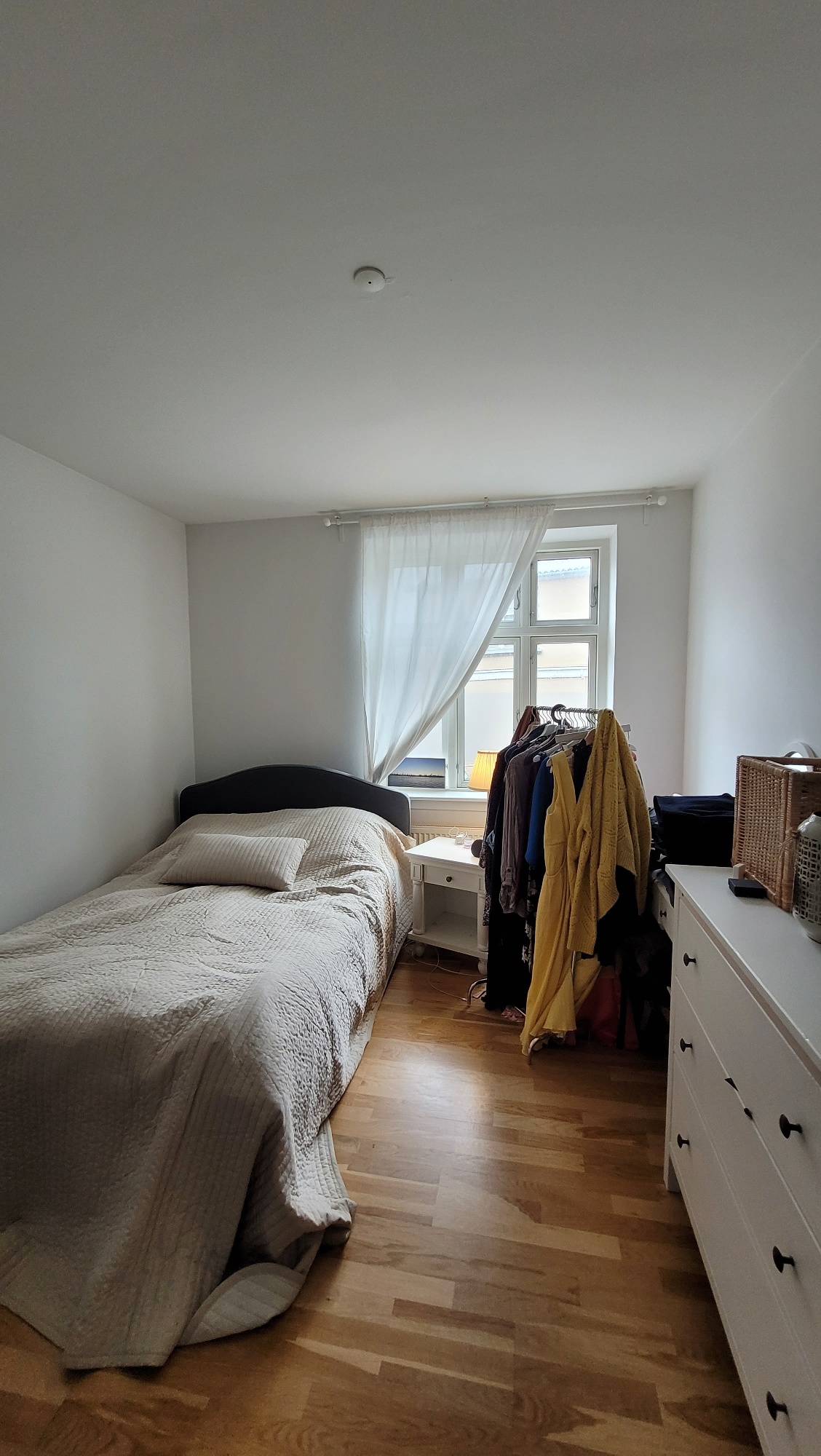 Soveværelse og stue er med ludbehandlet fyrretræsgulve.