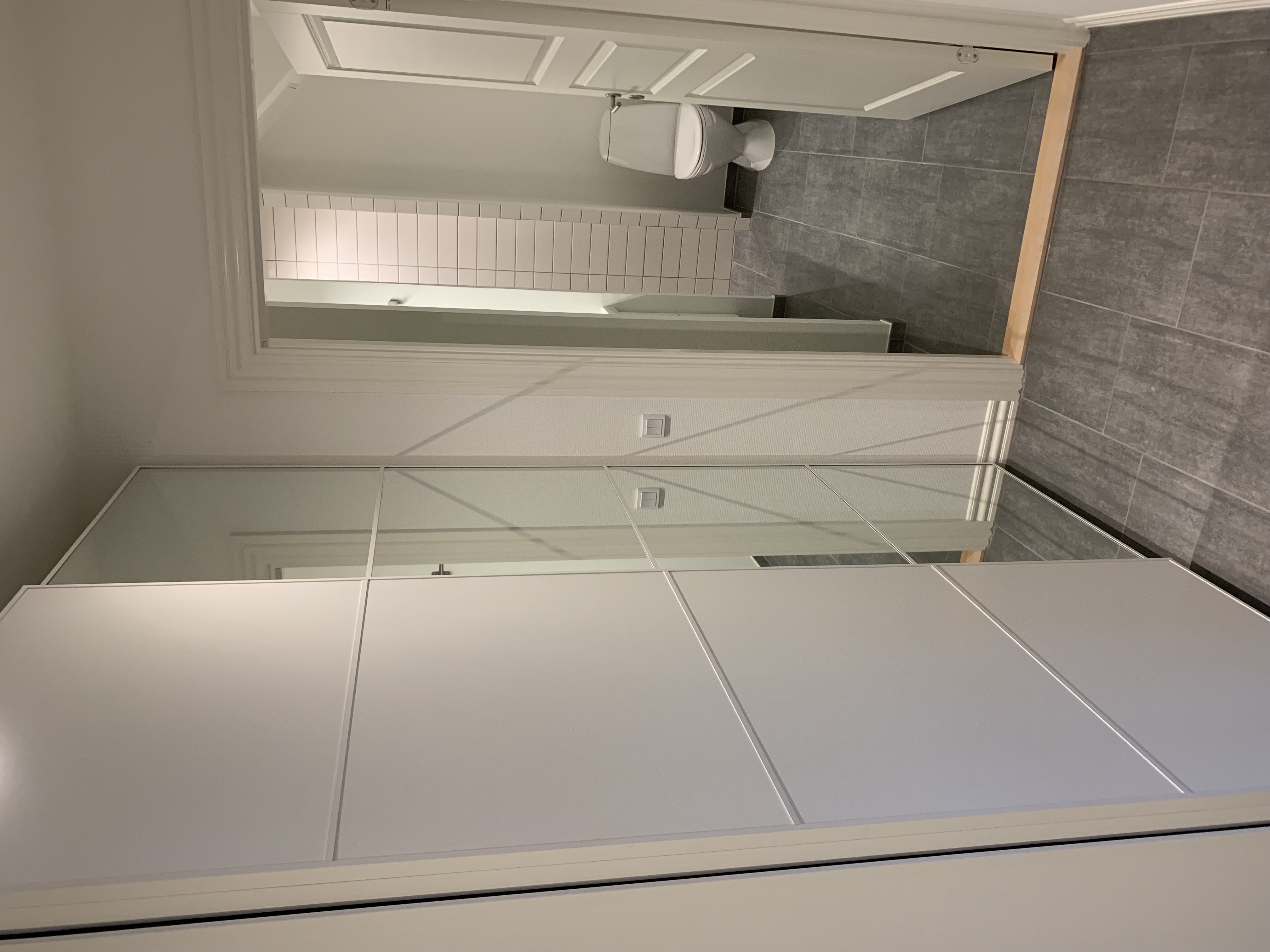 I lejlighedens store entre er der et stort indbygget skab med skydelåger, hvor der er god plads til opbevaring, samt flotte klinker med gulvvarme.