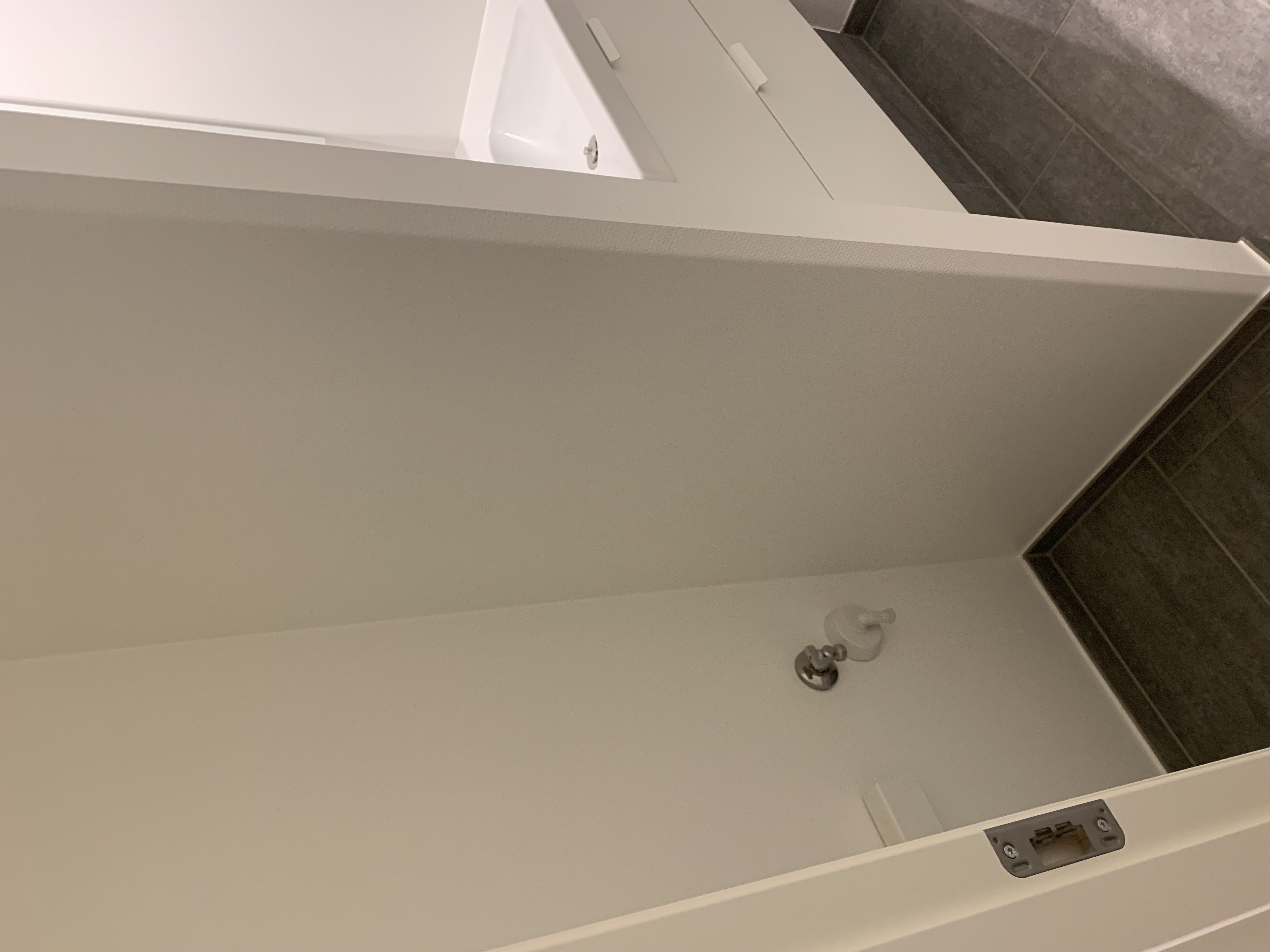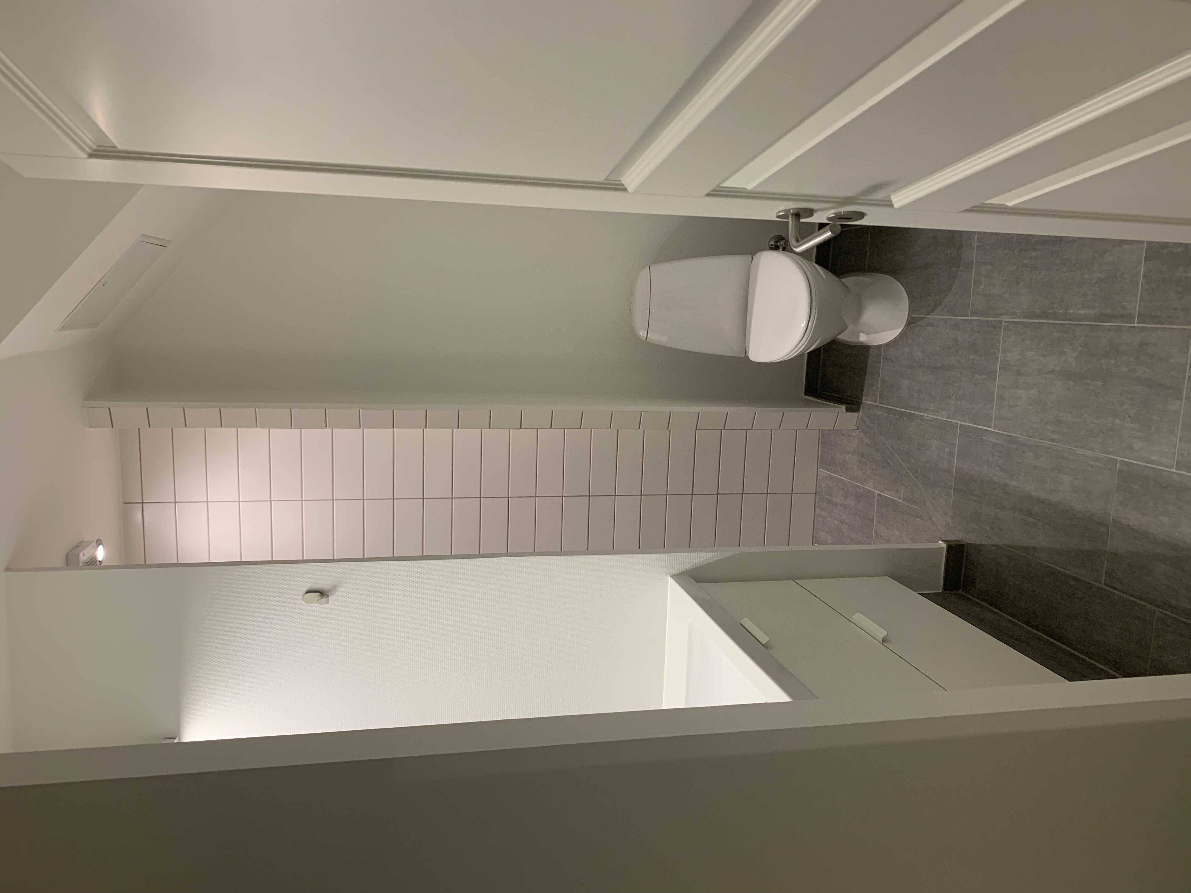 Fra entréen og til venstre ligger badeværelset, som har samme klinker som i entréen også med gulvvarme. Derudover er der mulighed for tilslutning af egen vaskemaskine og kondenstørretumbler.
