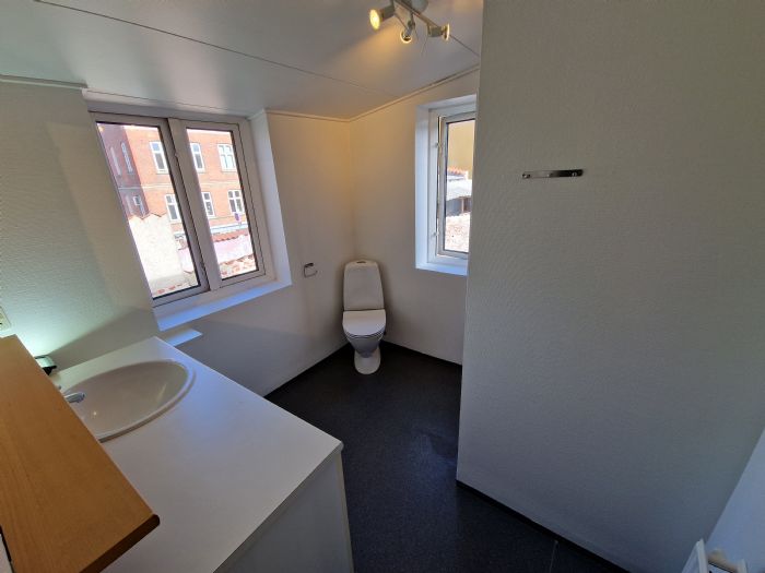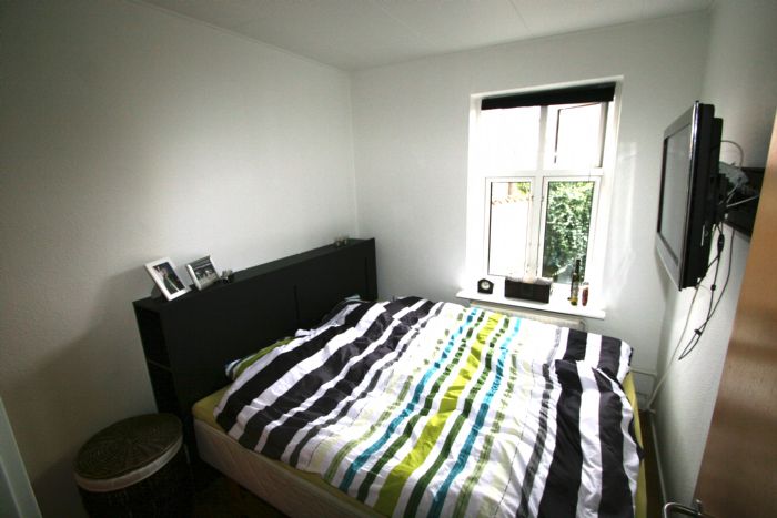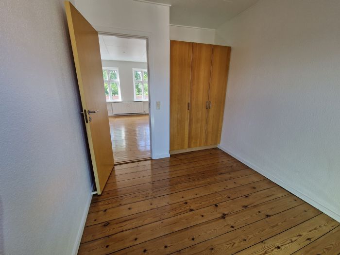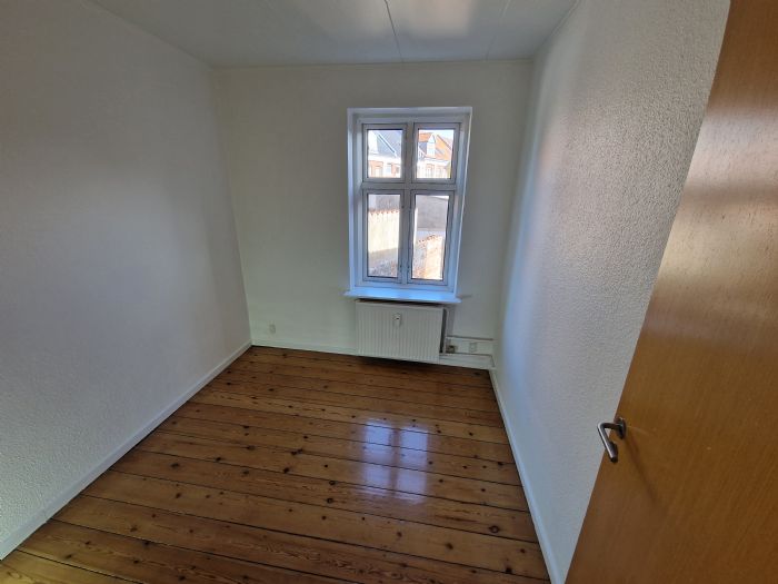 Indgang til entre i stue fra opgang, fra stue er adgang til, soveværelse samt køkken. Soveværelse er udstyret med 3 stk. skabe og danebrogsvindue ud mod gård. Bad / wc med adgang gennem mellemgang til køkken. Vinylgulv i badeværelset samt fliser på vægge i brusenichen, 1 stk. danebrogsvindue ud mod gård.