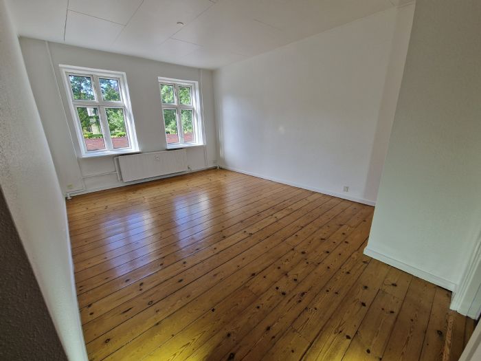 Et hyggeligt køkken med HTH inventar. Stue med 2 stk. VINDUER UDSTYRET MED EFFEKTIV LYDDÆMPENDE GLAS MOD GADE. Gulv i stue, køkken, og soveværelse er gammelt fyrtrægulv, der er lakeret. Loft: Gips plank malet hvid. Vægge er tapetserede og malet i modehvid. Træværk er lysgråt.