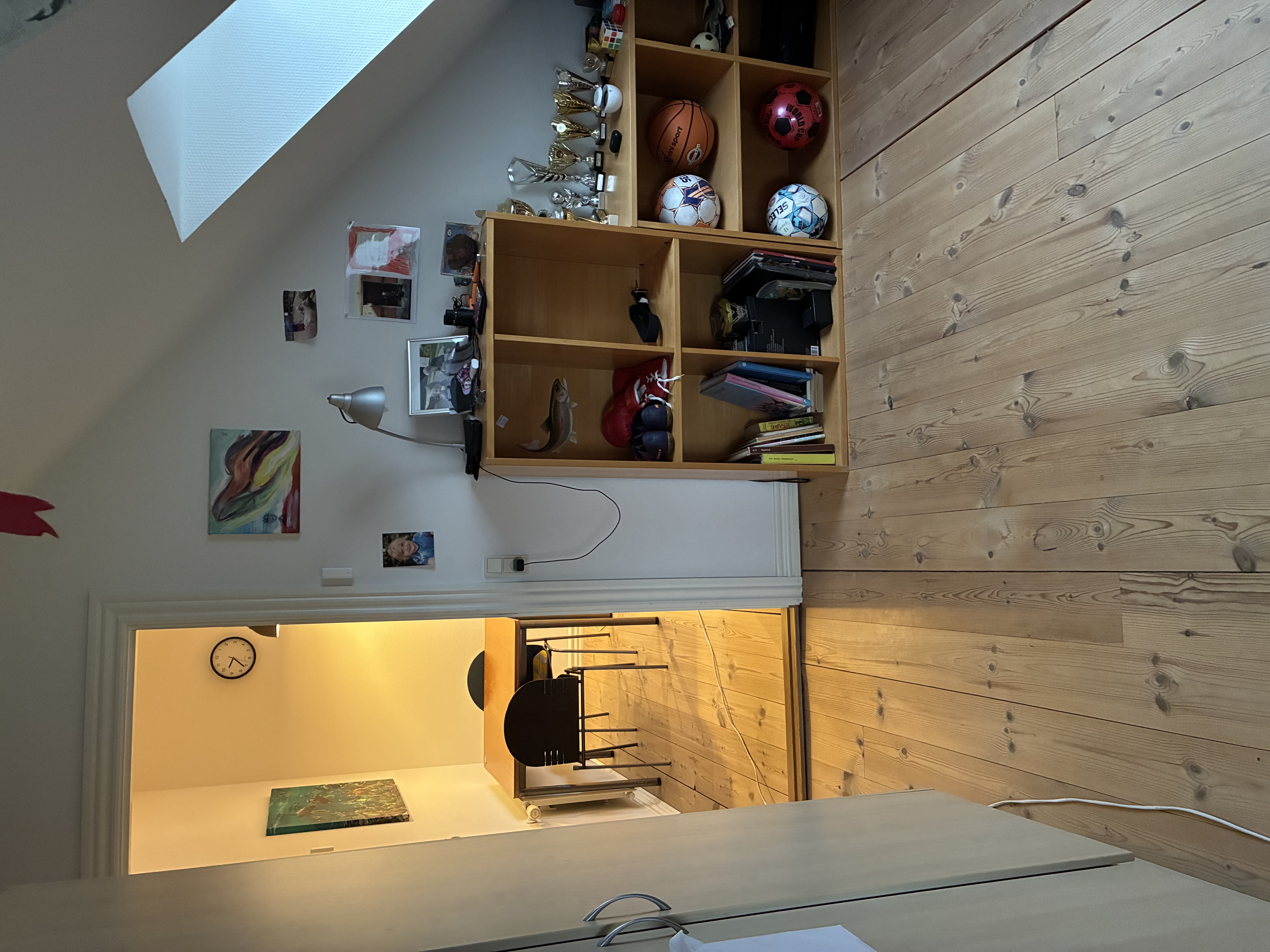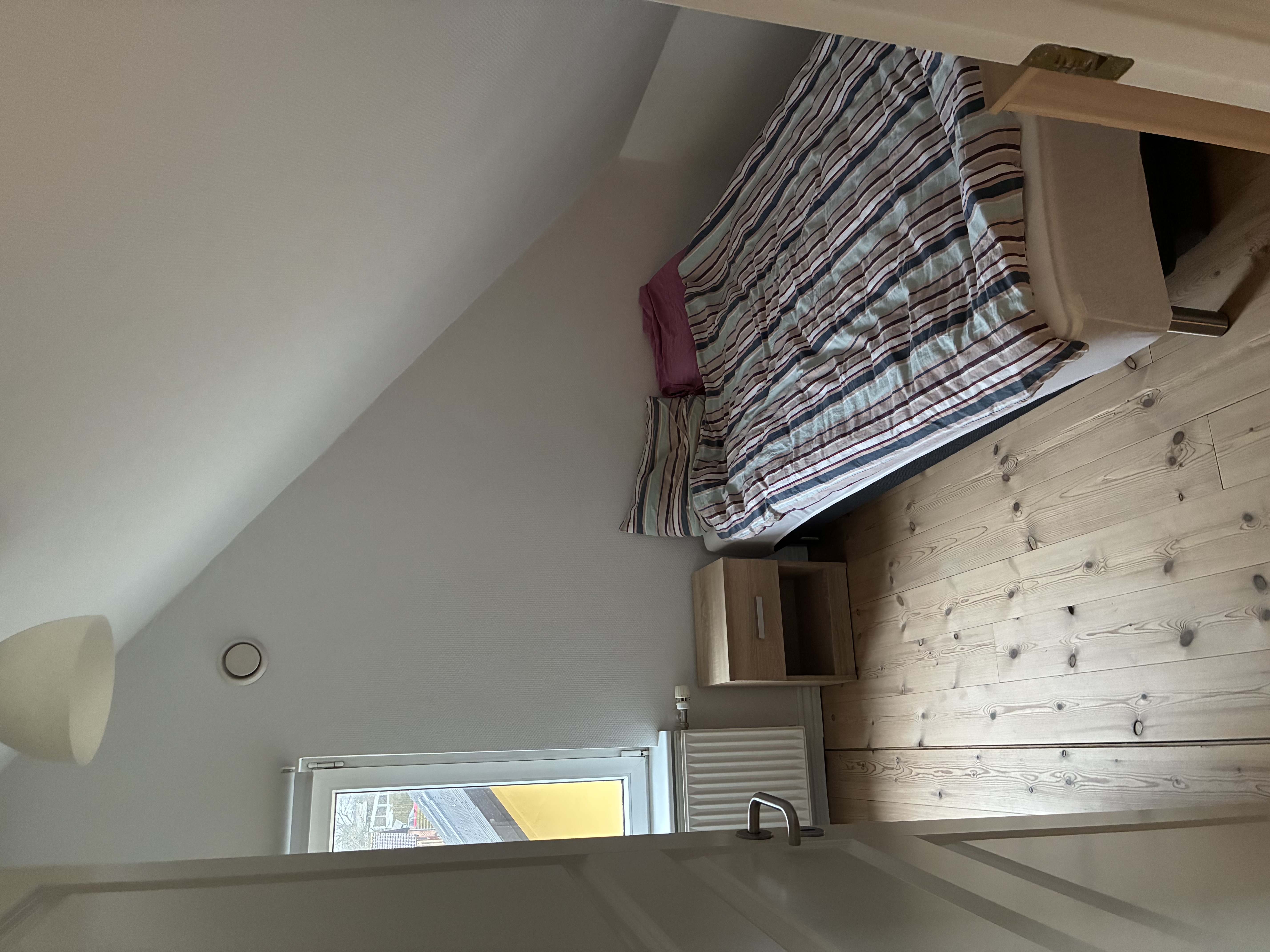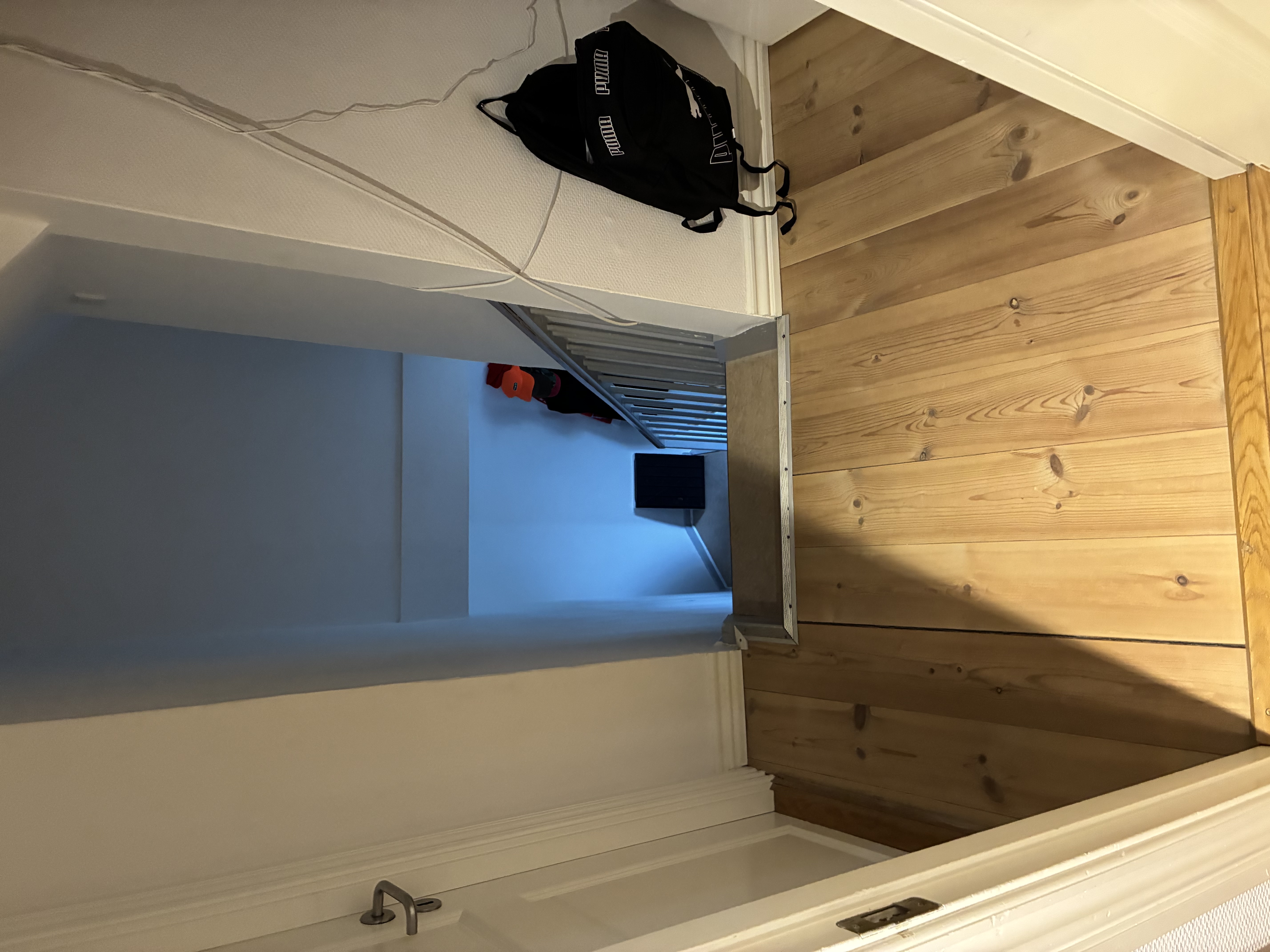 Fra køkkenet kan man bevæge sig ind på lejlighedens første værelse. Her er værelsets ovenlysvindue med til at bidrage til et lyst og rummeligt værelse. Værelset indeholder også indbyggede skabe med plads til opbevaring.