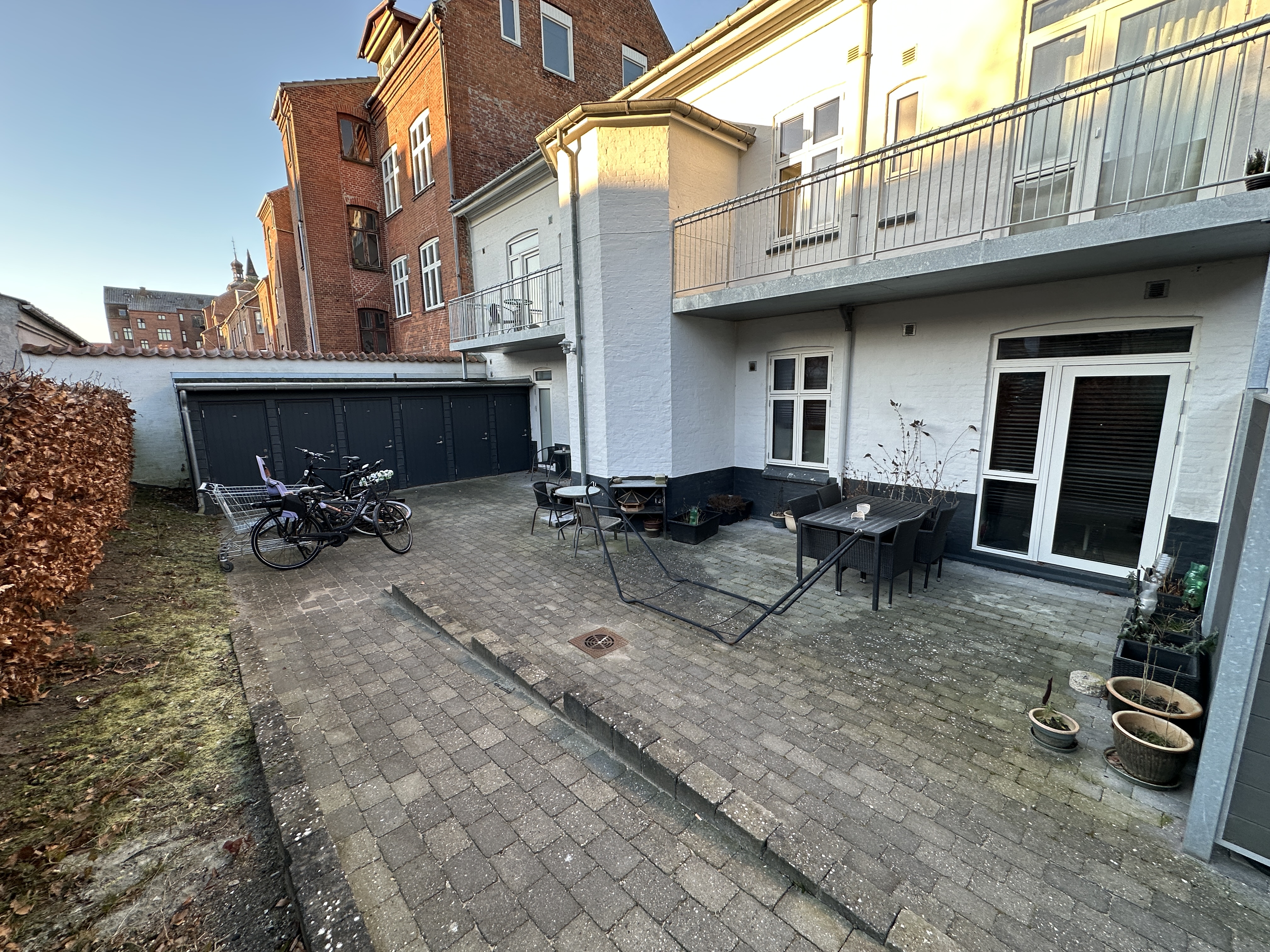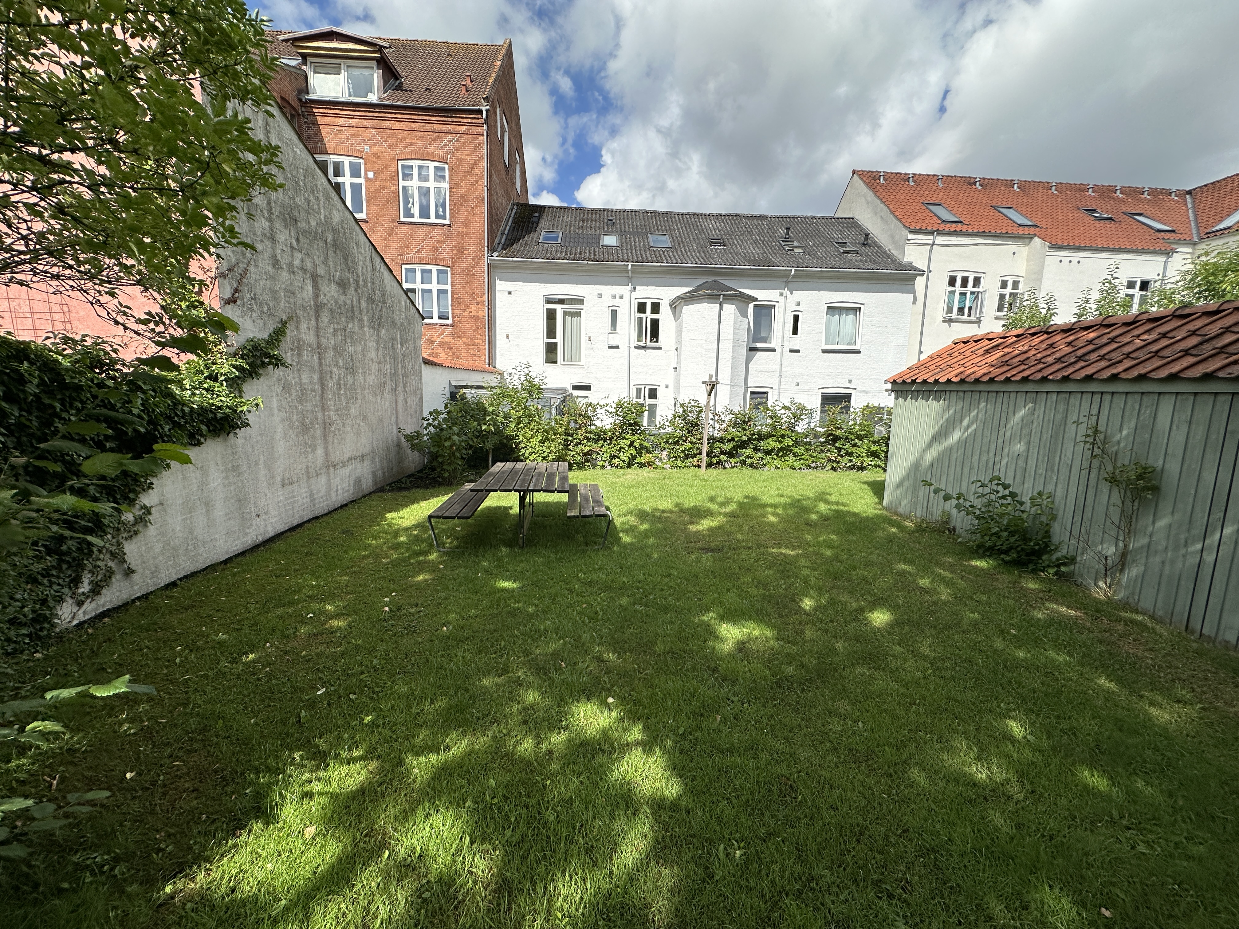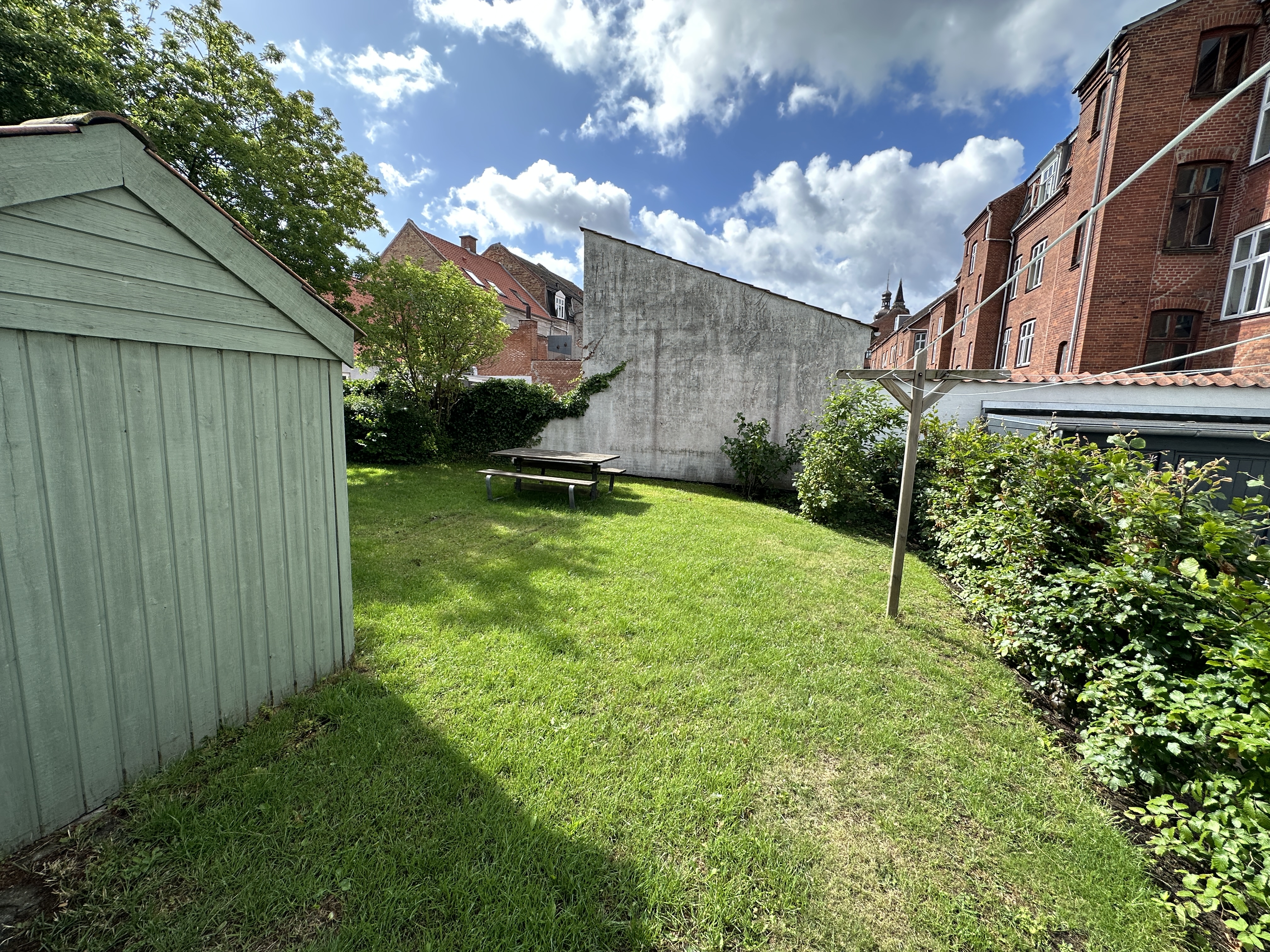 Der er et skur til hvert lejemål og cykelparkering i gården.