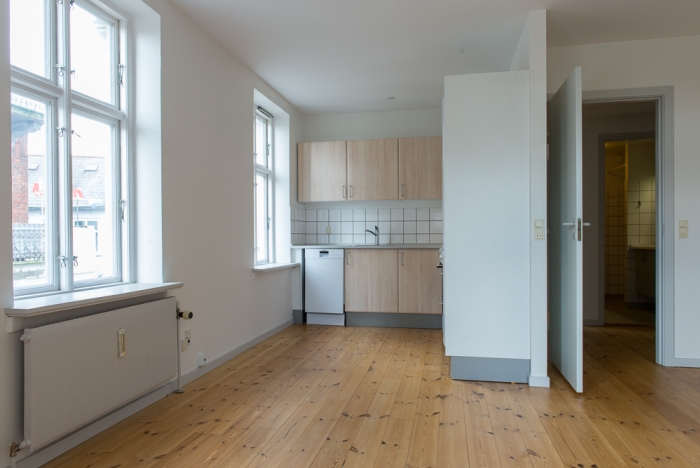 Lejligheden består af badeværelse med nyt toilet, soveværelse med skabsvæg, køkken med nyere hvidevarer samt ekstra værelse med skab. Køkkenet er i åben forbindelse med stor og lys stue med udsigt til torvet og kirken. Husdyr ikke tilladt i ejendommen.