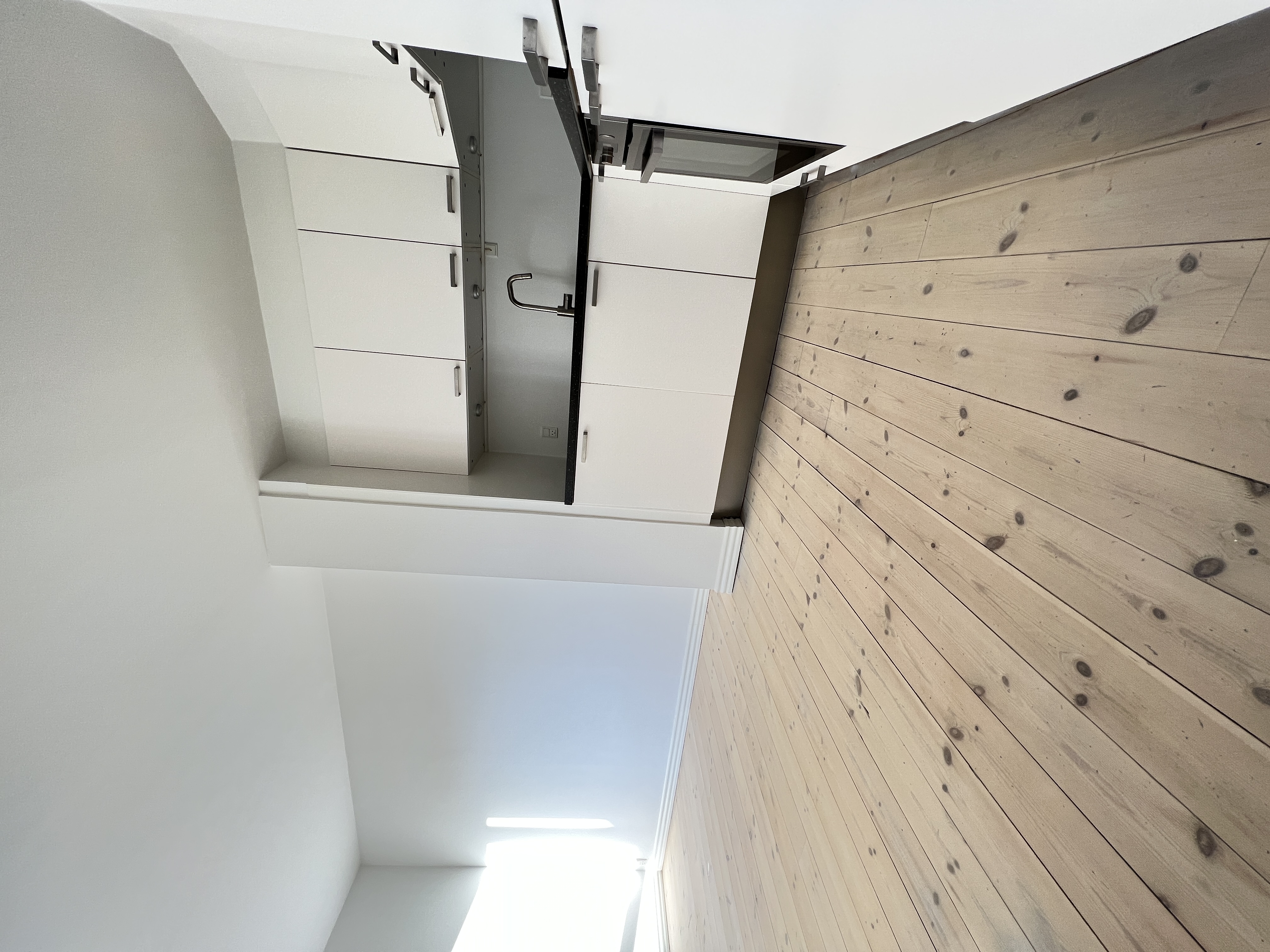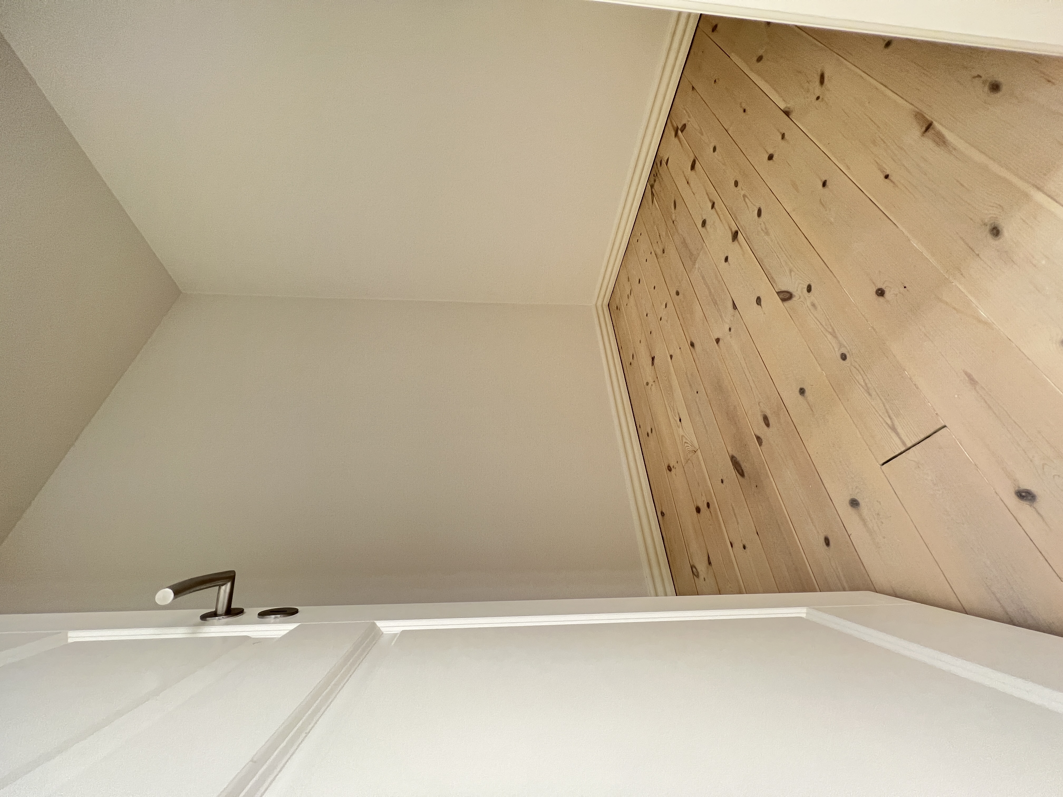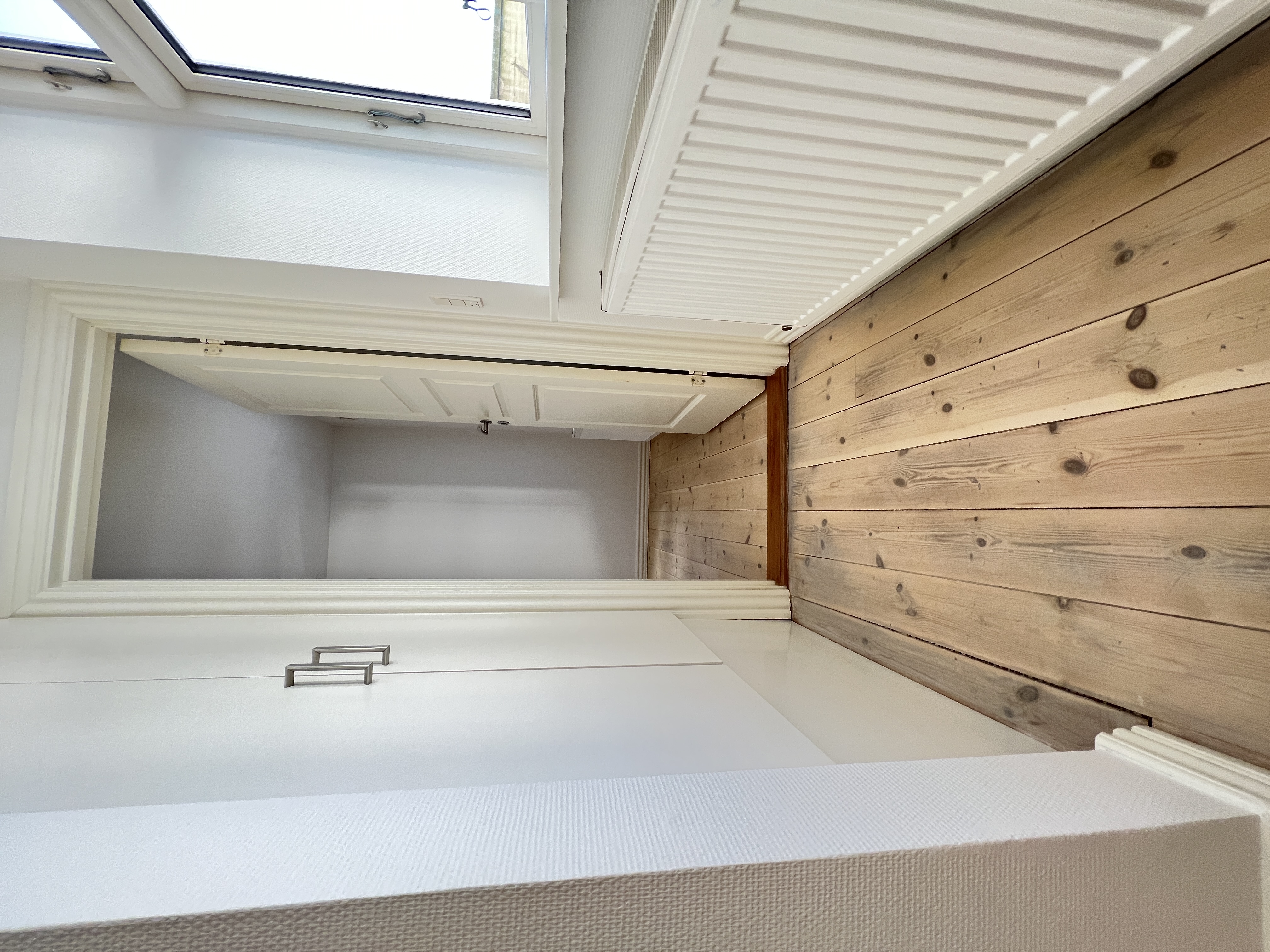 Fortsætter du, kommer du til det lyse køkkenalrum. Køkkenet er i hvide elementer og opvaskemaskine. Her kan du tilgå lejlighedens overdækkede altan. Det er desuden her, du finder det ene værelse.
