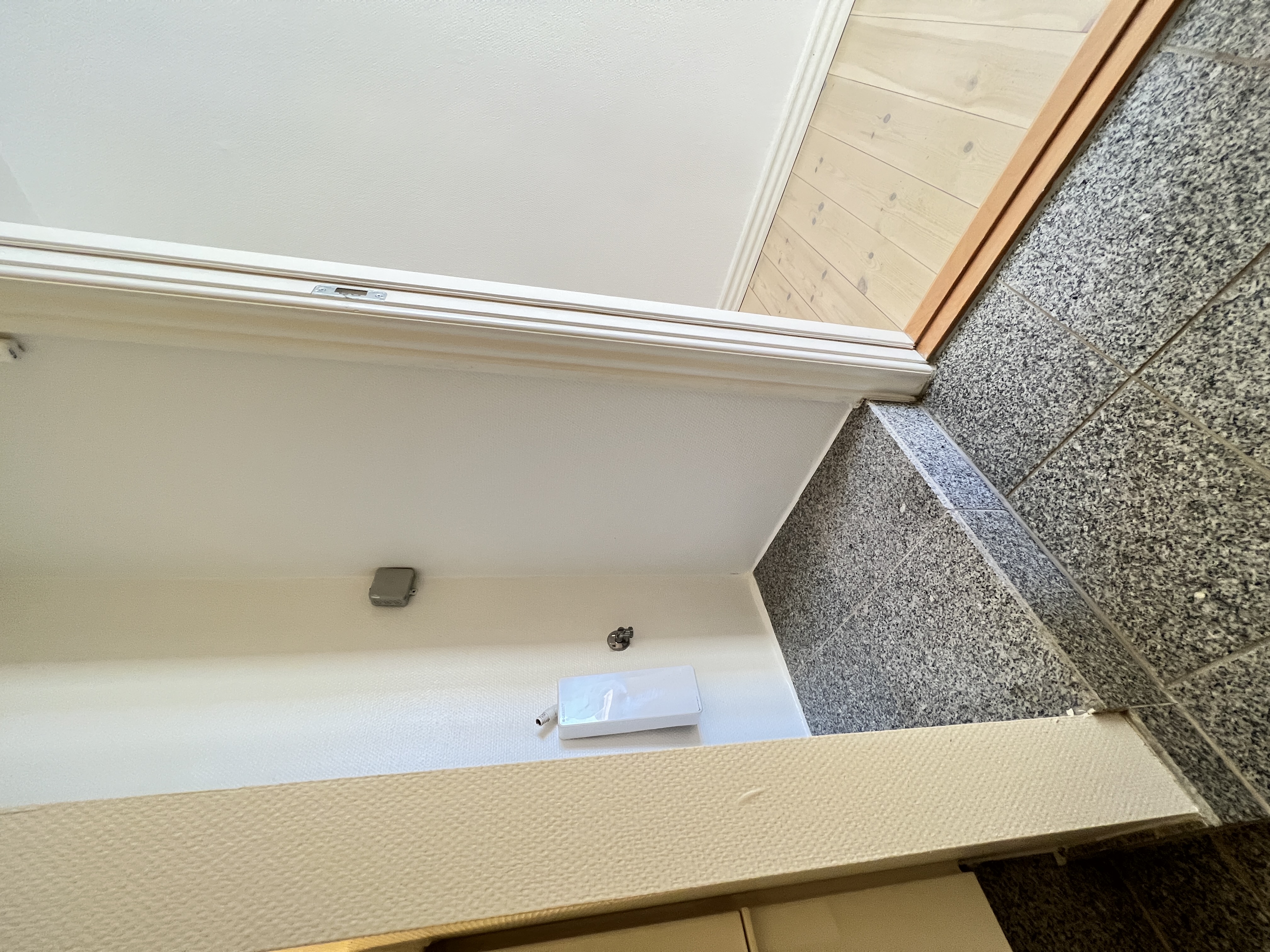 Når du træder ind i lejligheden, befinder du dig i entreen. Herfra kan du tilgå badeværelset, hvor der er plads til opsætning af egen vaskemaskine og tørretumbler. Gulvet er granitklinker.