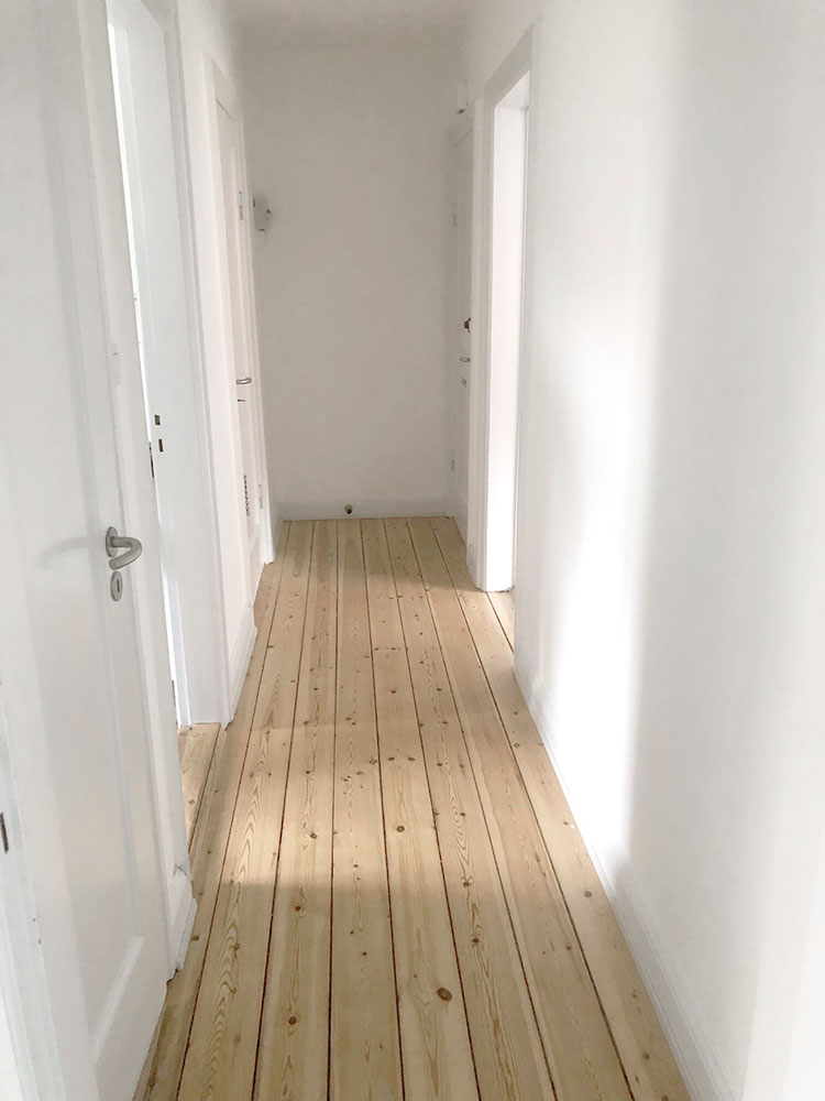 Lejlighedens lange entre grener ud til 4 af lejlighedens 5 rum. Dejlig lille køkken med masser af over- og underskabe, ekstra bordplads, stort vinduesparti som giver udsigt til baggården.