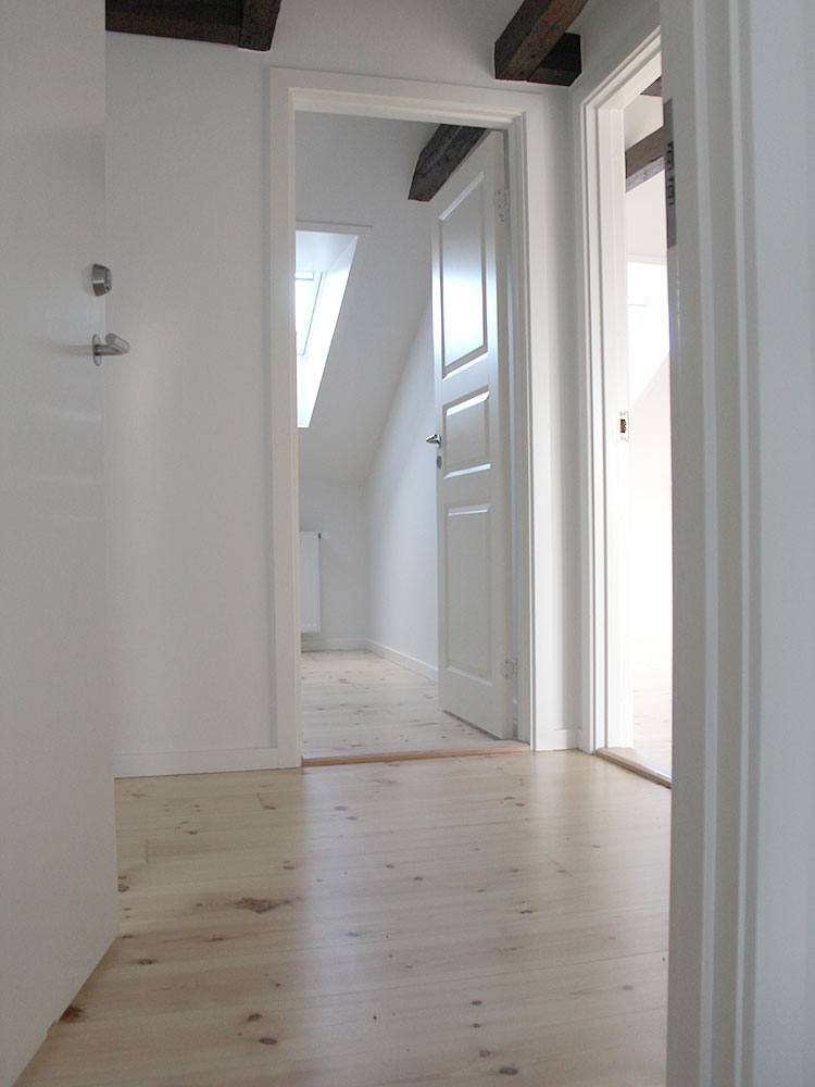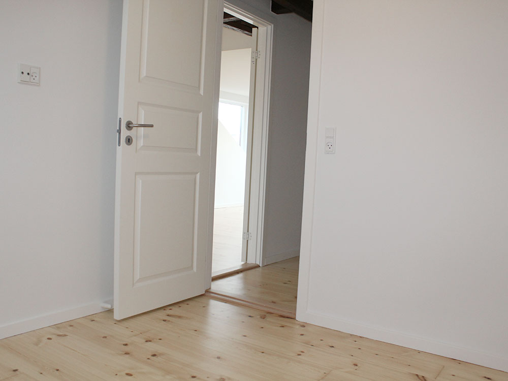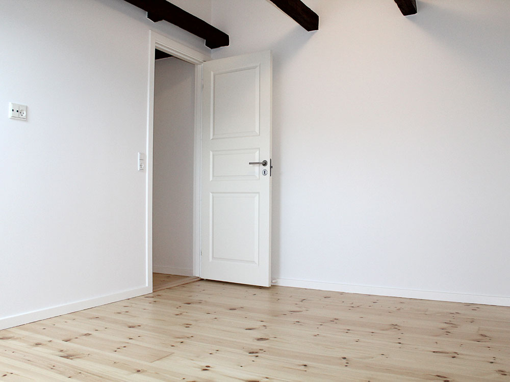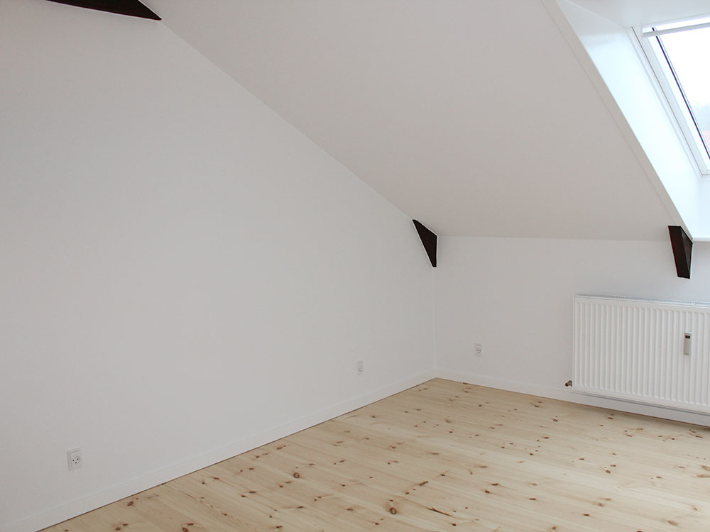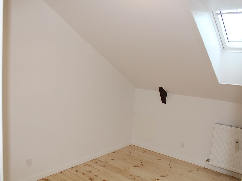 Lejlighedens soveværelse er stort og rummeligt, igen med synlige bjælker, trægulv og en velux ovenlysvindue. Børneværelset/kontor er ligeledes med synlige bjælker, trægulv og velux ovenlysvinduer.