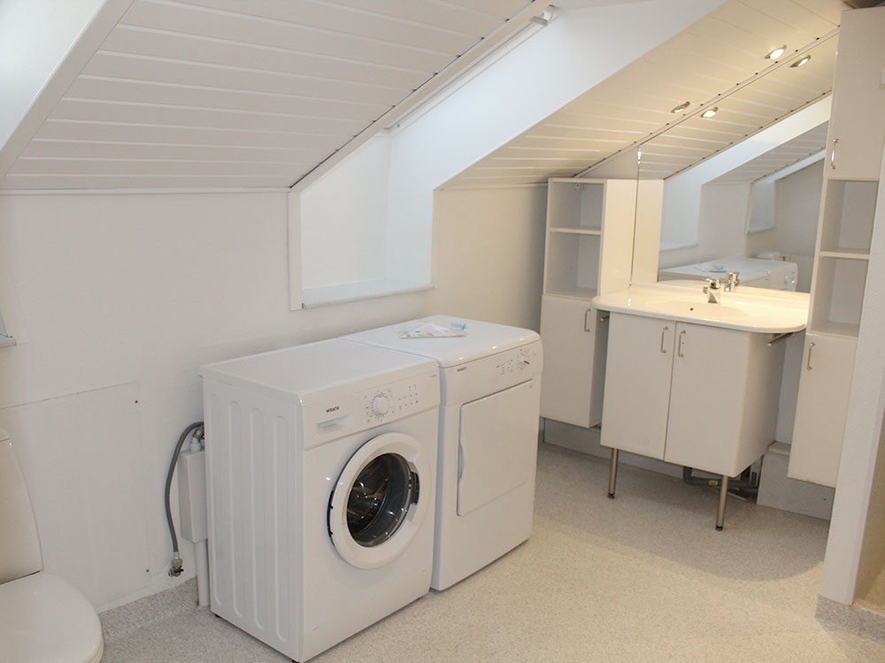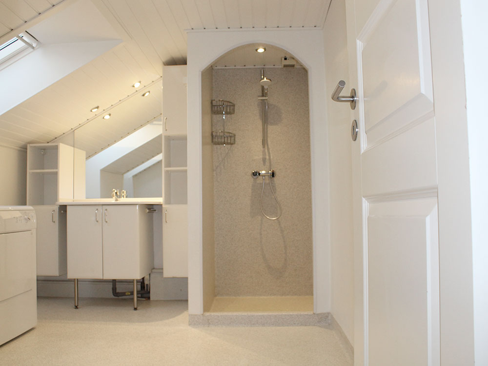 Et stort og rummeligt badeværelse med bruseniche, vaskemaskine og tørretumbler, masser af skabsplads og et par ovenlysvinduer.