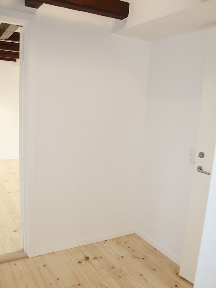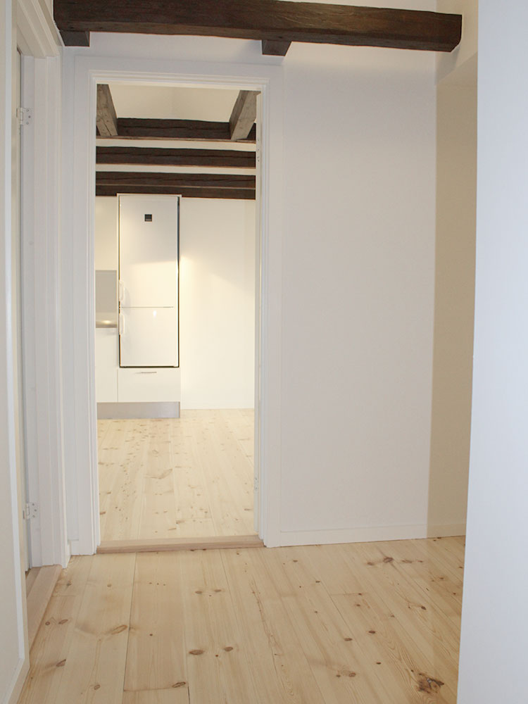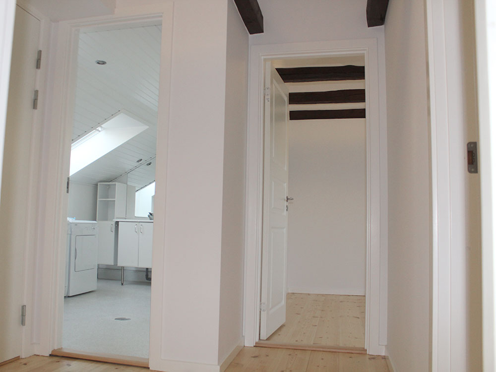 Lejlighedens hyggelige entre grener ud til alle lejlighedens 4 rum, har plads til garderobe, synlige bjælker og lækkert trægulv.