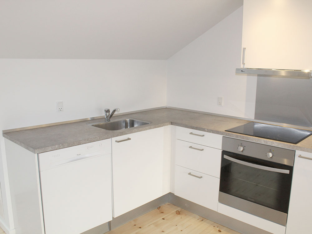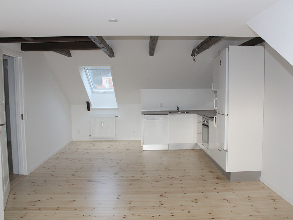 Lejlighedens vinkelkøkken er i åben forbindelse med stuen. Dejlig stort køkken har masser af over- og underskabe samt opvaskemaskine. Der er ydermere plads til et spisebord. Stuen har et stort vinduesparti med adgang til den store terrasse, ligeledes er der trekantede sidevinduer i hver side af kvisten, så man får en god udsigt. Det store vinduesparti giver et super godt lysindfald til både stue og køkken. Køkken og stuen er med synlige bjælker og flot gennemgående trægulv.