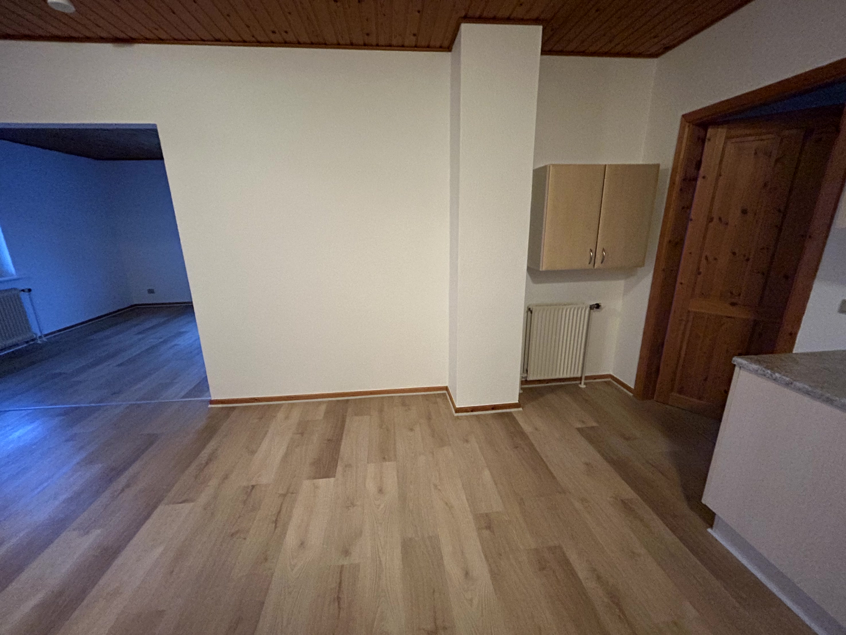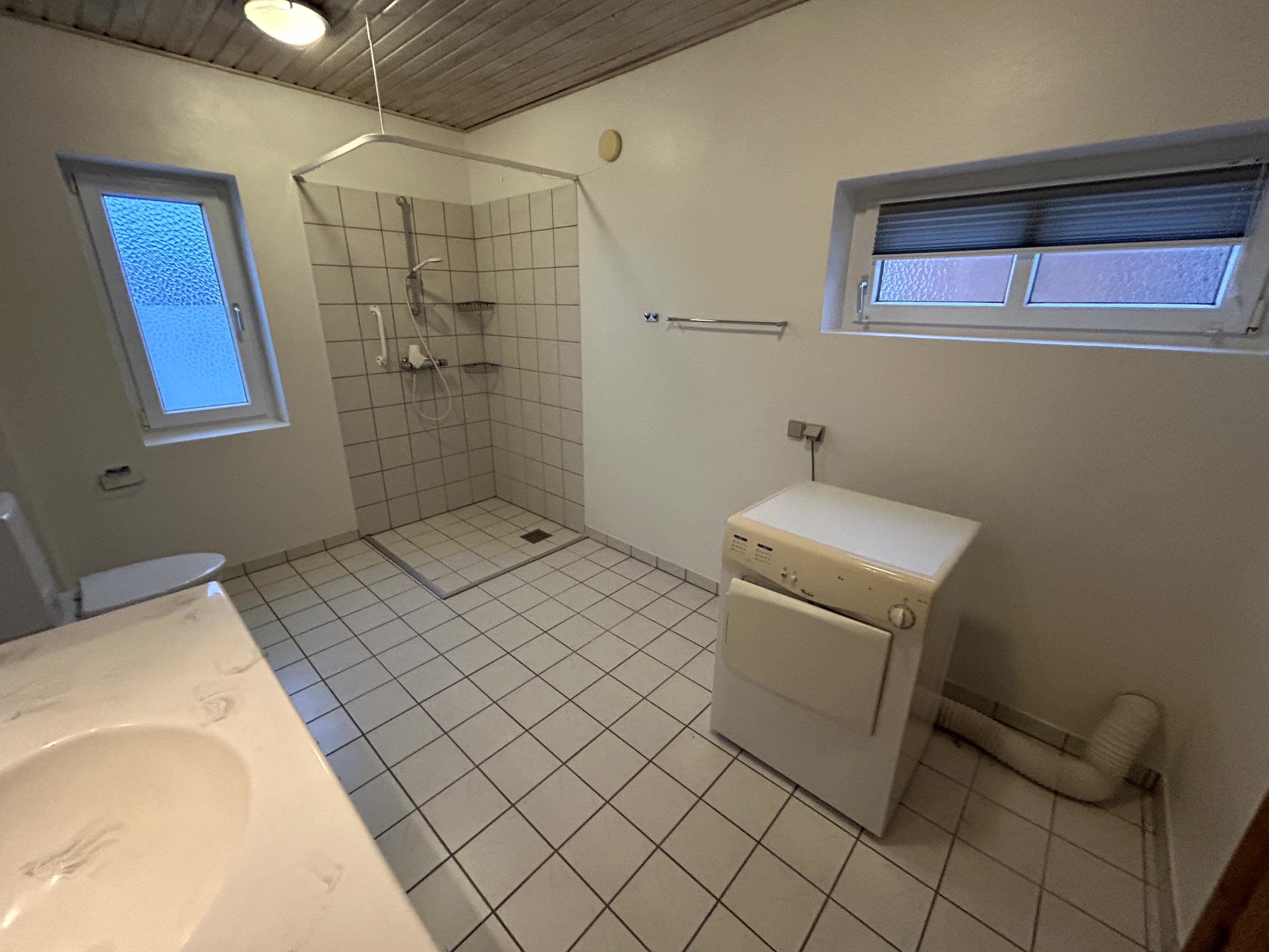 Højt beliggende lejlighed i stueplan. Her er en fornuftig størrelse entré, som leder ind til køkkenet/køkkenalrum. Det store køkken har plads til spiseplads og har direkte forbindelse med stuen. Fra køkkenet kan man tilgå et stort soveværelse med gulvtæppe og herfra videre til et stort lyst badeværelse, med gulvvarme. Der er plads til både vaskemaskine og tørretumbler i badeværelset. Stuen/køkken har fået nyt gulv.