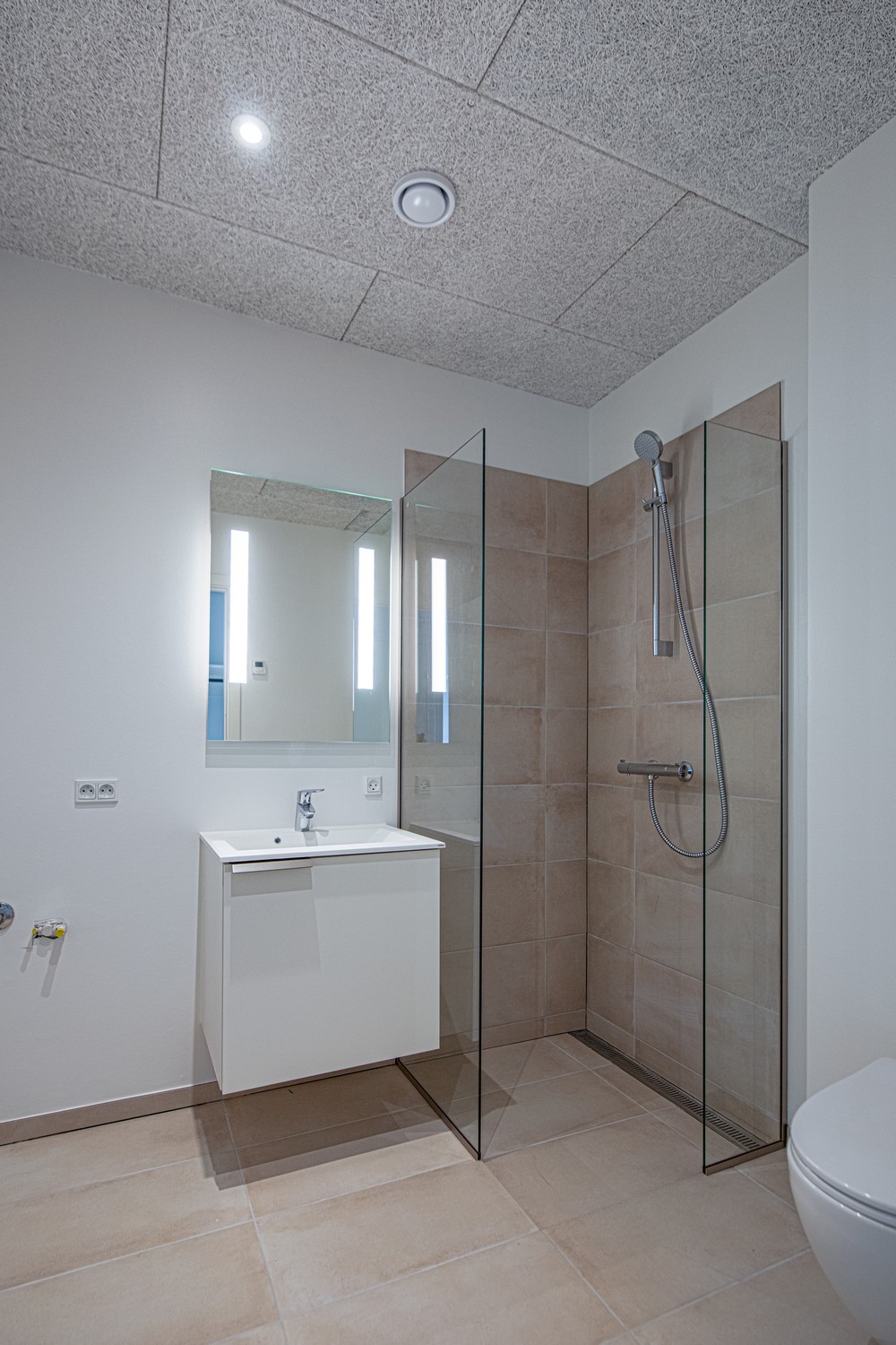 Lejlighedens badeværelse ligger ligeledes i forbindelse med entréen. Badeværelset er elegant indrettet med et skabsarrangement og vask i kunstmarmor samt et oplyst spejl (Svane). Bruseområdet er udstyret med linjeafløb og brusevinge i klart glas, som sikrer et moderne udtryk.