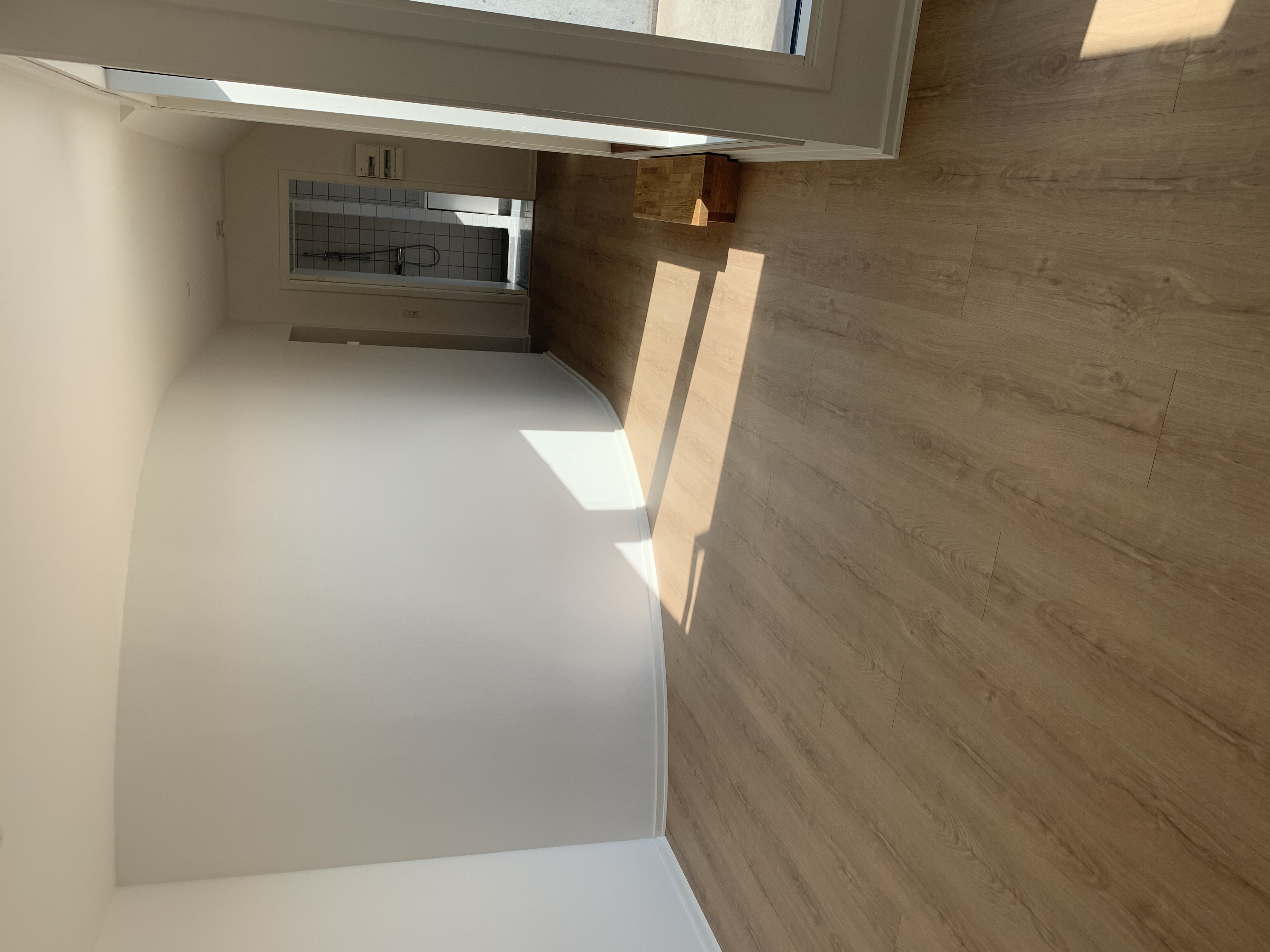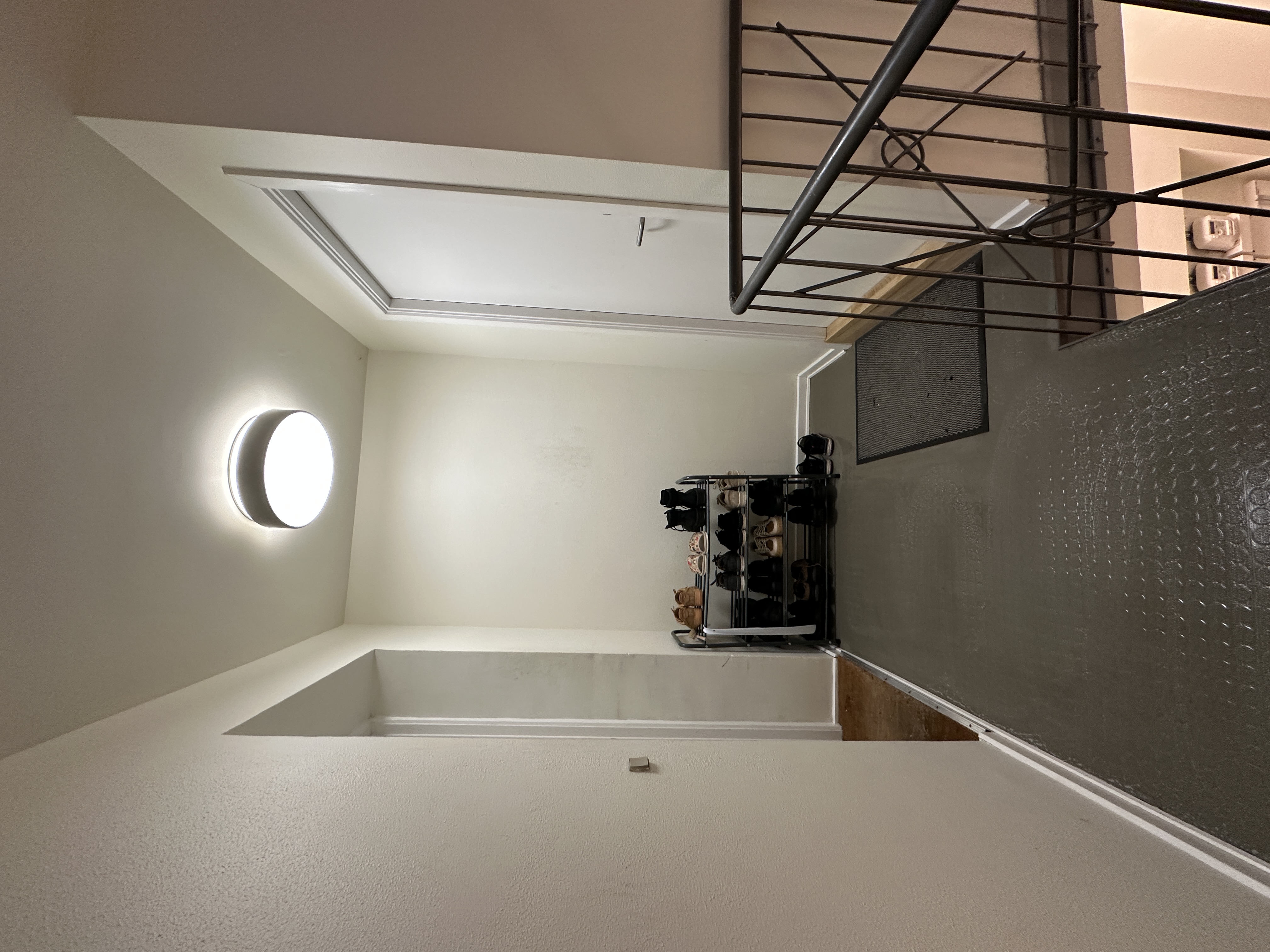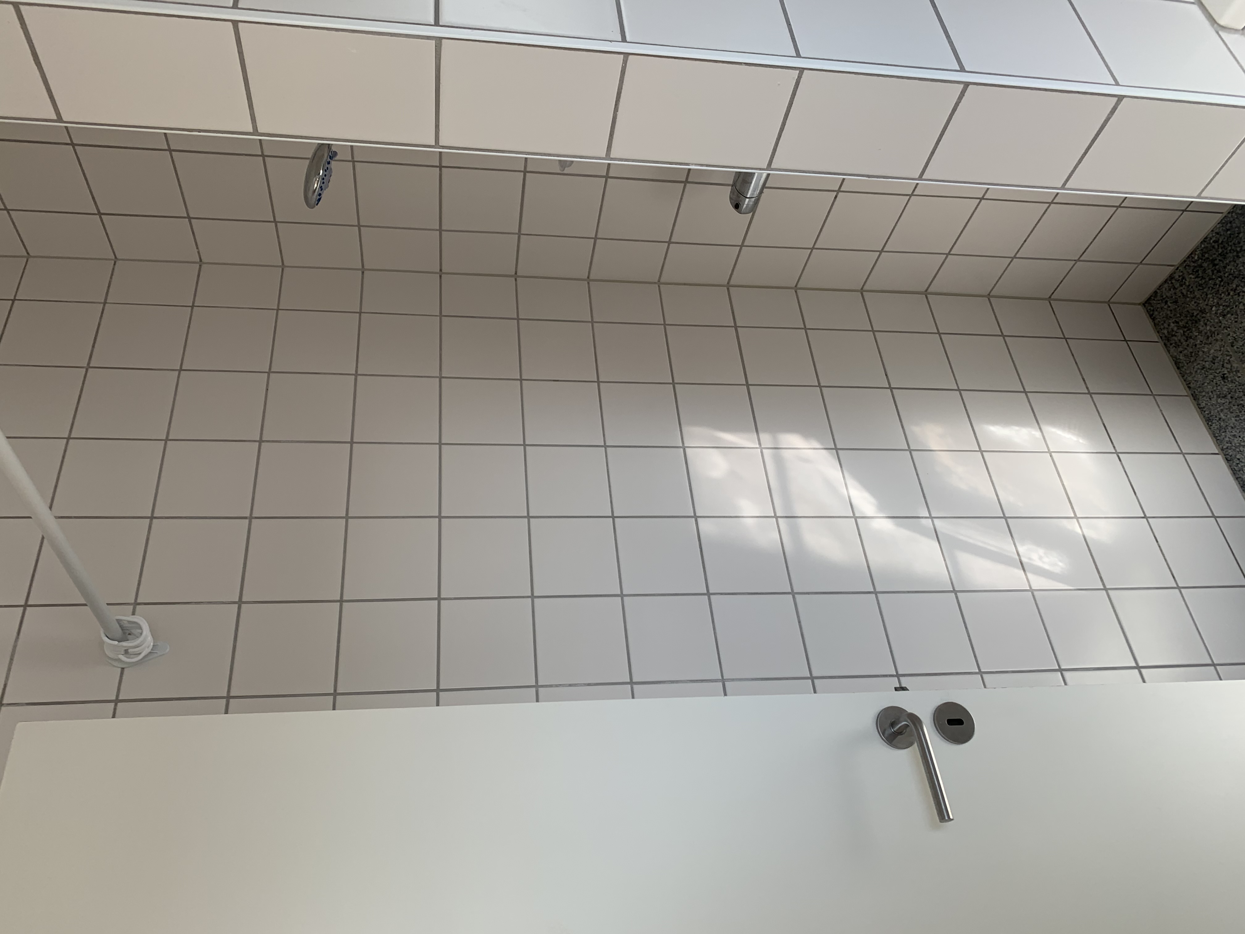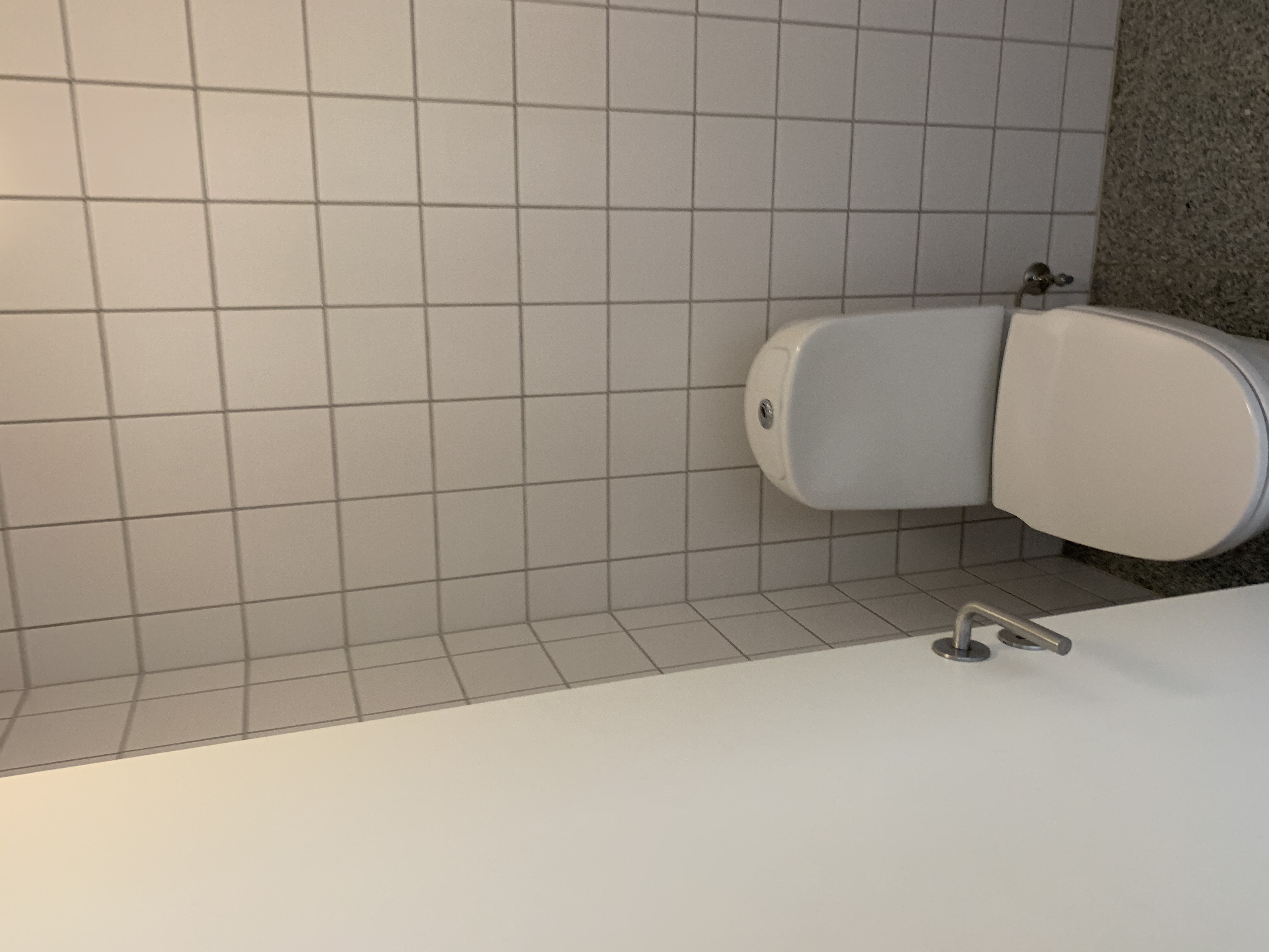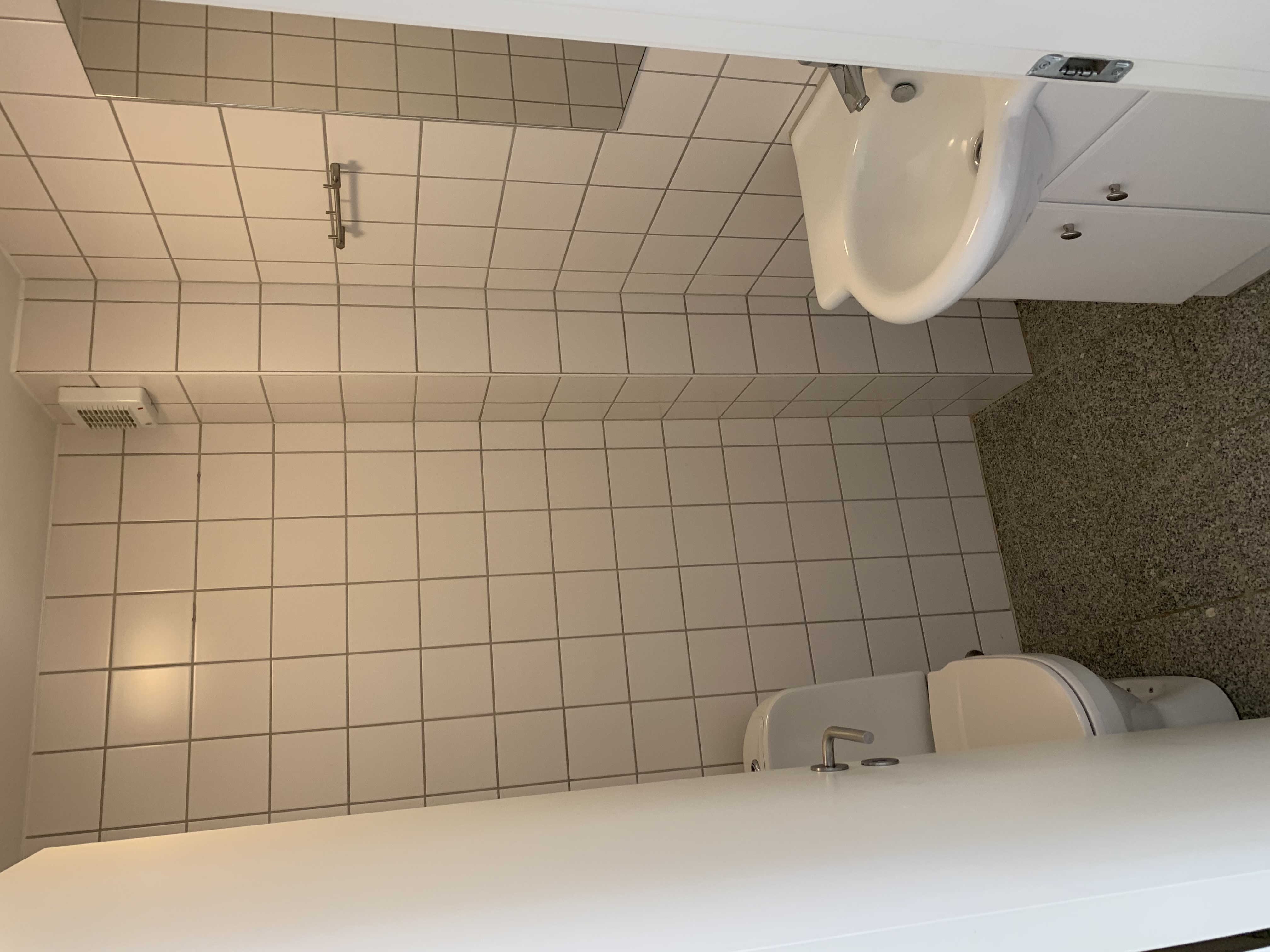 Til venstre for entreen, er lejemålets toilet. Badeværelset er nemlig opdelt i to rum. Fortsætter man ind i stuen, finder man på højre hånd det rummelige badeværelse, hvor der er plads til opsæt af egen vaske/tørremaskine.