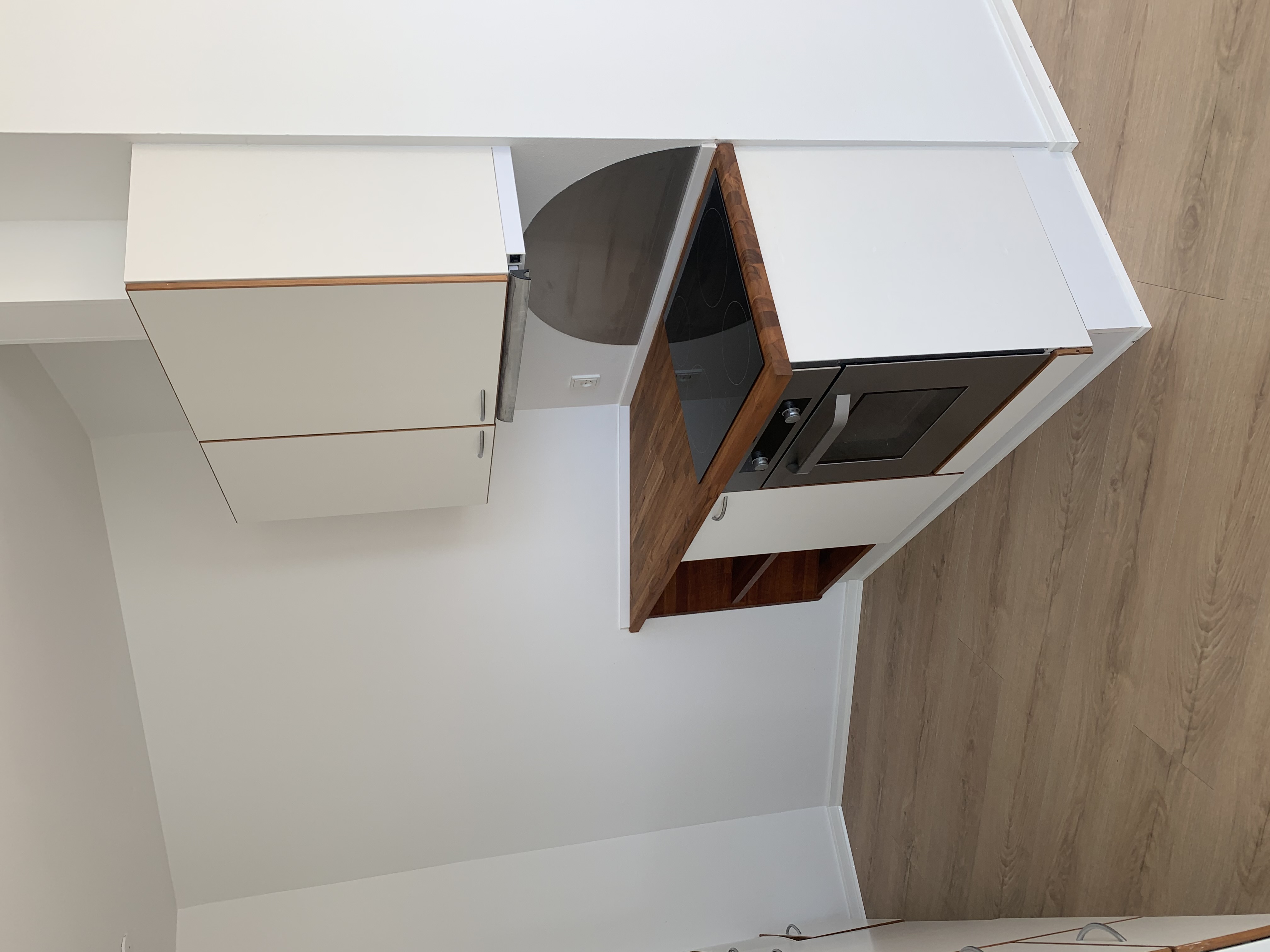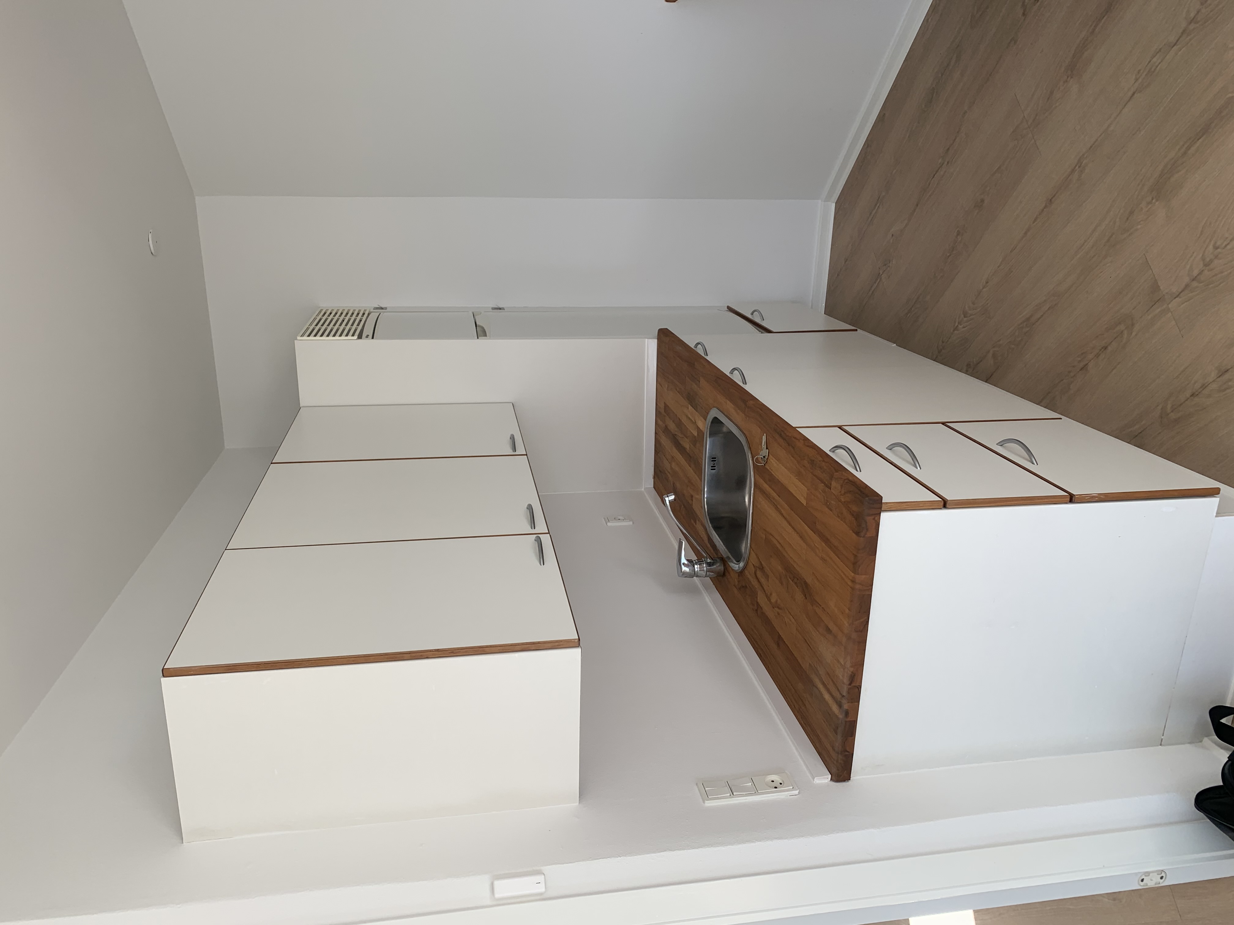 Fra den lyse stue kan man tilgå terrassen samt det charmerende køkken, med smukke mørke træbordplader. Der er desuden indbygget opvaskemaskine.