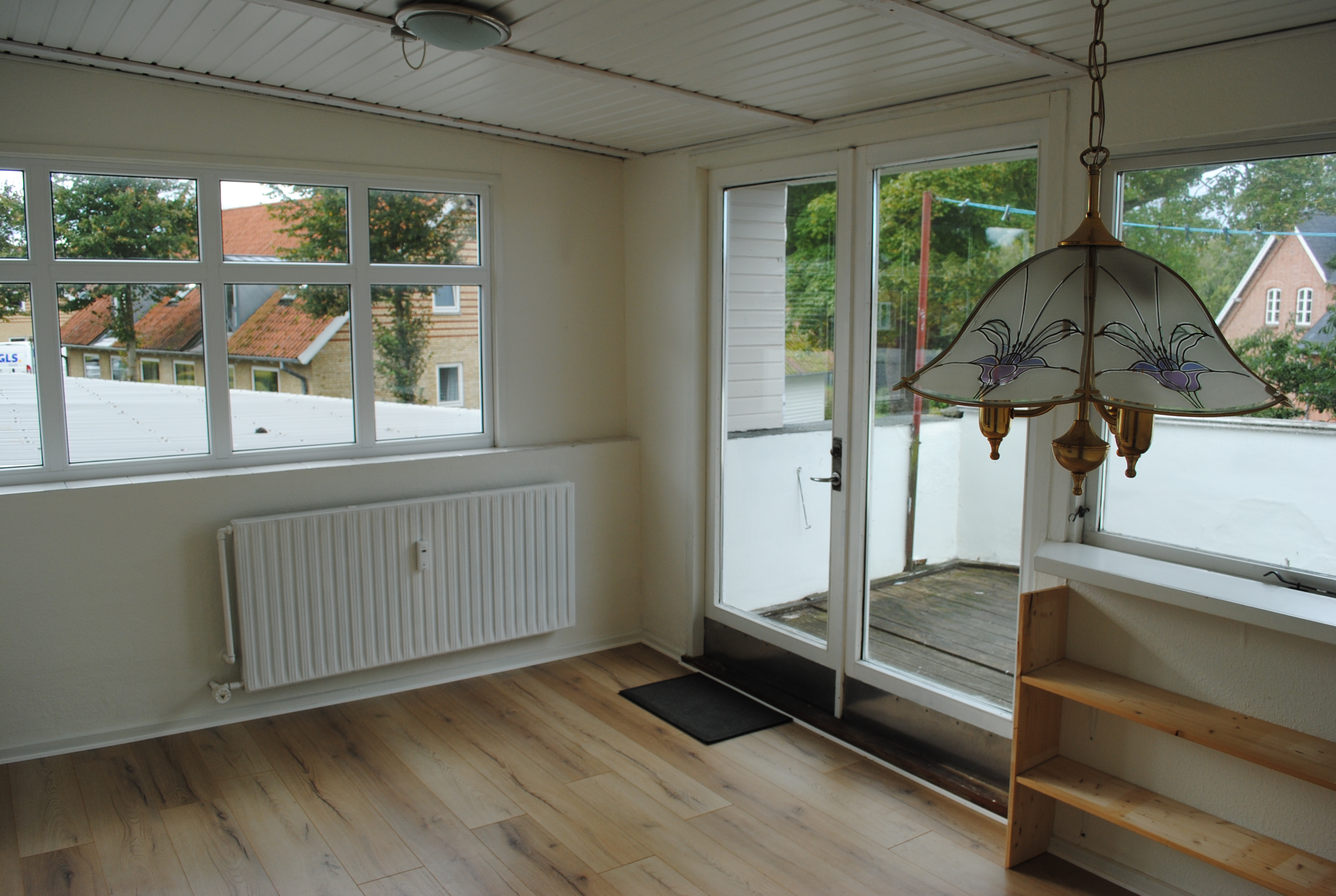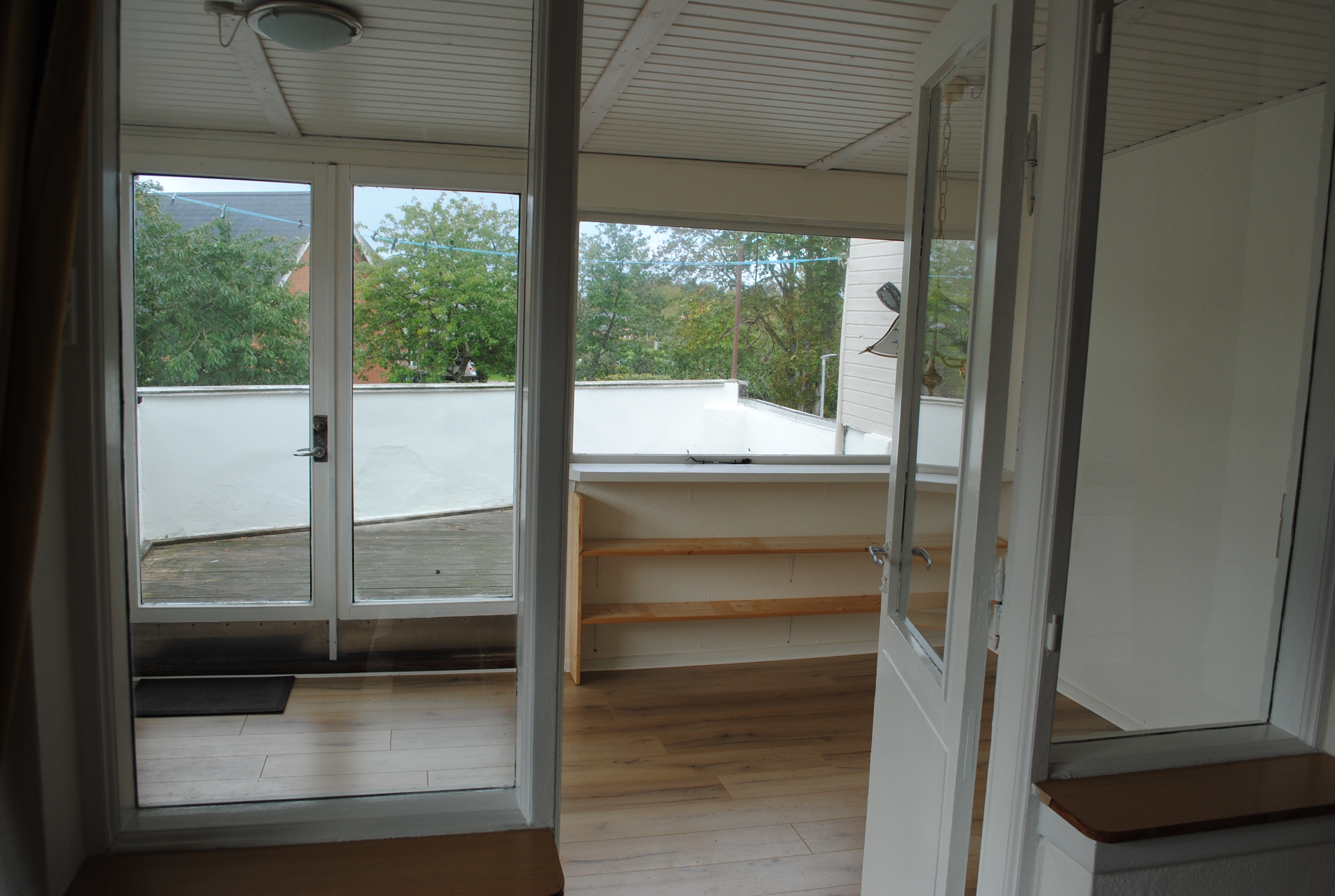 Lejlighed på 1. sal: 90 m2 og 15 m2 opvarmet udestue og altan.