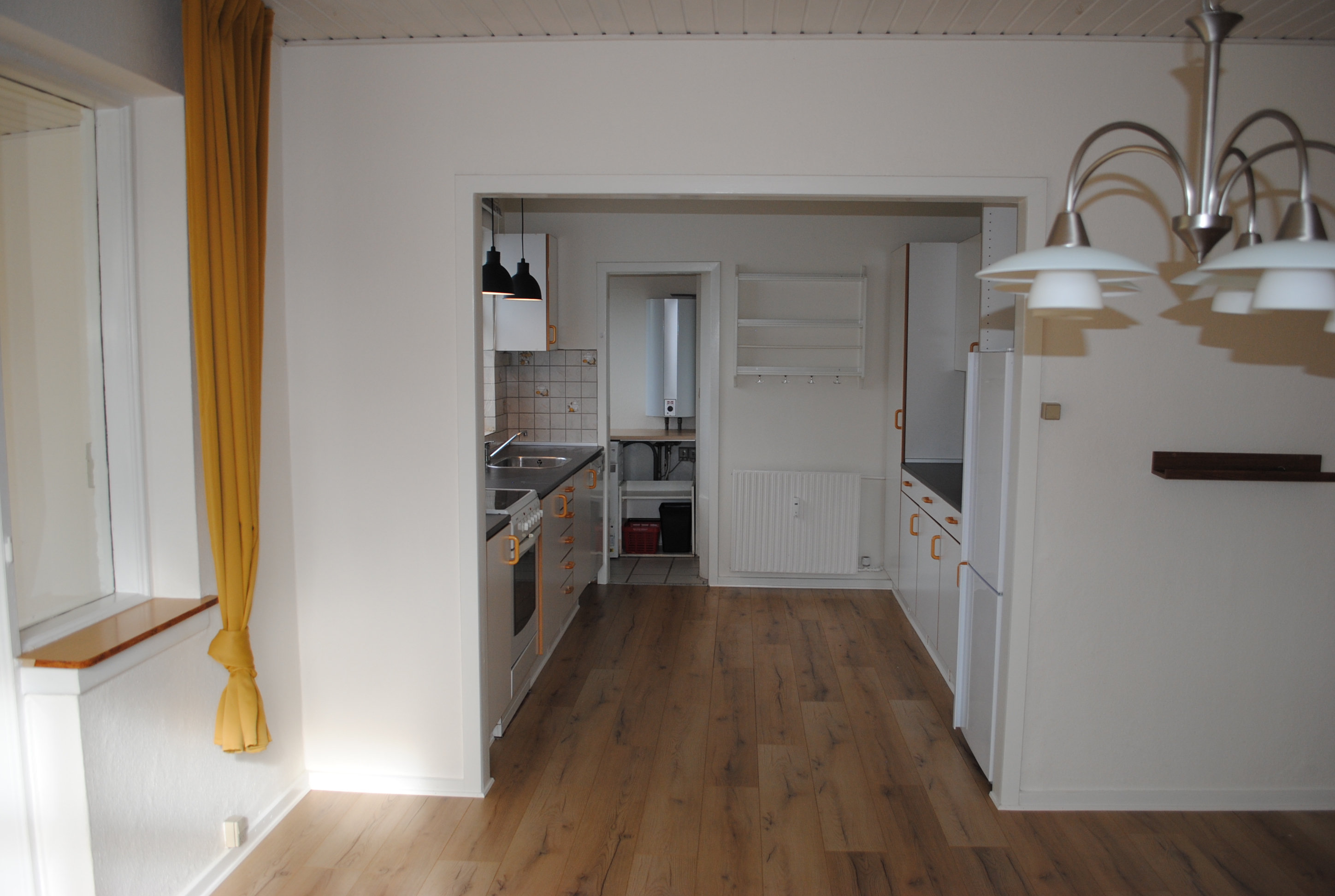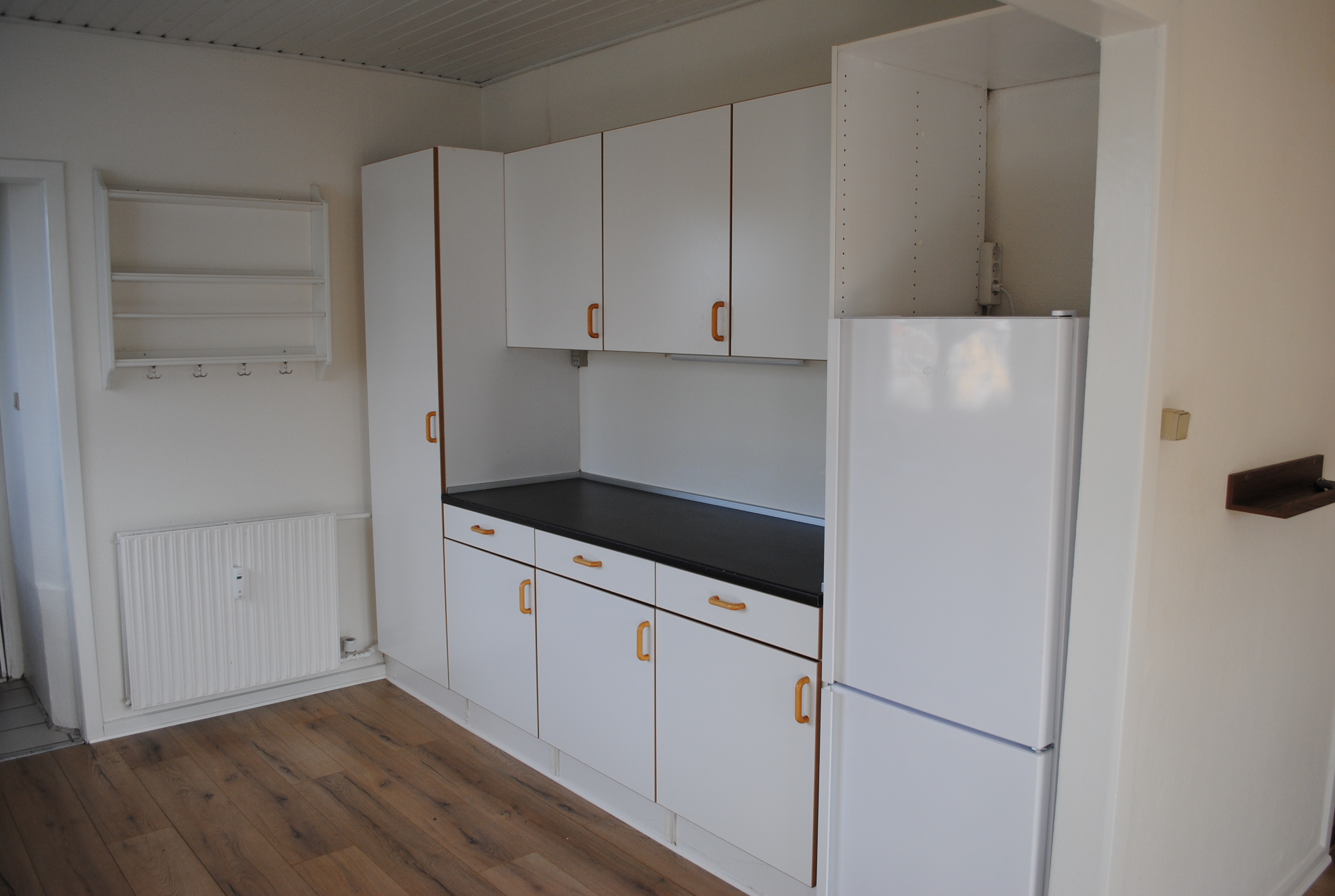 Indretning: Entré, spisestue med åbnet køkken og udgang til bryggers, udestue og altan, opholdsstue, soveværelse og lille badeværelse.