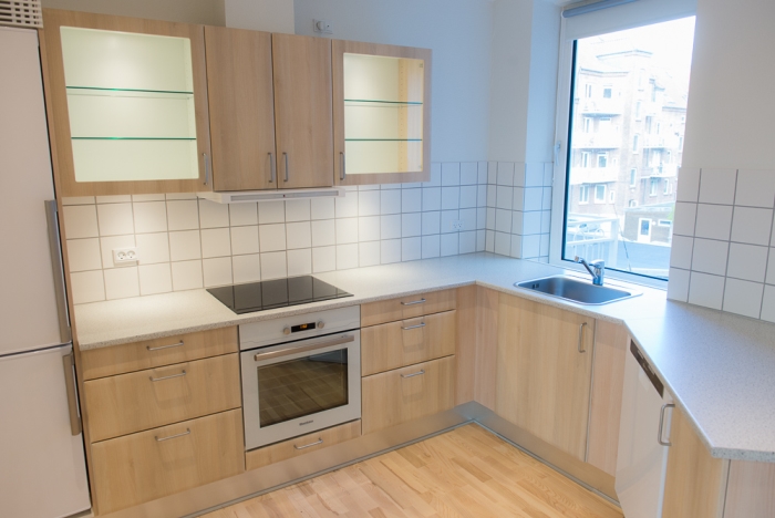 Totalt moderniseret lejlighed, nyere køkken med nyere hårde hvidevare (keramisk kogeplade, indbygningsovn, emhætte, køle/fryse skab, opvaskemaskine), nyere flisebadeværelse med bruseniche og væghængt toilet, nyere indvendige døre og yderdør.
