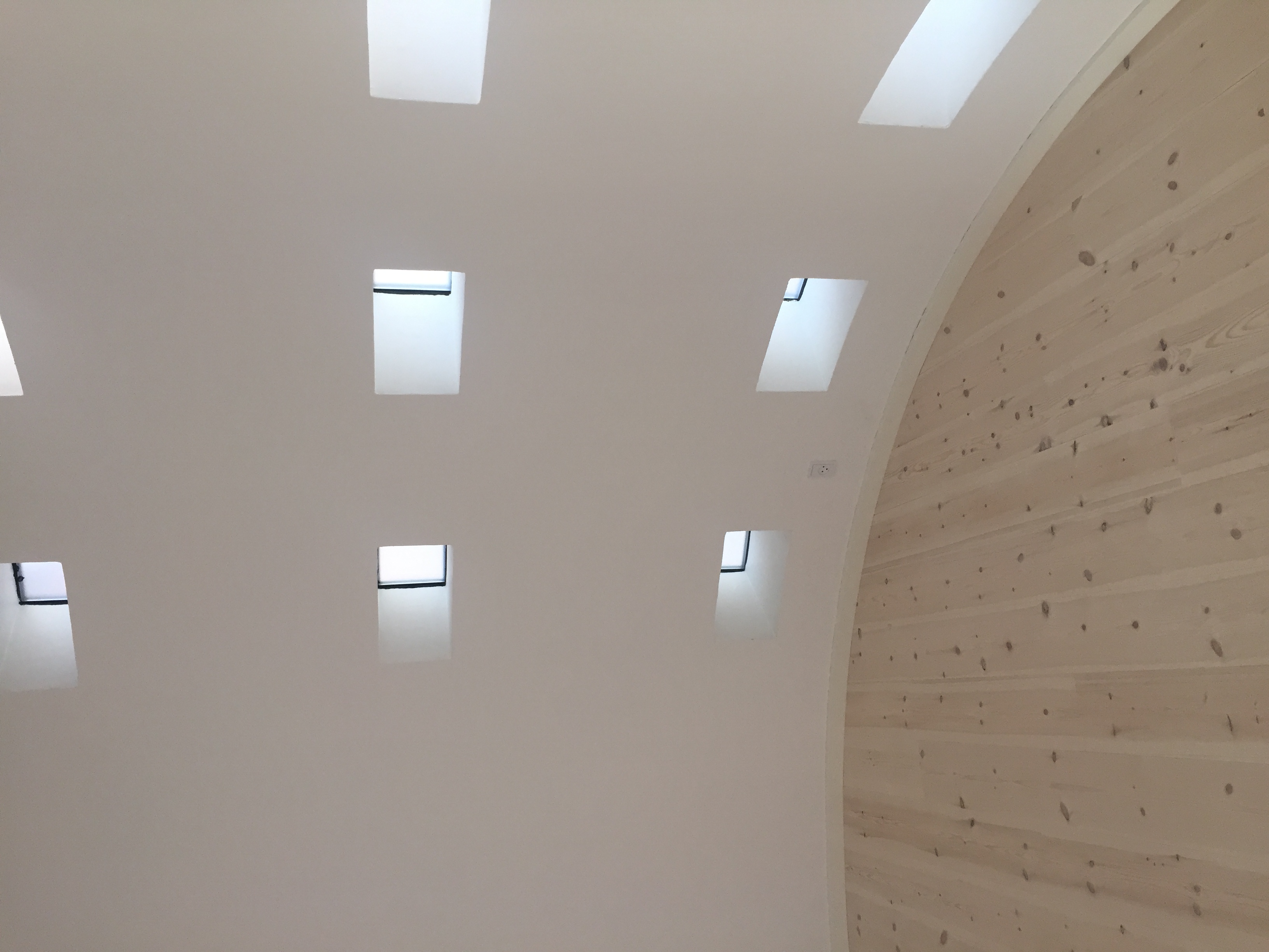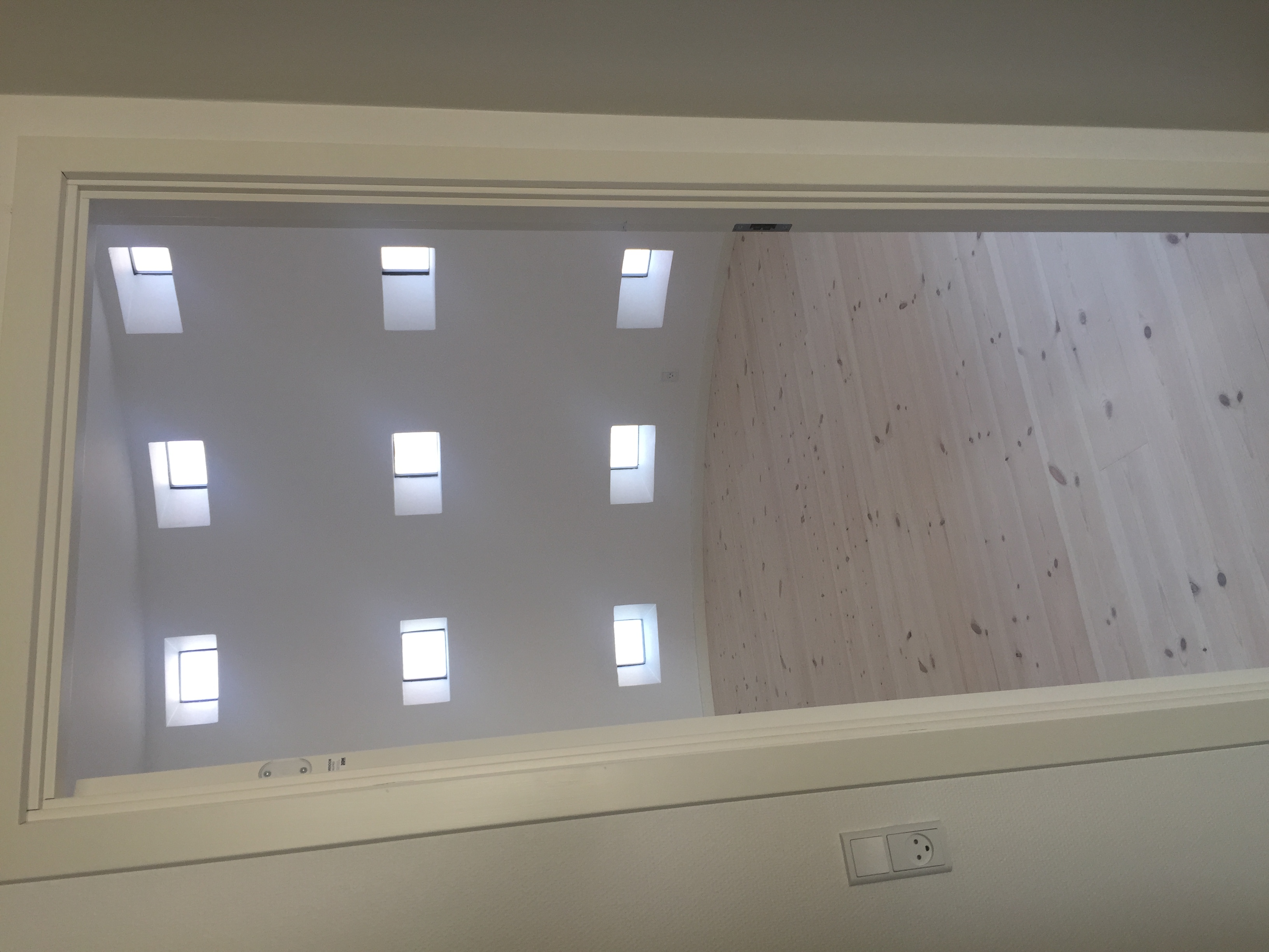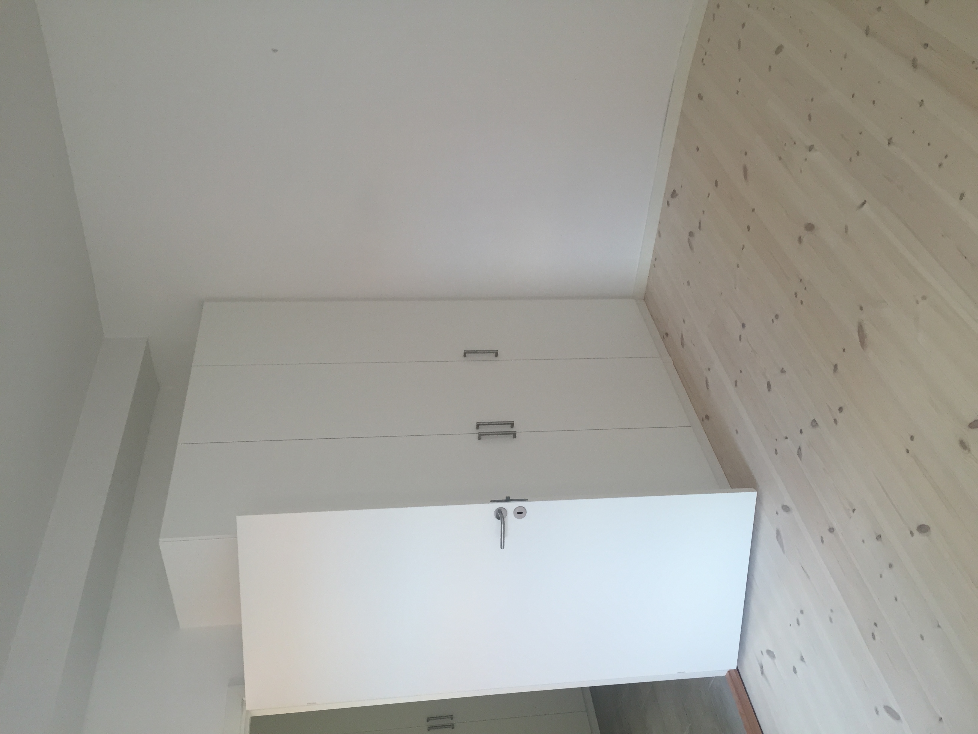 Skønt værelse med buet væg og flot lys indfald, fra de små vinduer. Soveværelset har også faste skabe.