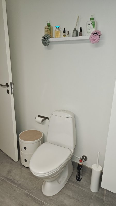 Plads til opstilling af egen vaskemaskine og kondenstørretumbler på det skønne store badeværelse.