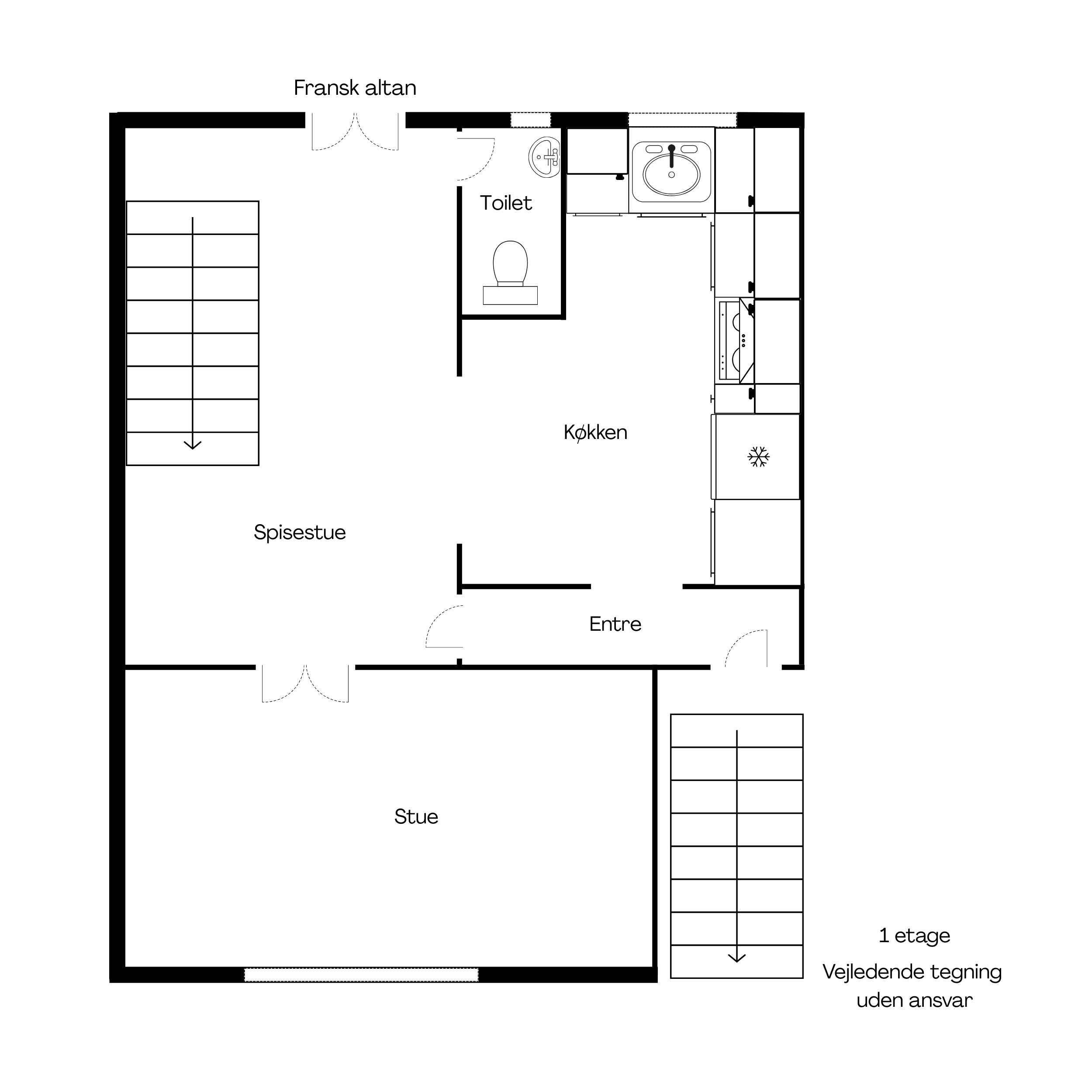 Stuen er stor og lys med et flot vinduesparti som giver et godt lysindfald og en fantastisk udsigt ud mod Føtex og den gamle mølle, gæstetoilet fuldender etagen og giver ekstra bekvemmelighed i hverdagen.